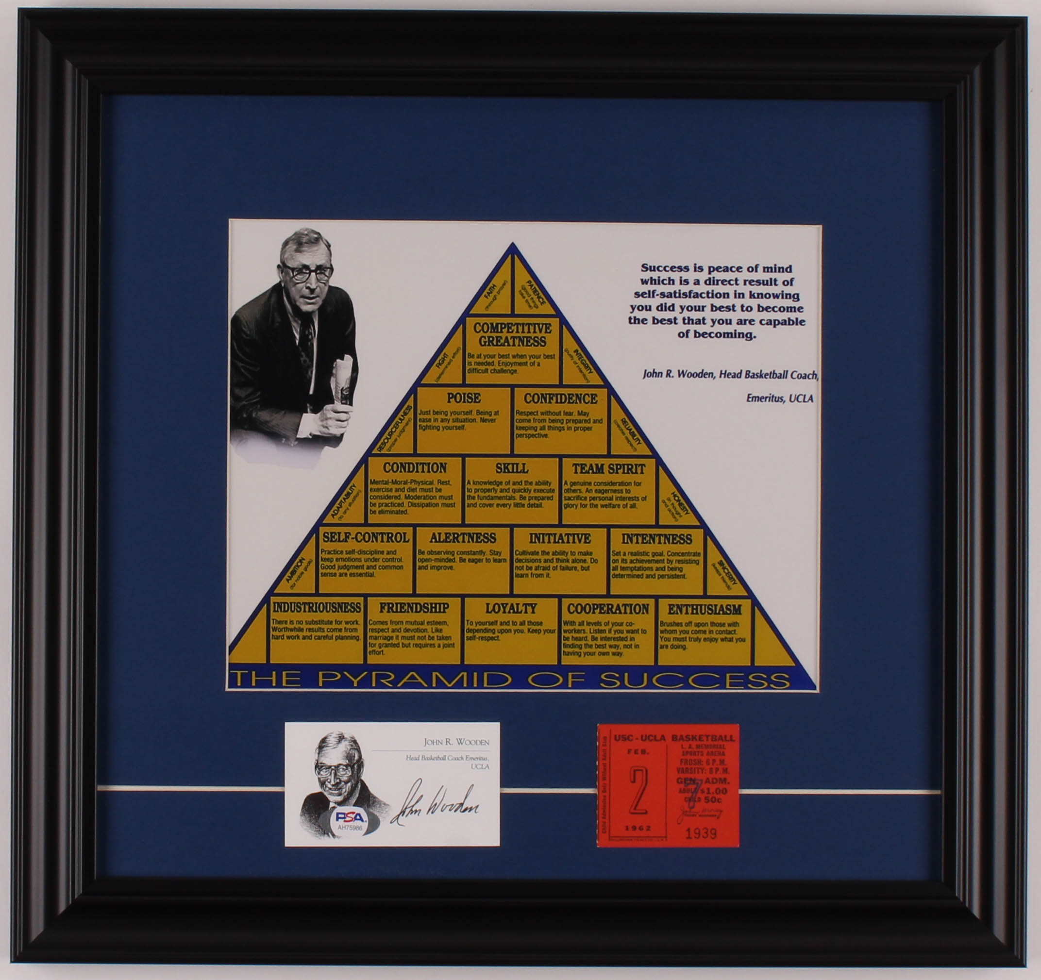 John Wooden Signed "The Pyramid of Success" 15.5x16.5 Custom Framed Card Display with 1967 UCLA vs. USC Basketball Ticket (PSA COA)