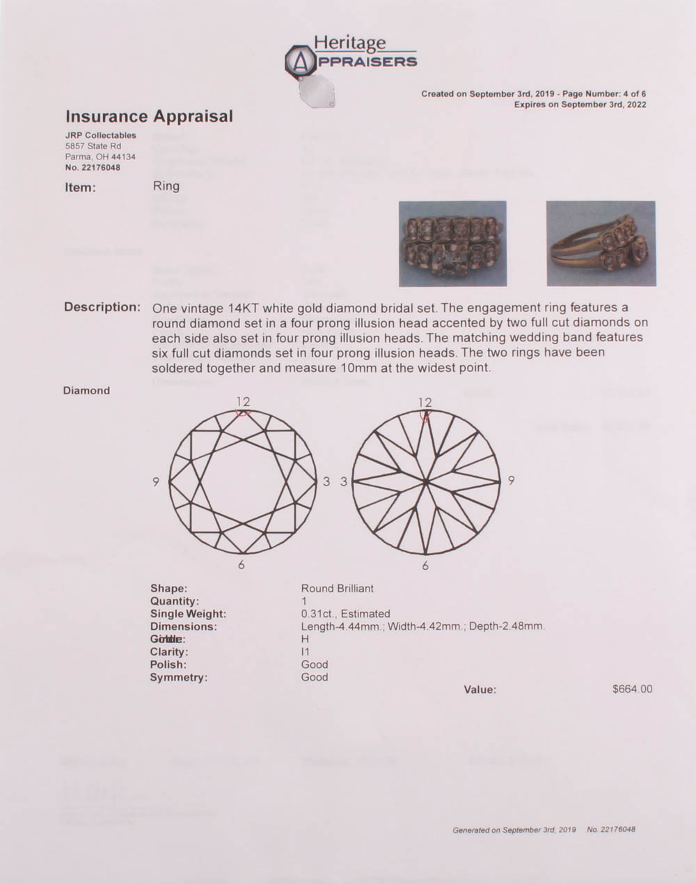 Vintage 14Kt White Gold & Diamond Bridal Set features a round diamond set in a four prong illusion head accented by (2) two full-cut diamonds on each side also set in four prong illusion heads. The matching wedding band features (6) full-cut diamonds in four prong illusion heads. The two rings have been soldered together.