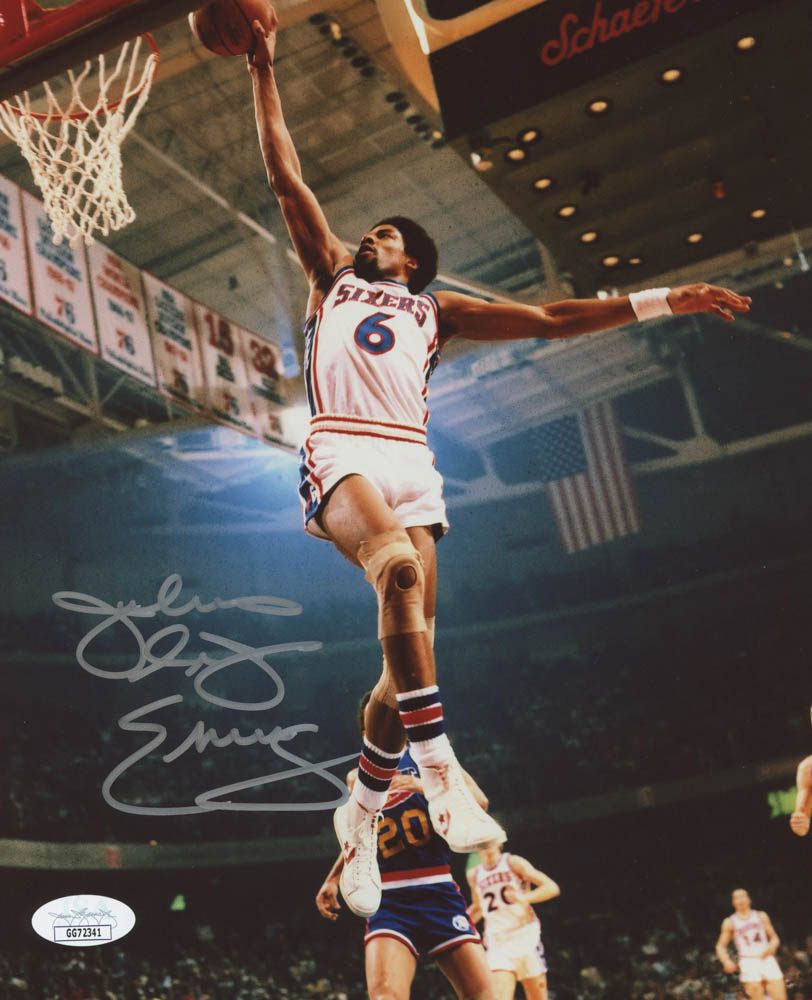 Photo measures 8" x 10" in size and has been hand signed in silver paint pen by Julius Erving (Philadelphia 76ers, HOF).
