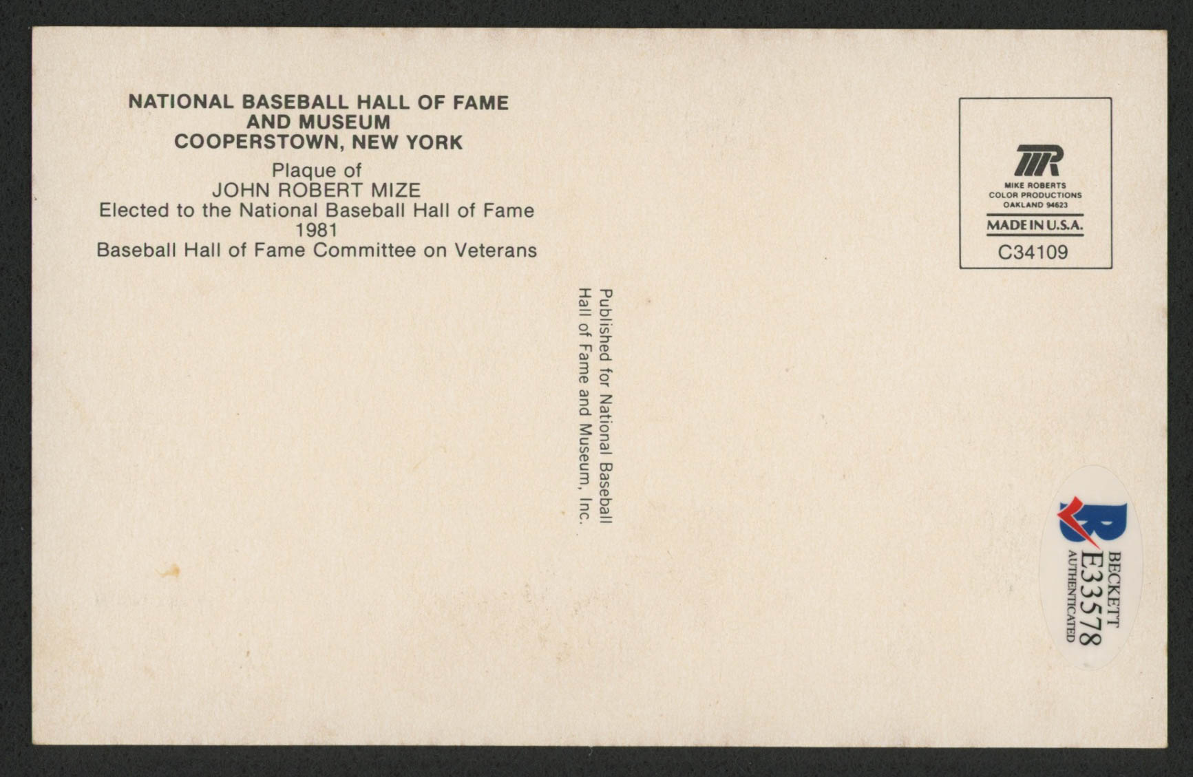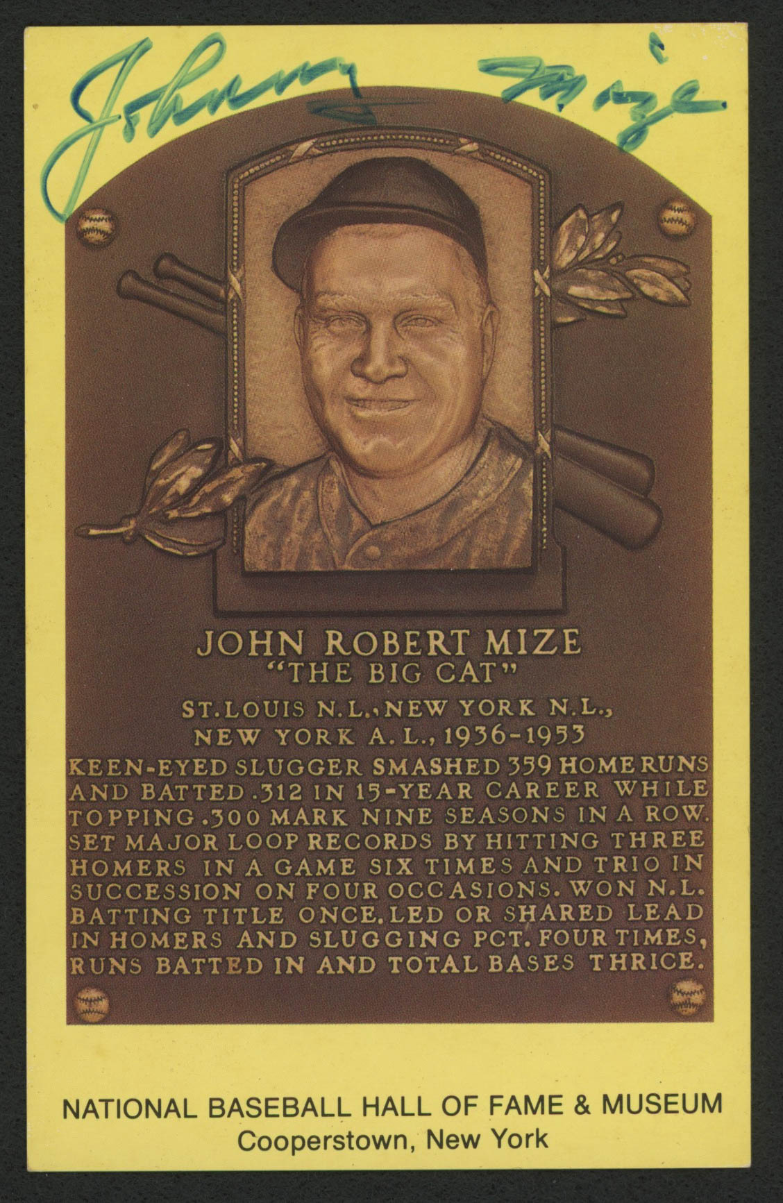 Johnny Mize Signed Gold Hall of Fame Plaque Postcard (Beckett COA)