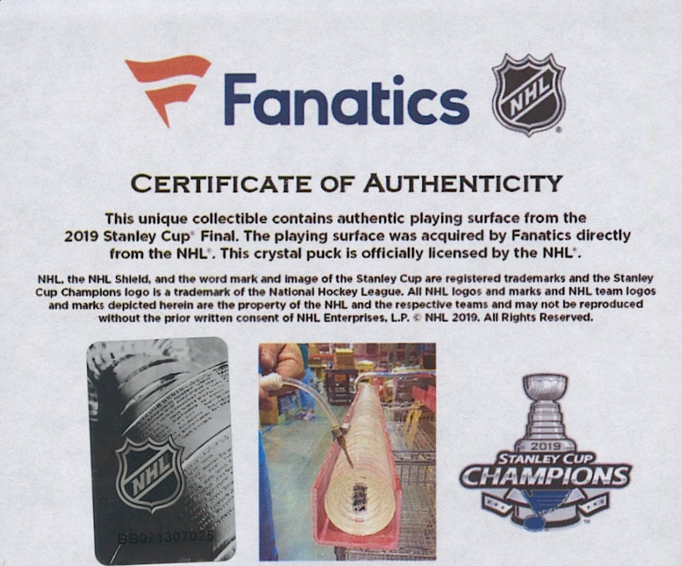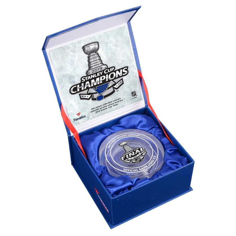 Commemorate the 2019 Stanley Cup Finals with this crystal puck. Each puck comes filled with melted game-used ice from the 2019 Stanley Cup Finals and shipped in a Fanatics Authentic gift box.