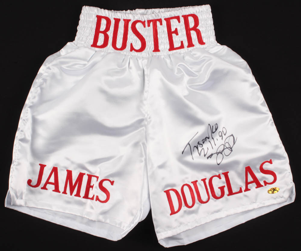 Custom boxing shorts have been hand-signed and inscribed in black felt-tip pen by James "Buster" Douglas.