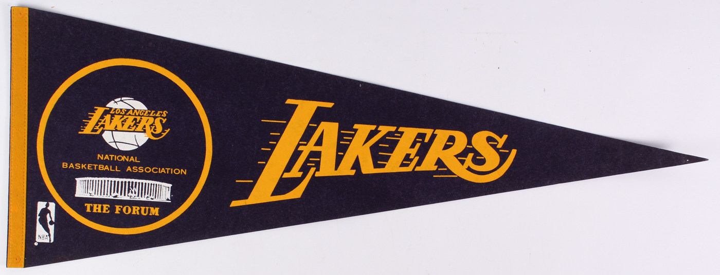 1970 Los Angeles Lakers The Forum Logo Pennant. The pennant flag measures approximately 30" long. Please see photos for more details regarding the condition pennant.