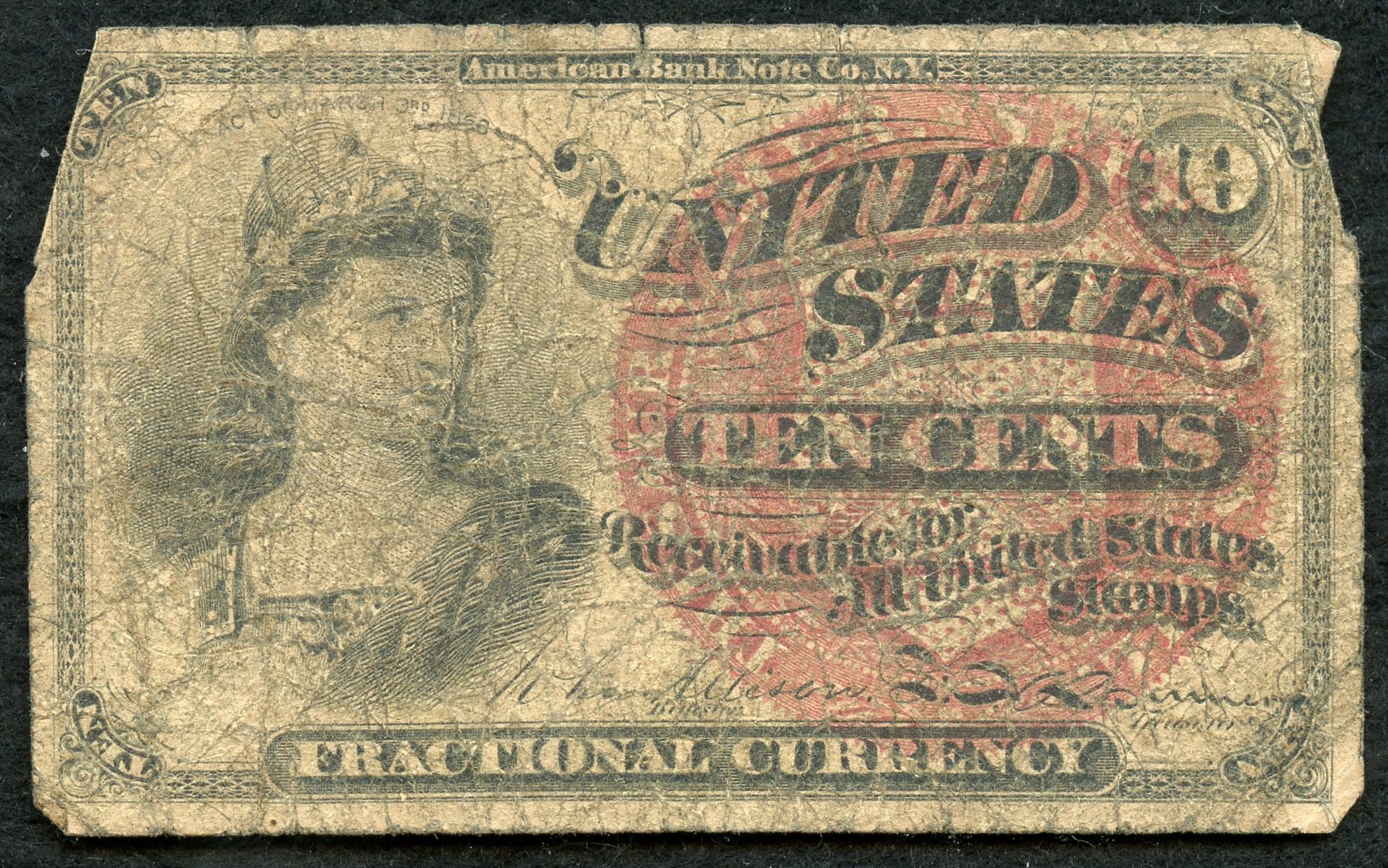 1863 United States Civil War 10 Ten Cent Fractional Currency Banknote Bill (4th Issue)