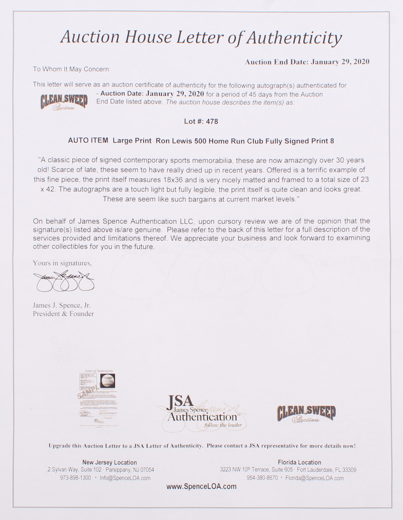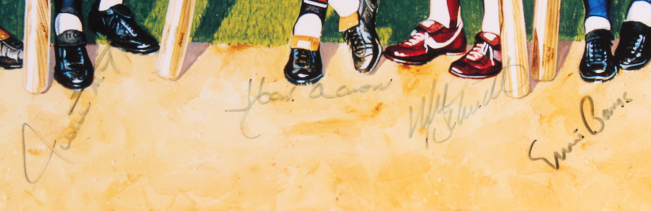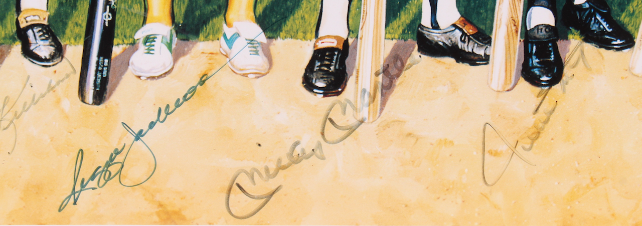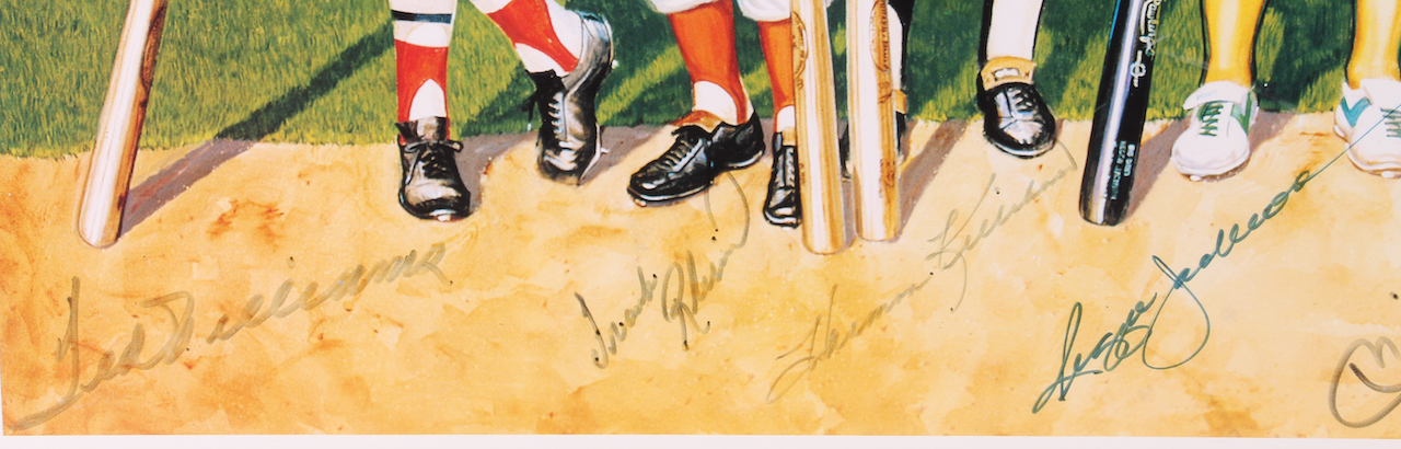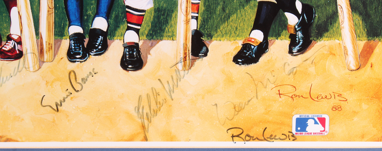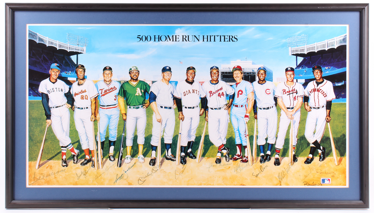 Custom frame measures 23.5" x 41.5" in size and features a print that has been hand-signed in felt-tip pen by Mickey Mantle, Ted Williams, Frank Robinson, Willie Mays, Hank Aaron, Harmon Killebrew, Reggie Jackson, Mike Schmidt, Ernie Banks, Eddie Mathews and Willie McCovey.