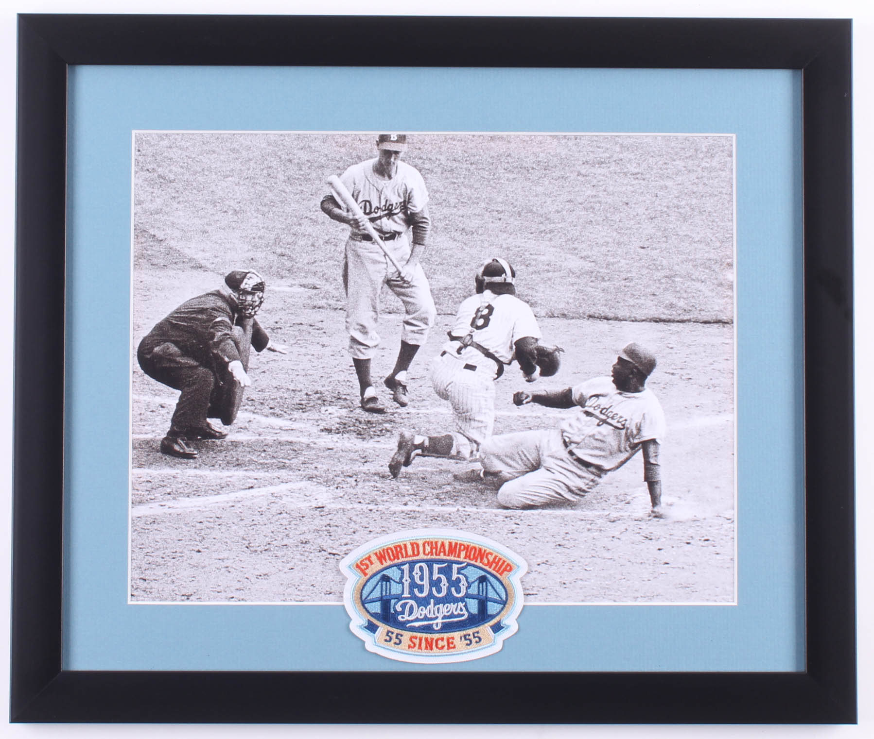 Custom frame measures 16" x 19" in size and features a photo of Jackie Robinson (D. 1972, Brooklyn Dodgers, HOF). Display also features a 1955 World Series patch.