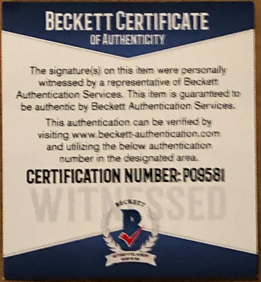 The lot / autograph(s) includes an official Beckett Authentication Services serially-numbered hologram and matching COA for authenticity purposes. The signing of this item was witnessed by Beckett.