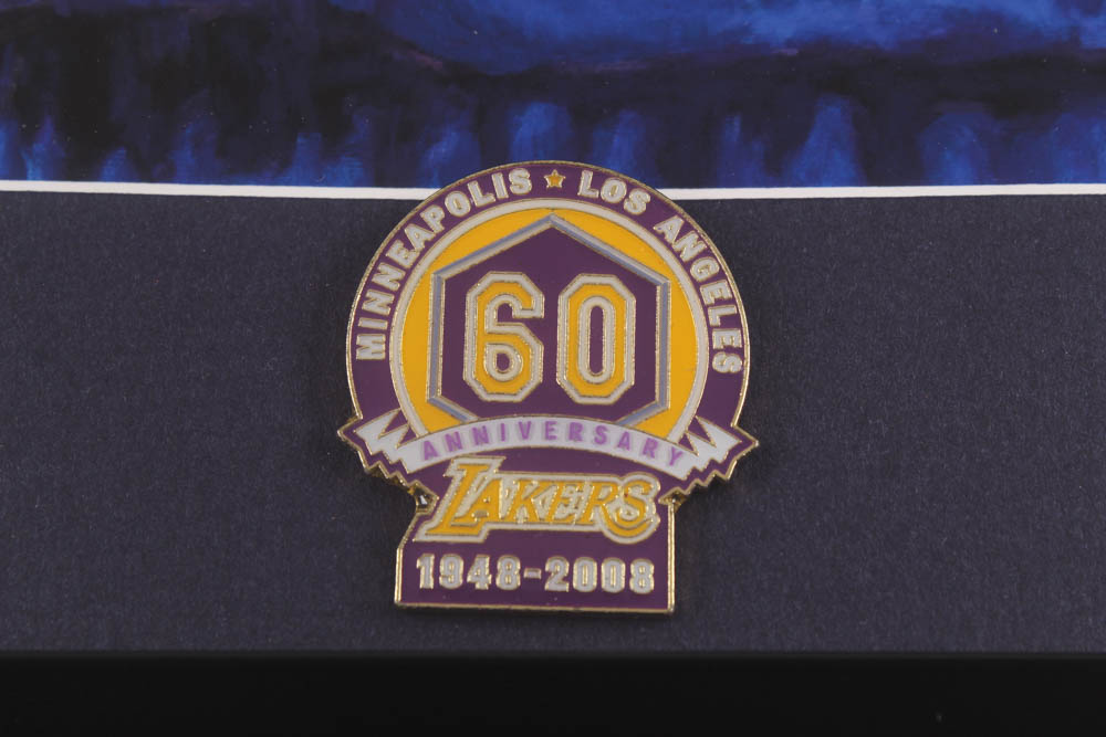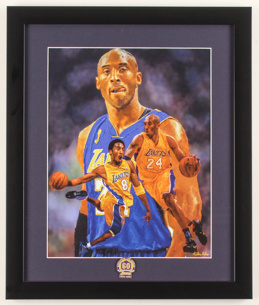 Custom frame measures 16" x 19" in size and features a print of Kobe Bryant (D. 2020, Los Angeles Lakers, HOF). Display also features a Los Angeles Lakers 60 year anniversary pin.