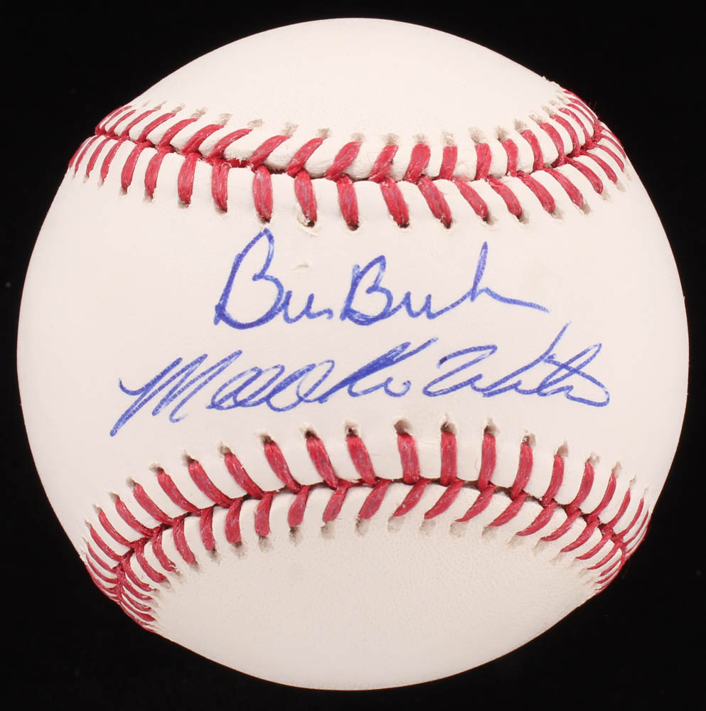 Rawlings Official Major League Baseball. Hand-signed in blue ink pen by Mookie Wilson (New York Mets) and Bill Buckner (D. 2019, Boston Red Sox).