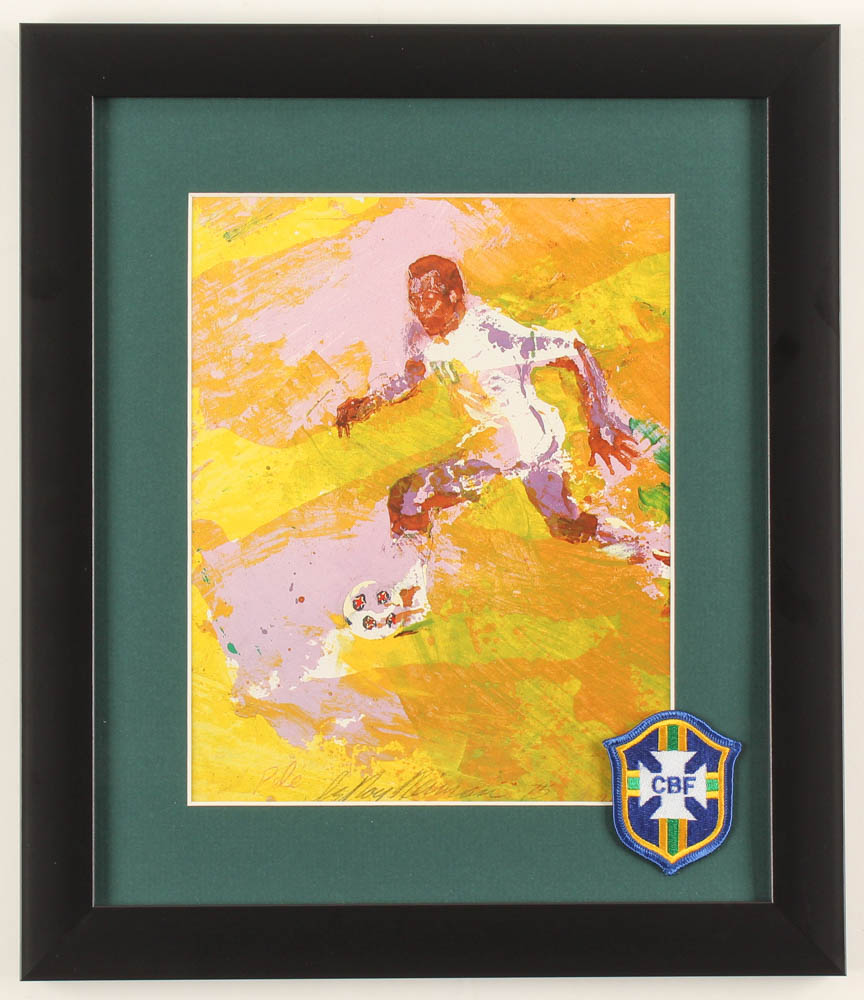 Custom framed display measures 13" x 15" in size. Features a print of Pelé from LeRoy Neiman (D. 2012). Please see photos for more details regarding the condition of the frame. Display also includes a Brazil National Team Soccer Patch.