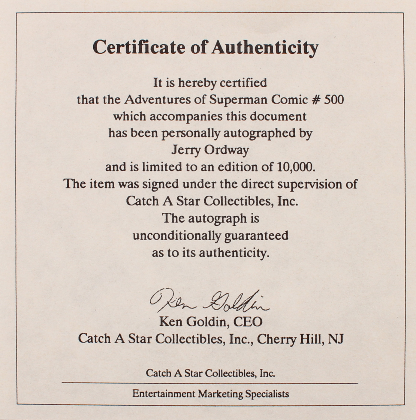Authentication: Catch a Star Collectibles Inc. COA