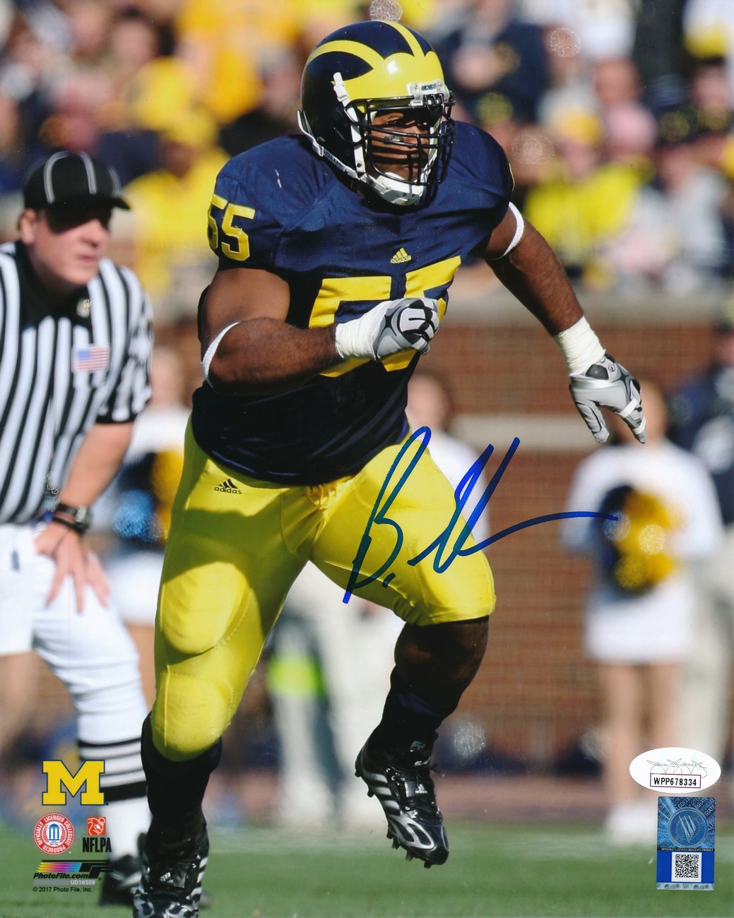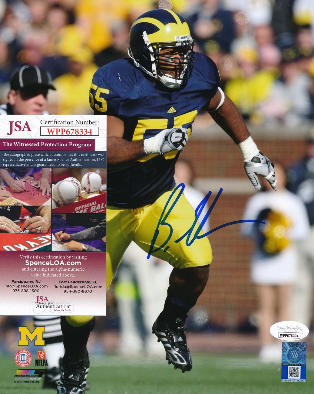 Photo measures 8" x 10" in size and has been hand-signed in blue felt-tip pen by Brandon Graham (Michigan Wolverines).