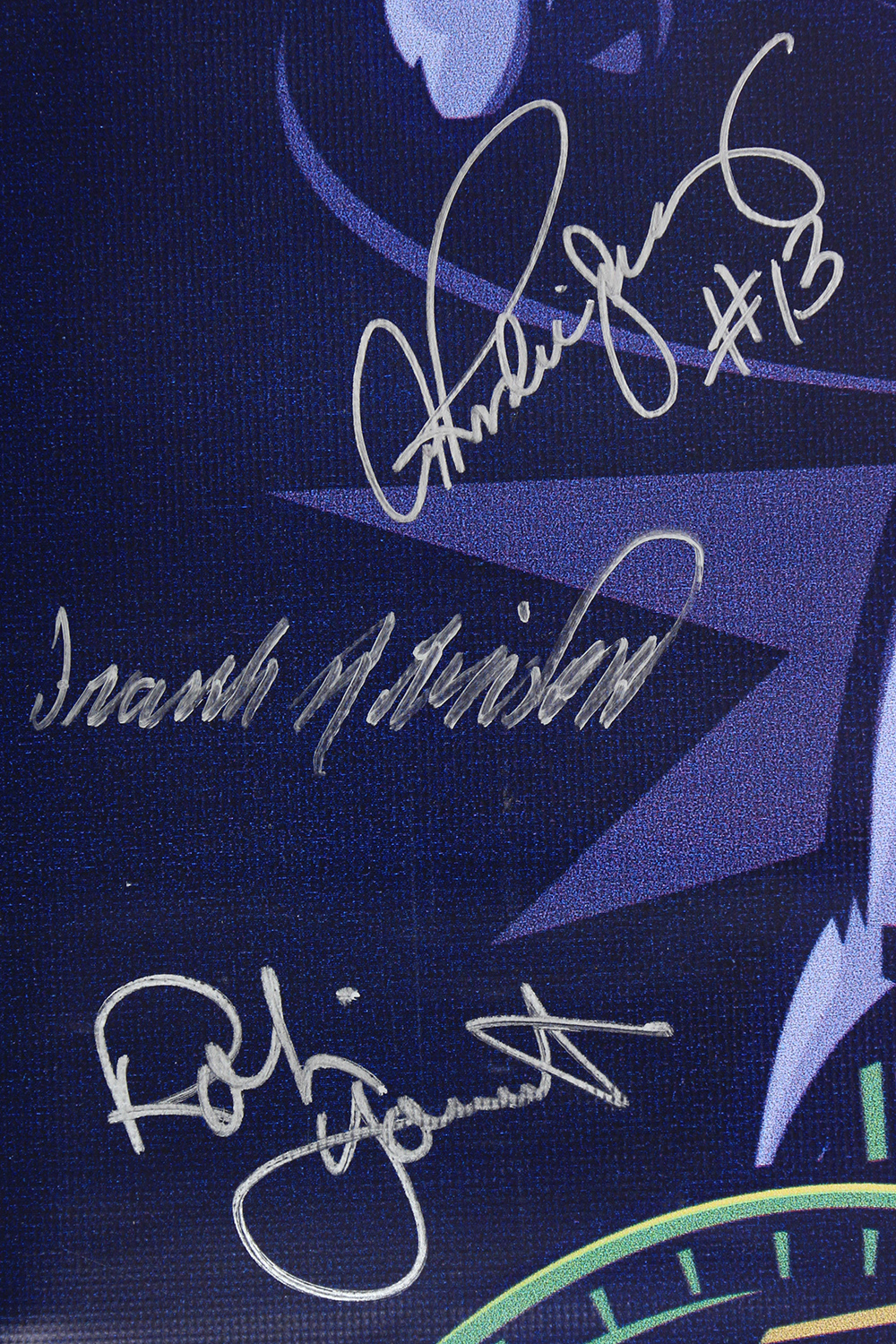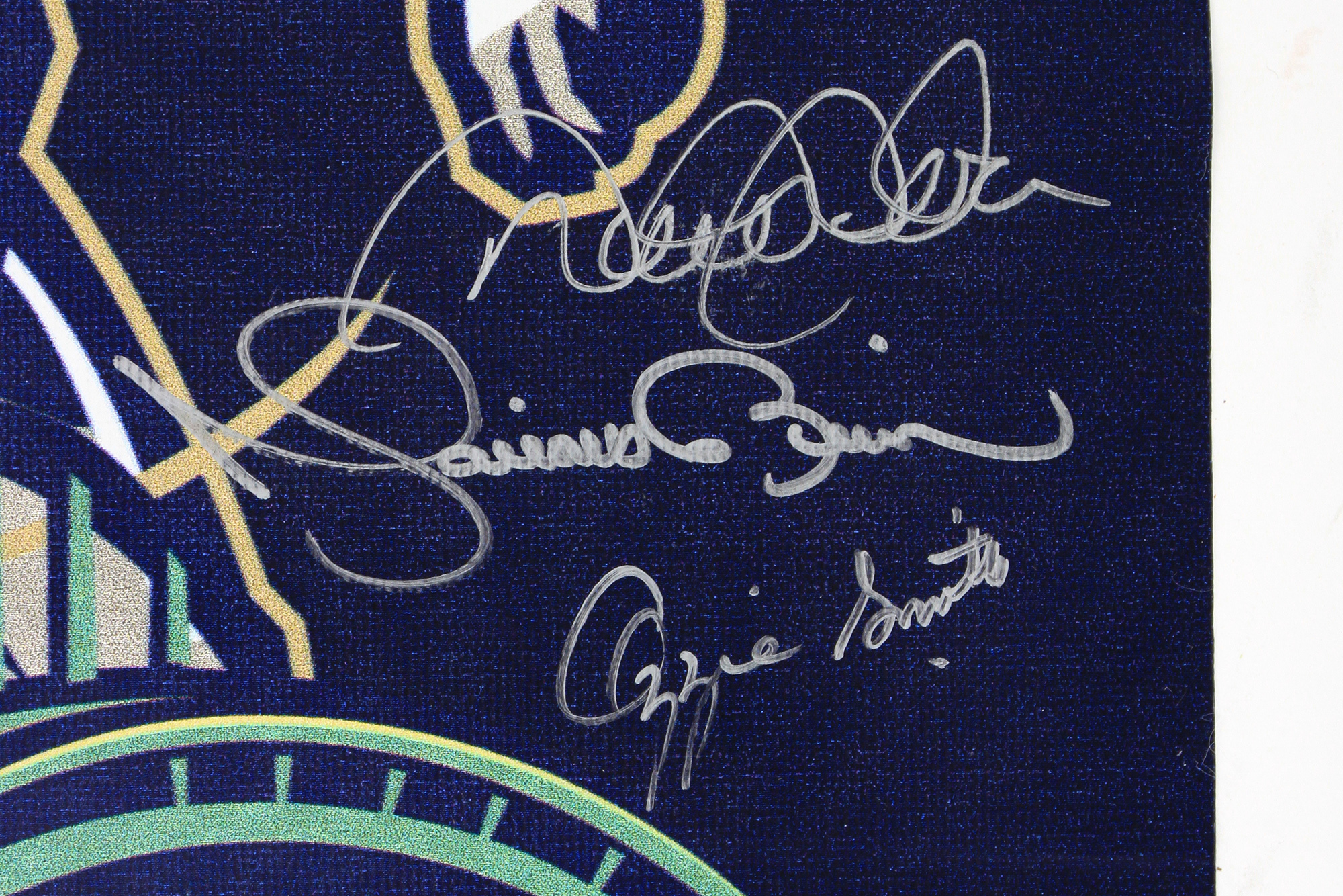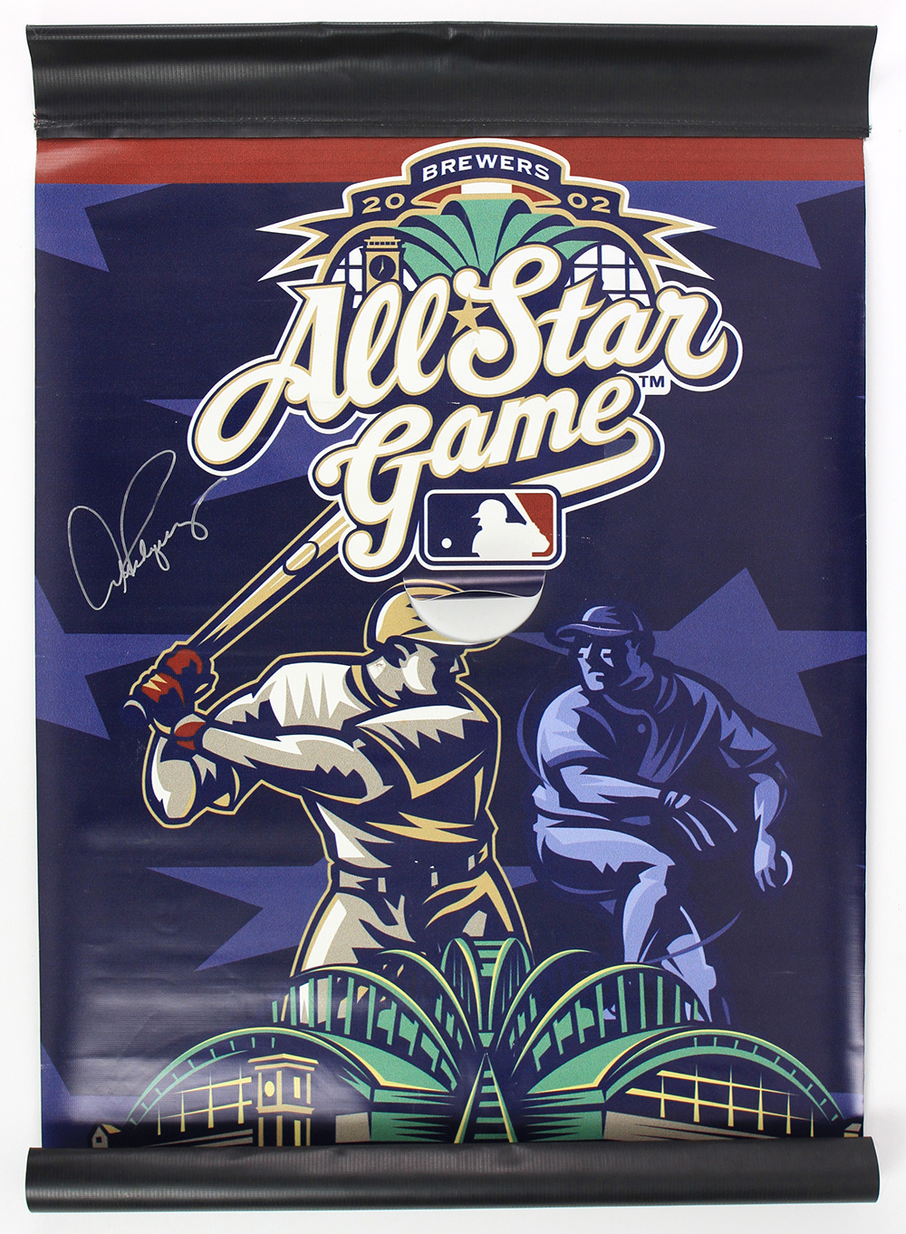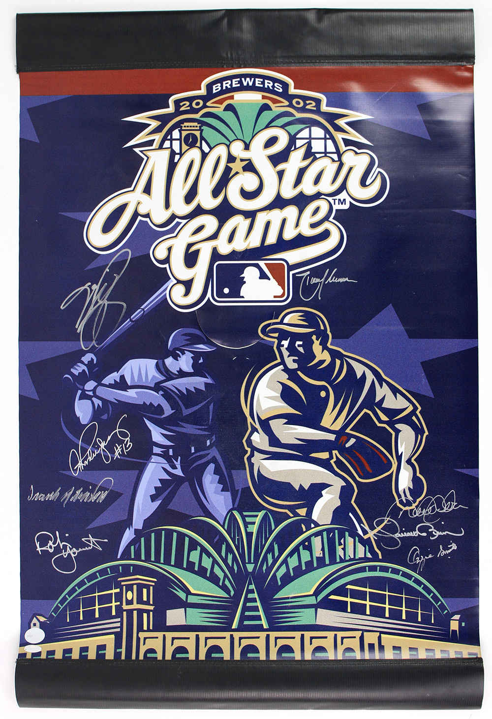 2002 MLB All-Star Game banner from the 2002 Midsummer Classic at Miller Park measuring approximately 23" x 35.5" in size. Hand-signed in silver paint pen by (8) including Derek Jeter (HOF), Randy Johnson (HOF), Mariano Rivera (HOF), Mike Piazza (HOF), Alex Rodriguez (x2), Frank Robinson (D. 2019, HOF), Robin Yount (HOF), and Ozzie Smith (HOf).