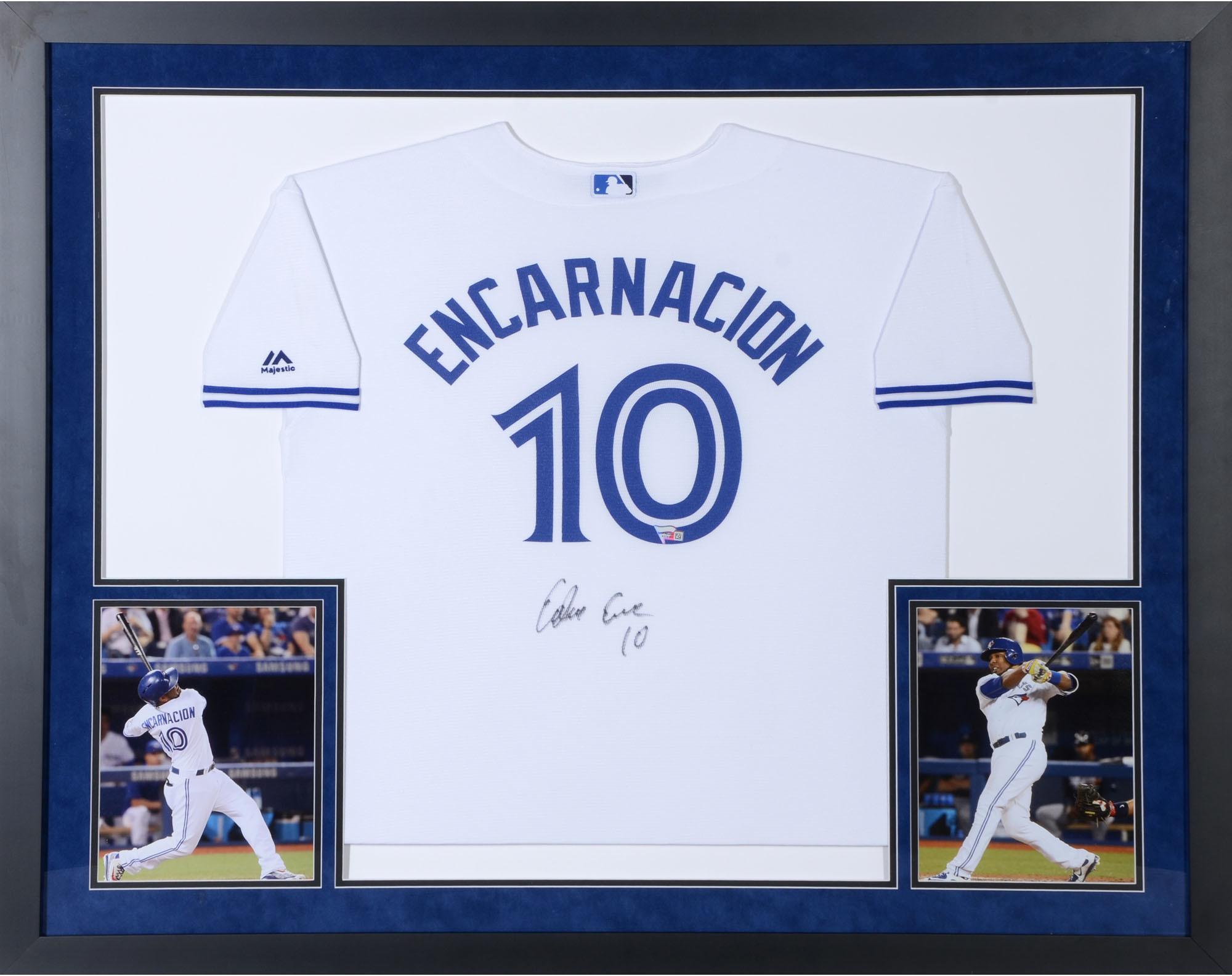 Custom framed display measures 30" x 40" in size and features a Majestic brand jersey that has been hand signed in black felt tip pen by Edwin Encarnacion (Toronto Blue Jays). Display also includes (2) 8" x 10" photos of Encarnacion.
