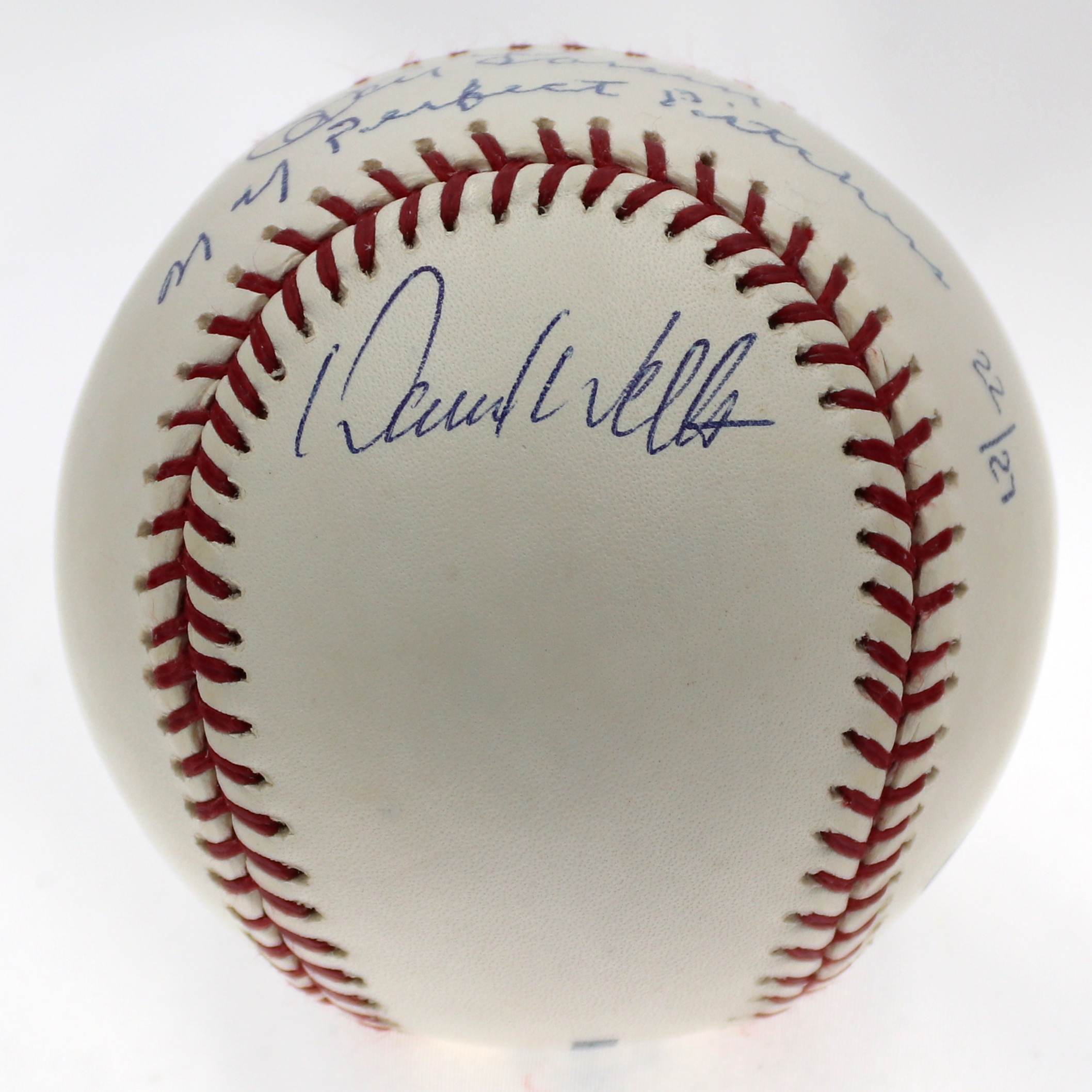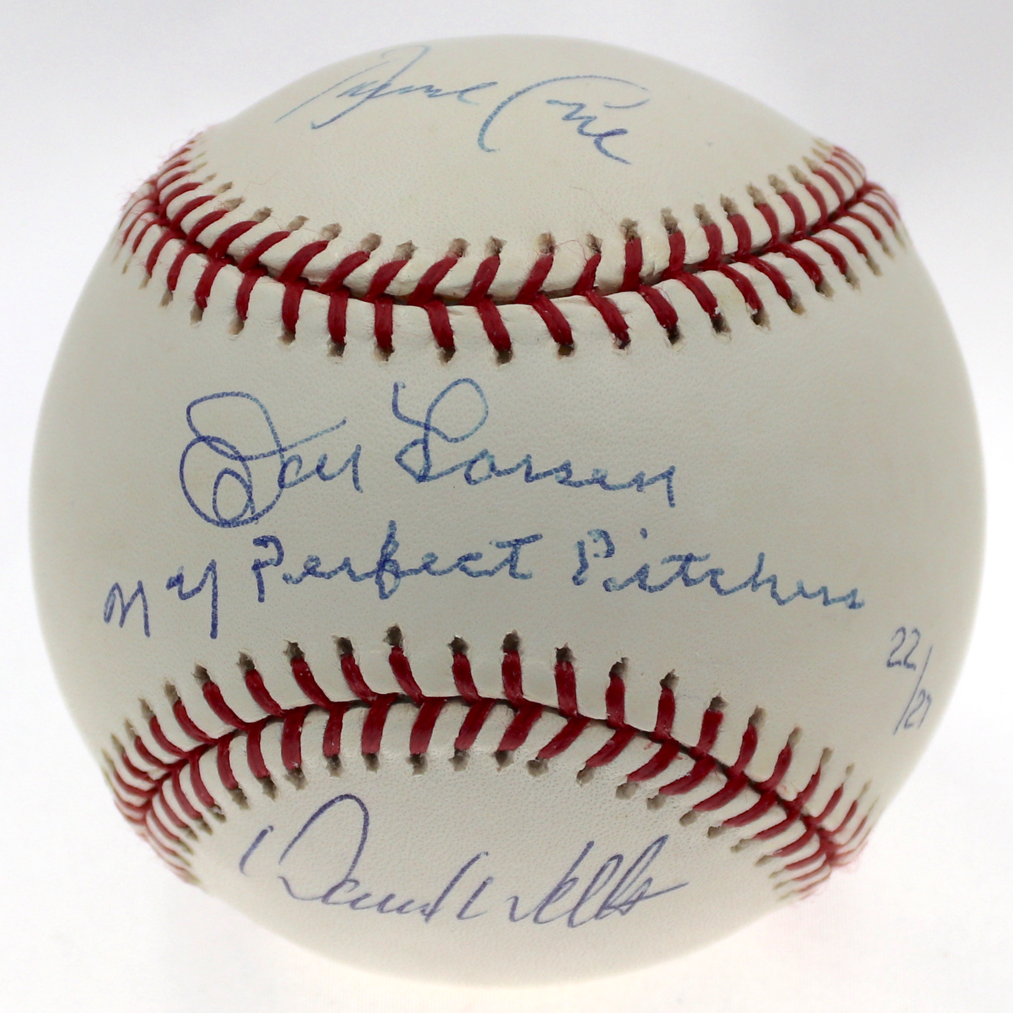 Rawlings Official Major League baseball. Hand-signed in blue ink pen by (3) New York Yankees perfect game pitchers including Don Larsen (D. 2020), David Wells and David Cone. The baseball is a limited edition and has been hand-numbered #22/27. Please see photos for details regarding the condition of the baseball.