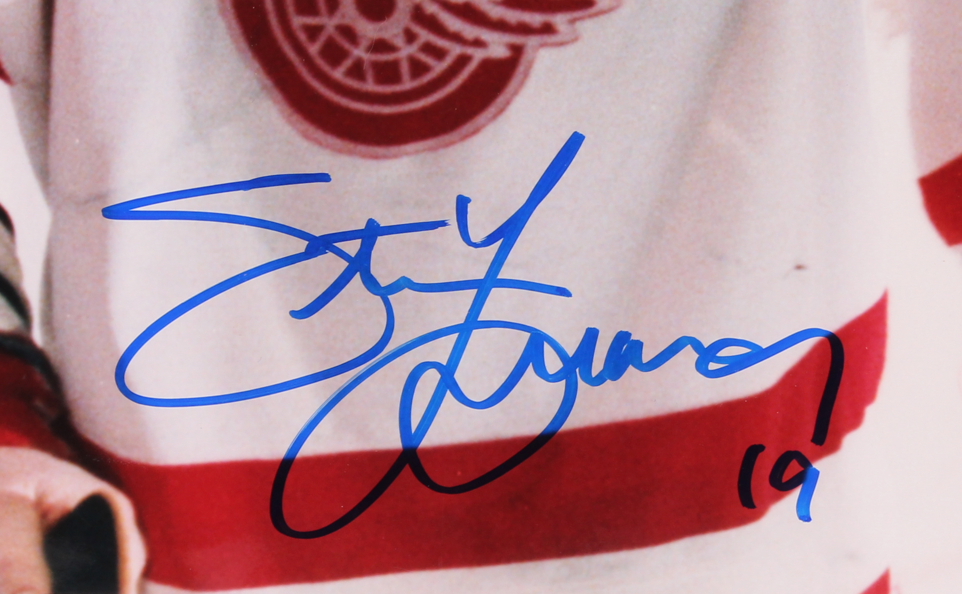 Custom frame measures 22" x 26" in size. Features a photo which has been hand-signed in blue felt-tip pen by Steve Yzerman (Detroit Red Wings, HOF).