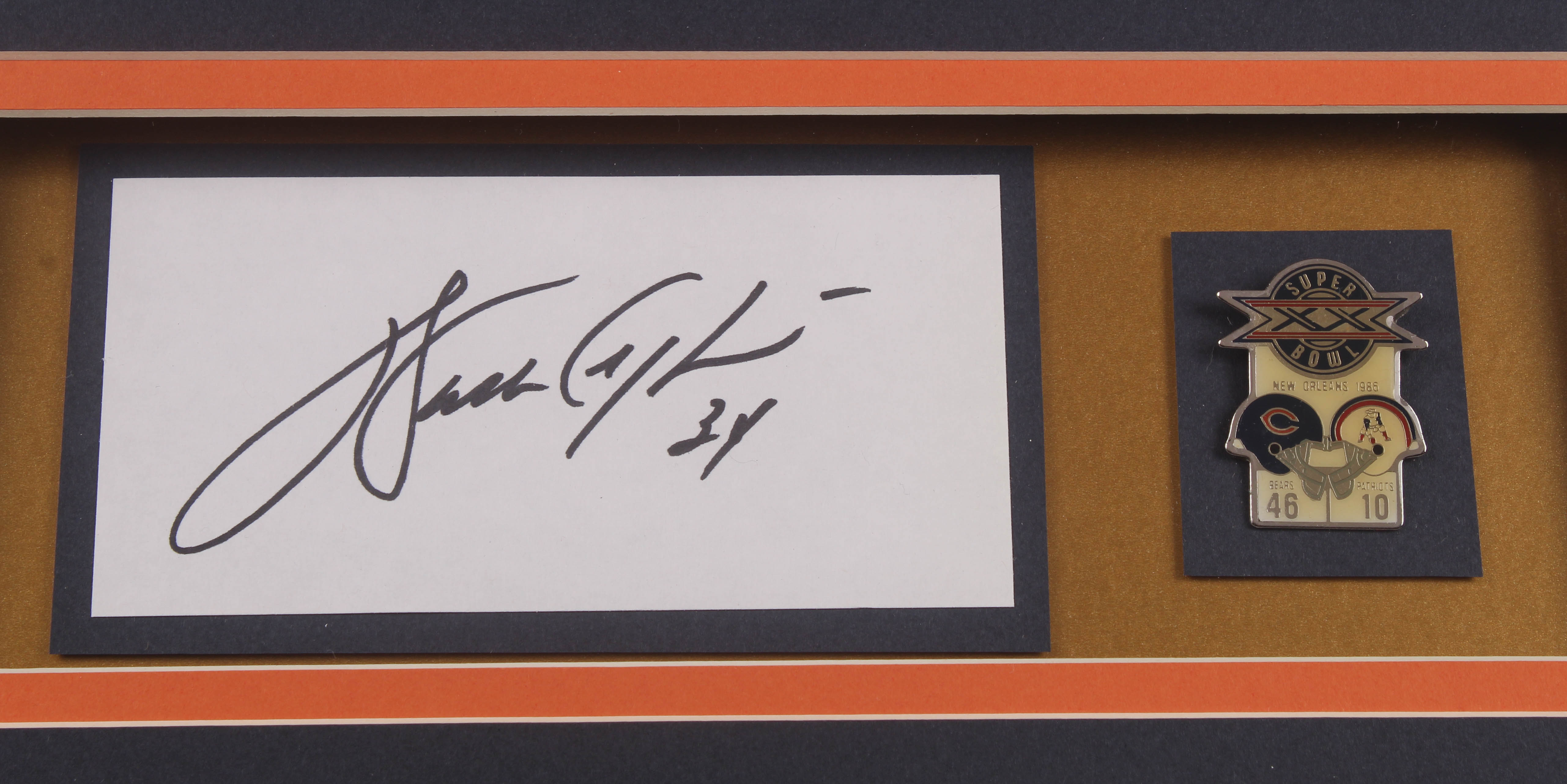 Custom frame measures 32" x 36" in size and features a cut that has been hand-signed in black felt-tip pen by Walter Payton (D. 1999, HOF). Display also features a Super Bowl pin.