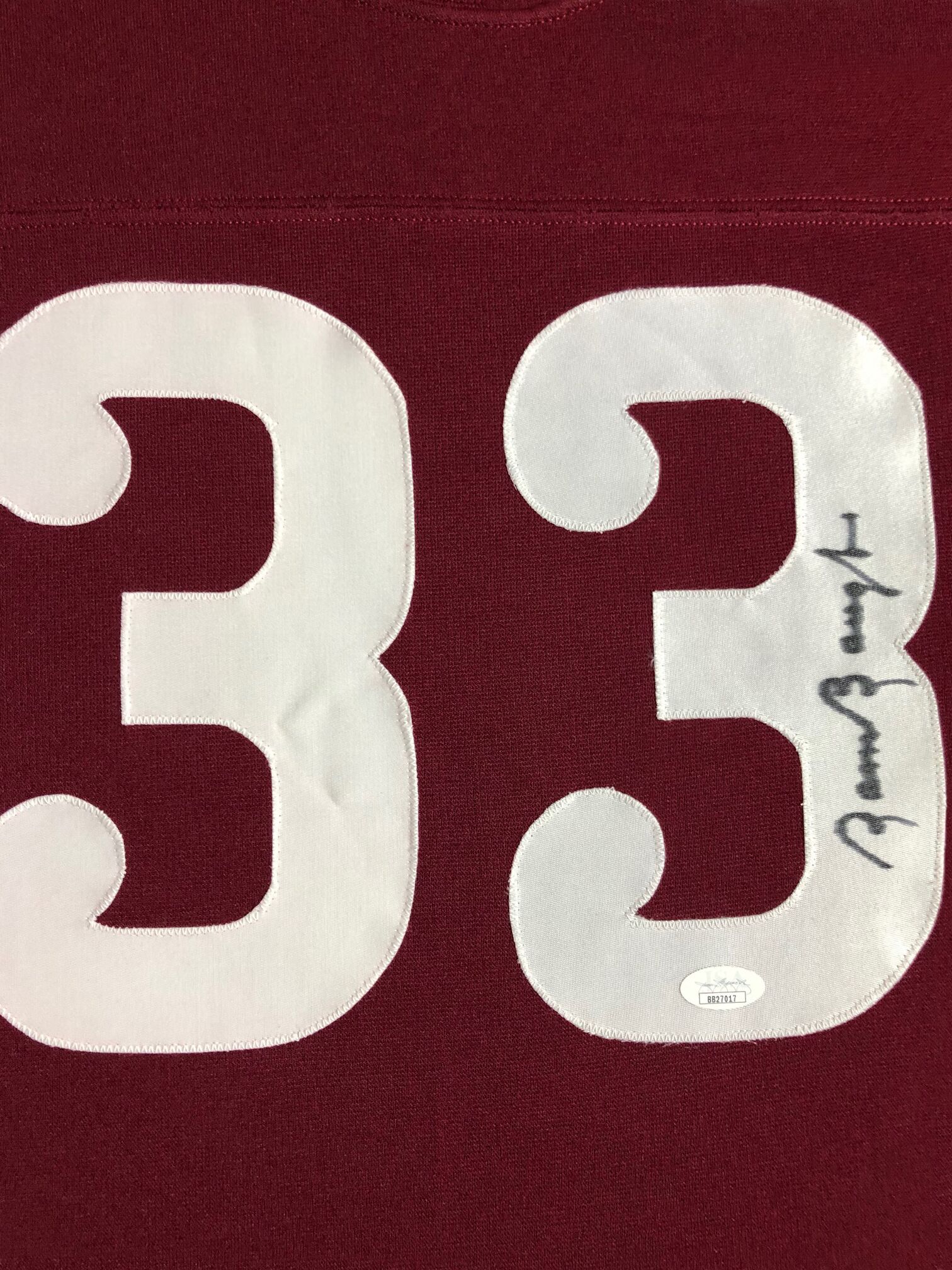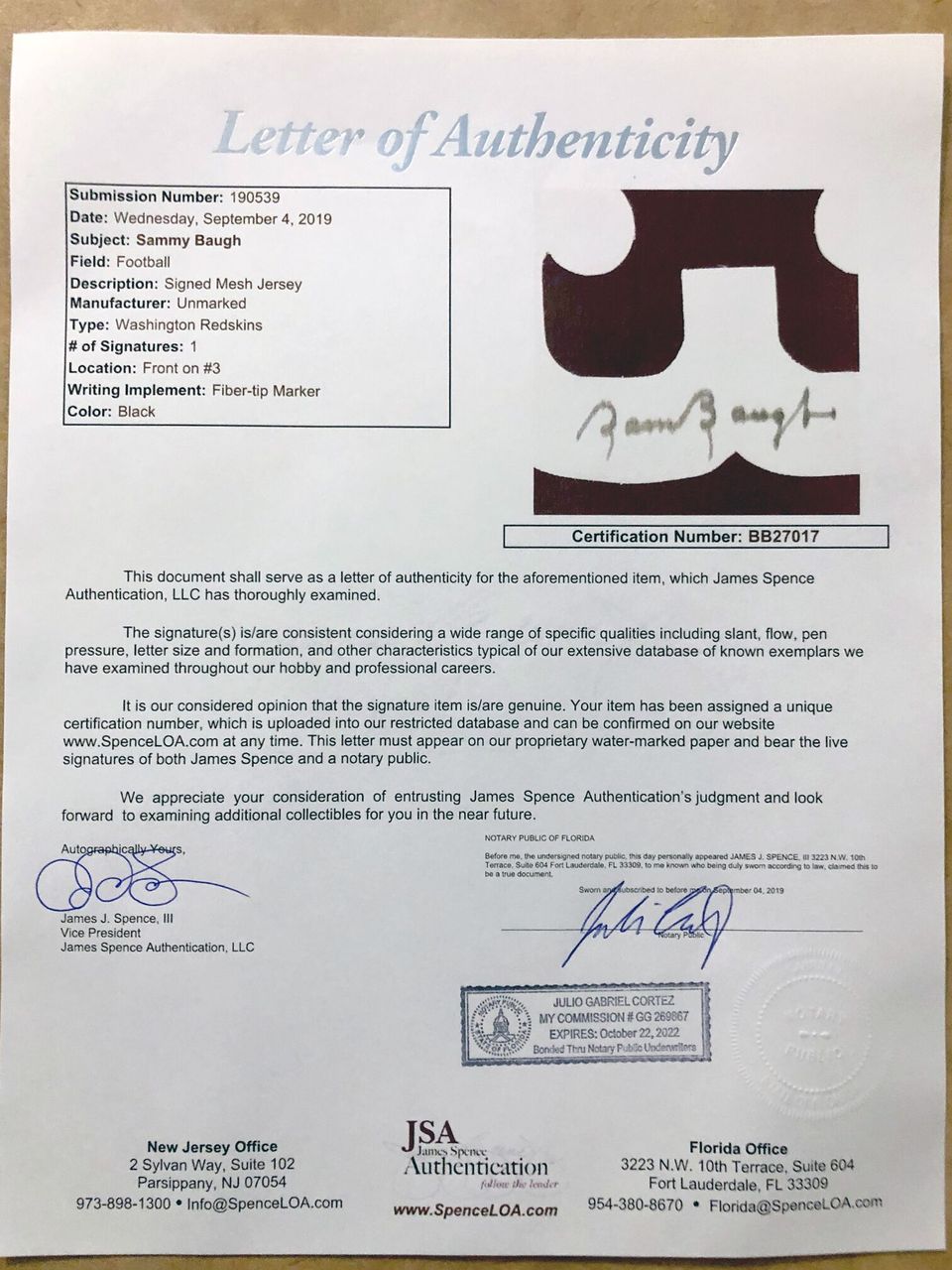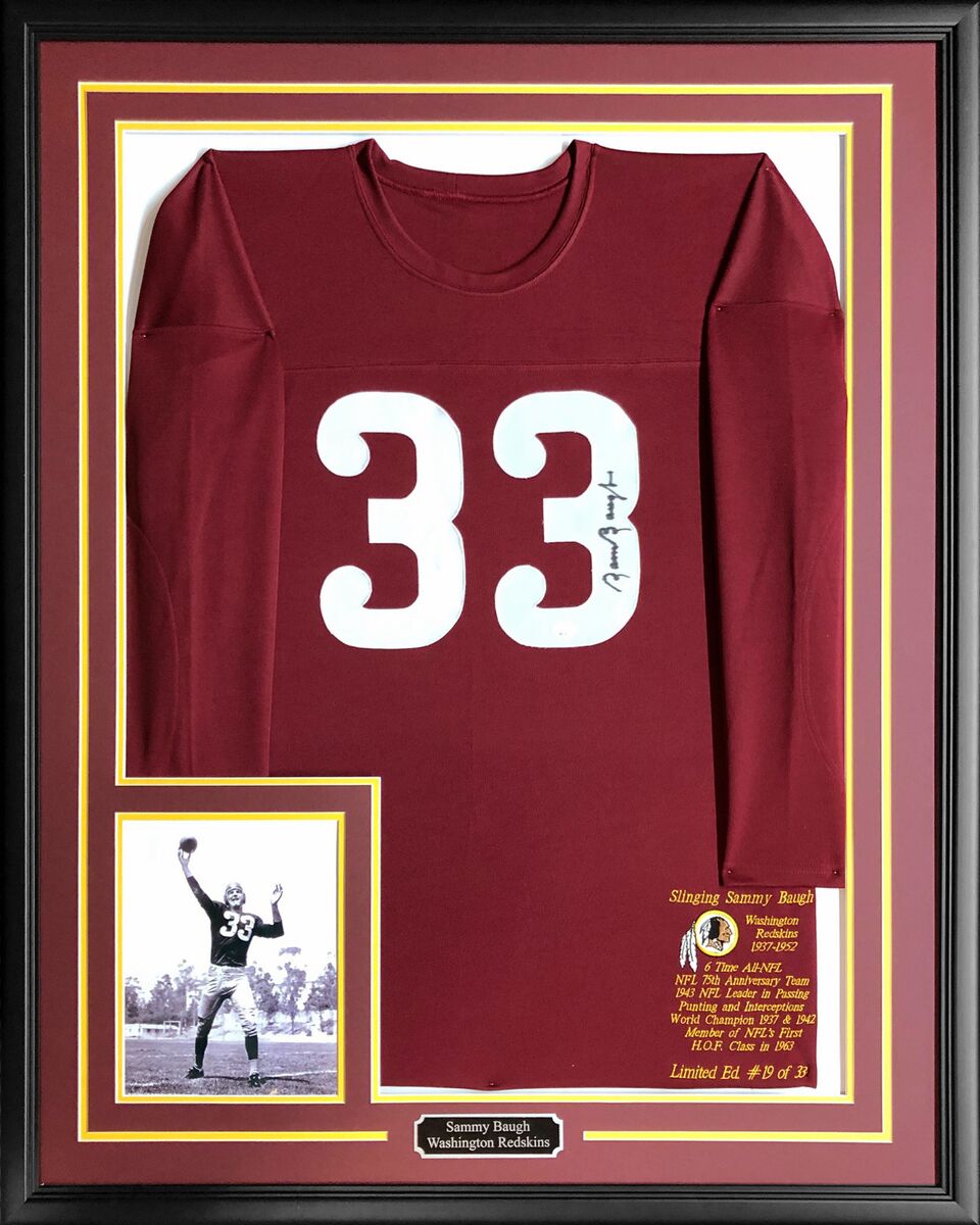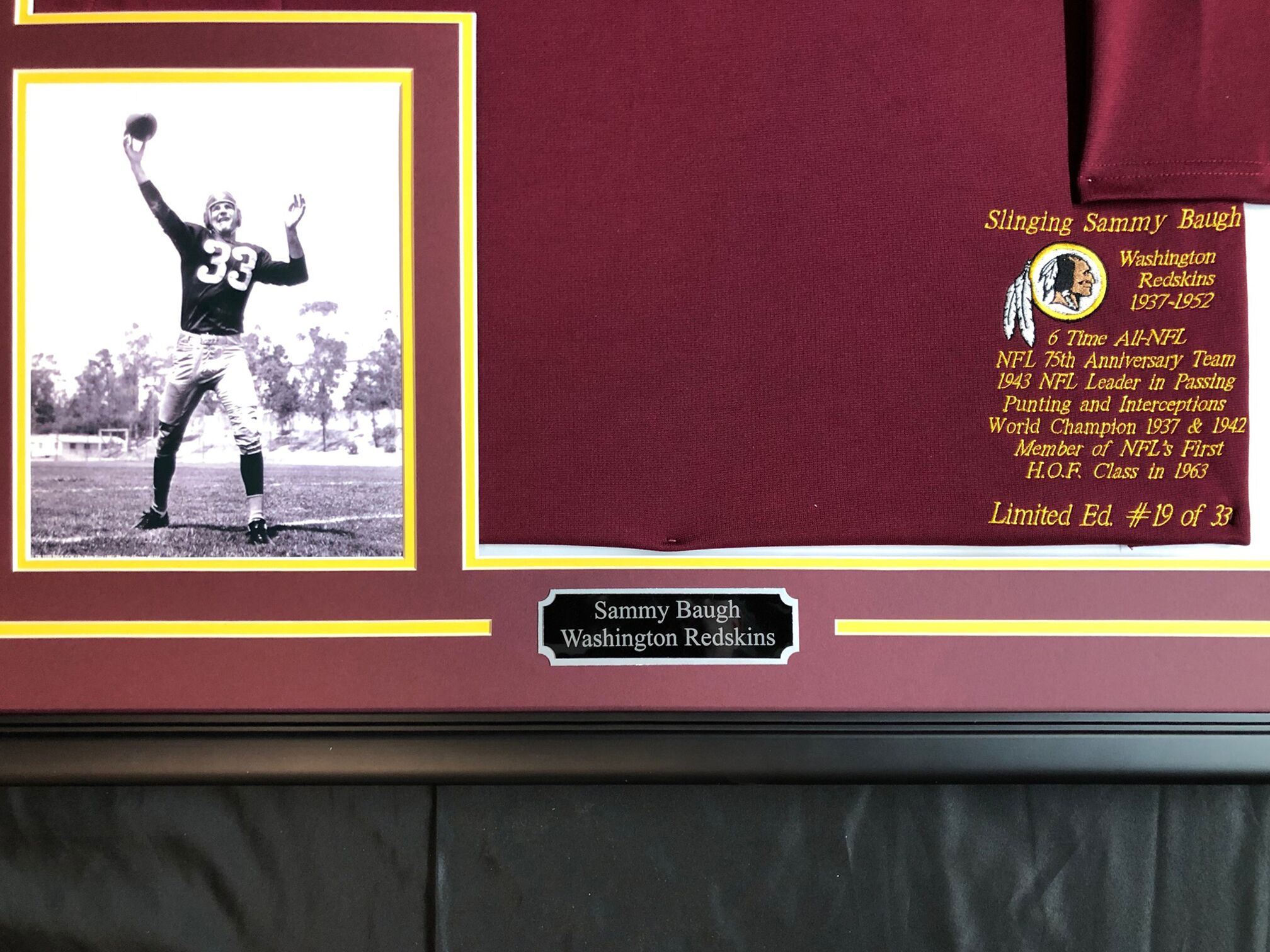 Custom frame measures approximately 34.5" x 42.5" in size and showcases a limited edition (# of 33) stat jersey which has been hand-signed in black felt-tip pen by Sammy Baugh (Washington Redskins, HOF). High quality framing includes the following unique features: Jersey is hand-sewn to the back mat board, framed with real wood molding, ultra strong and crystal clear UV-resistant acrylic, a licensed 8x10 photo, and a double-layer laser-engraved metal nameplate.