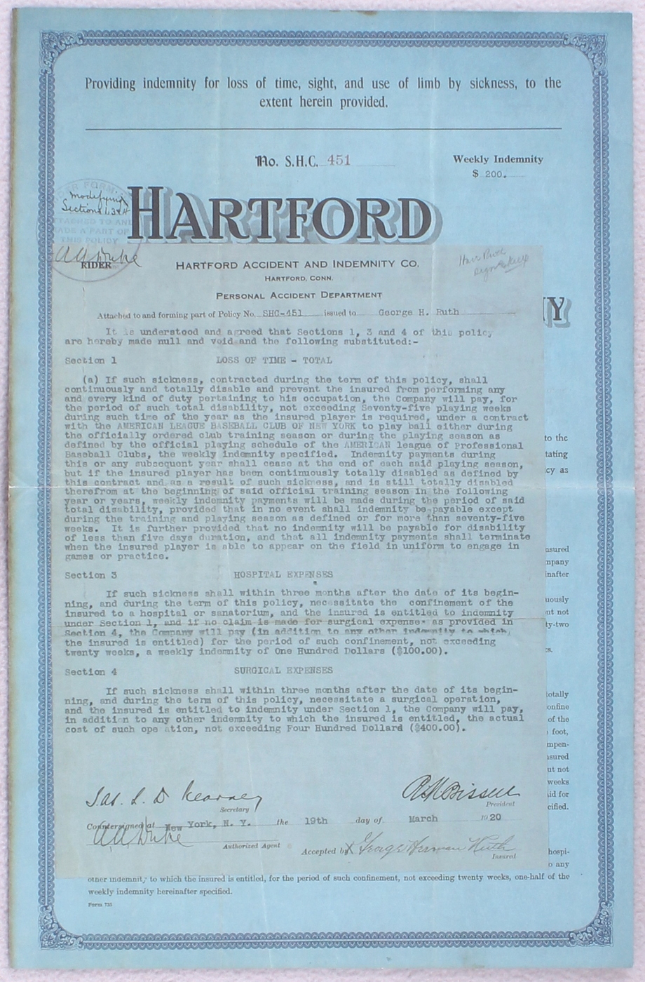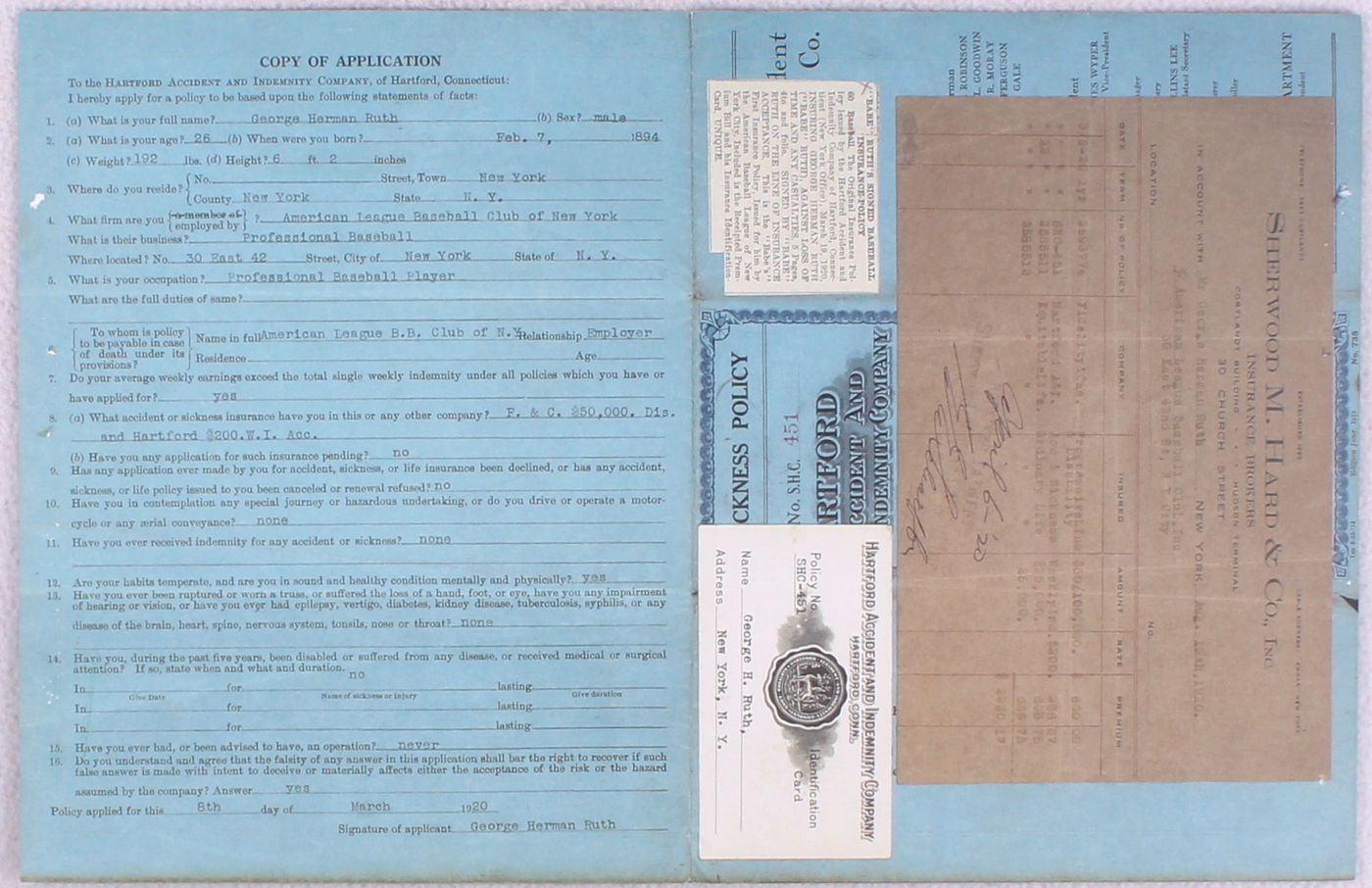 Babe Ruth 1894 "Hartford" Replica Insurance Document