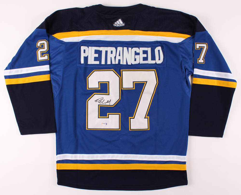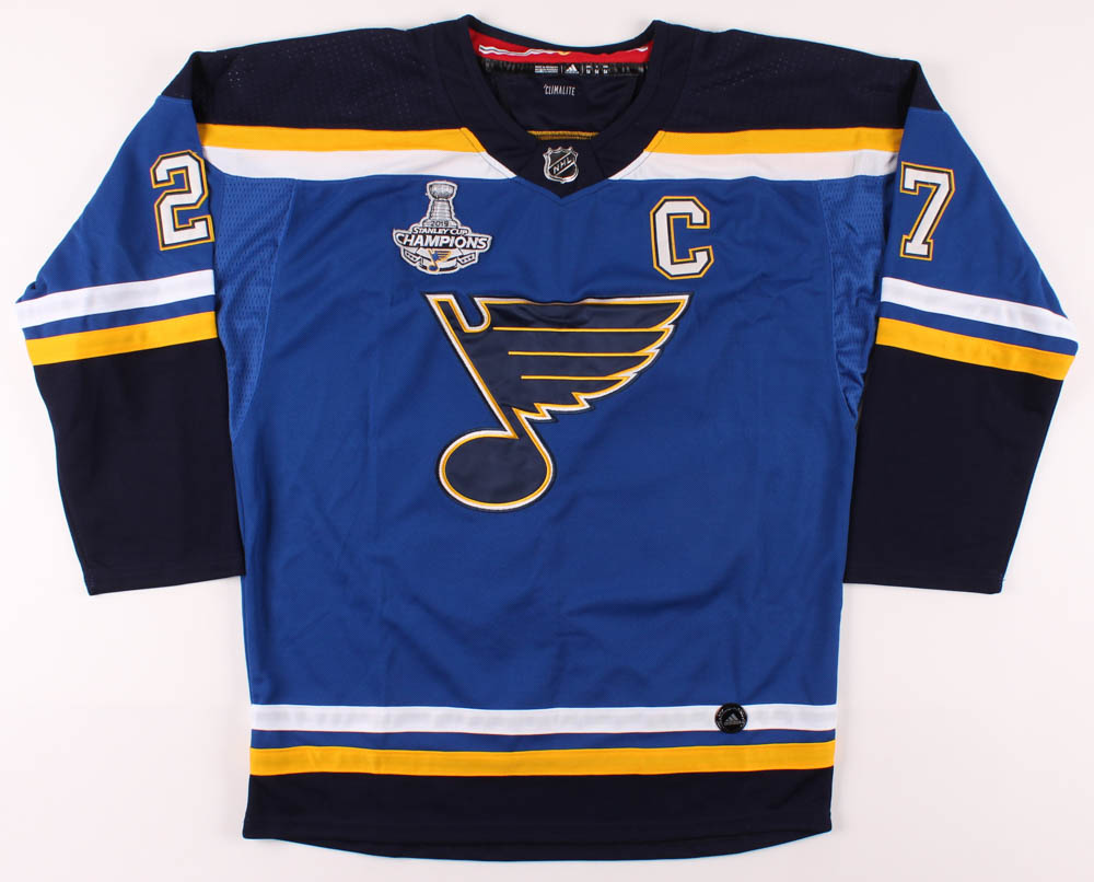 Adidas on-ice style 2019 Stanley Cup champions captain's jersey. Everything is sewn on, size 54. Hand-signed in black felt-tip pen by Alex Pietrangelo (St. Louis Blues).