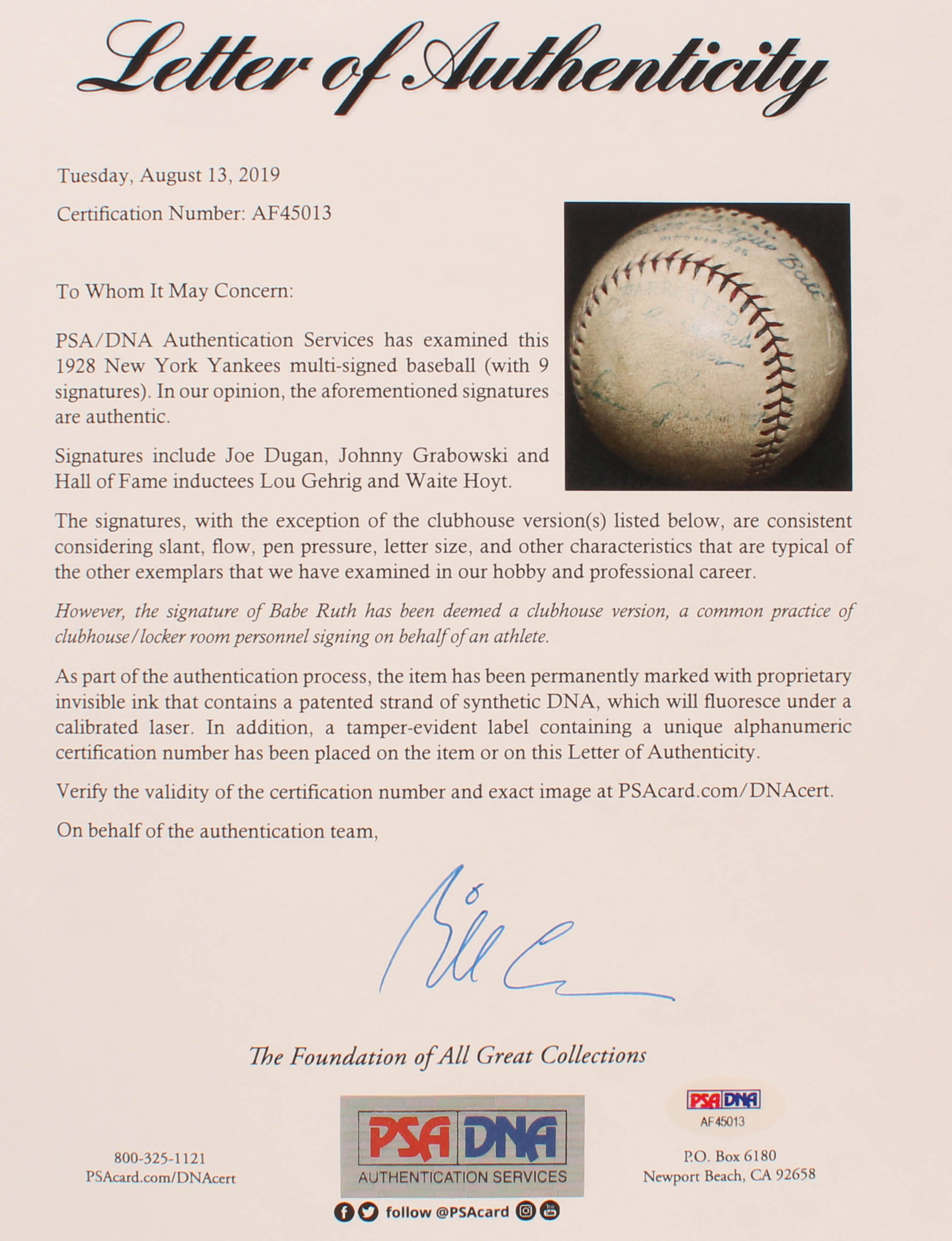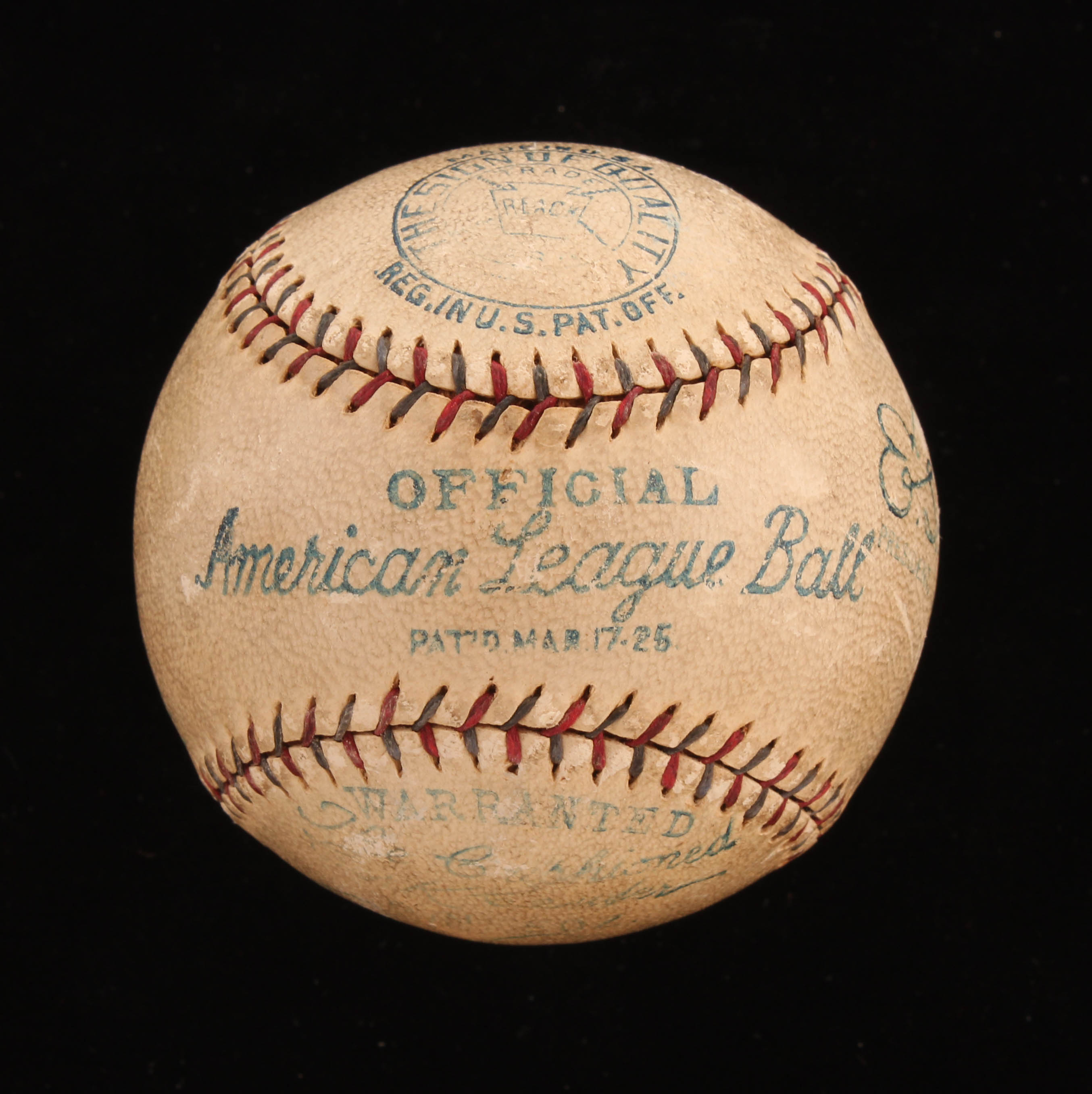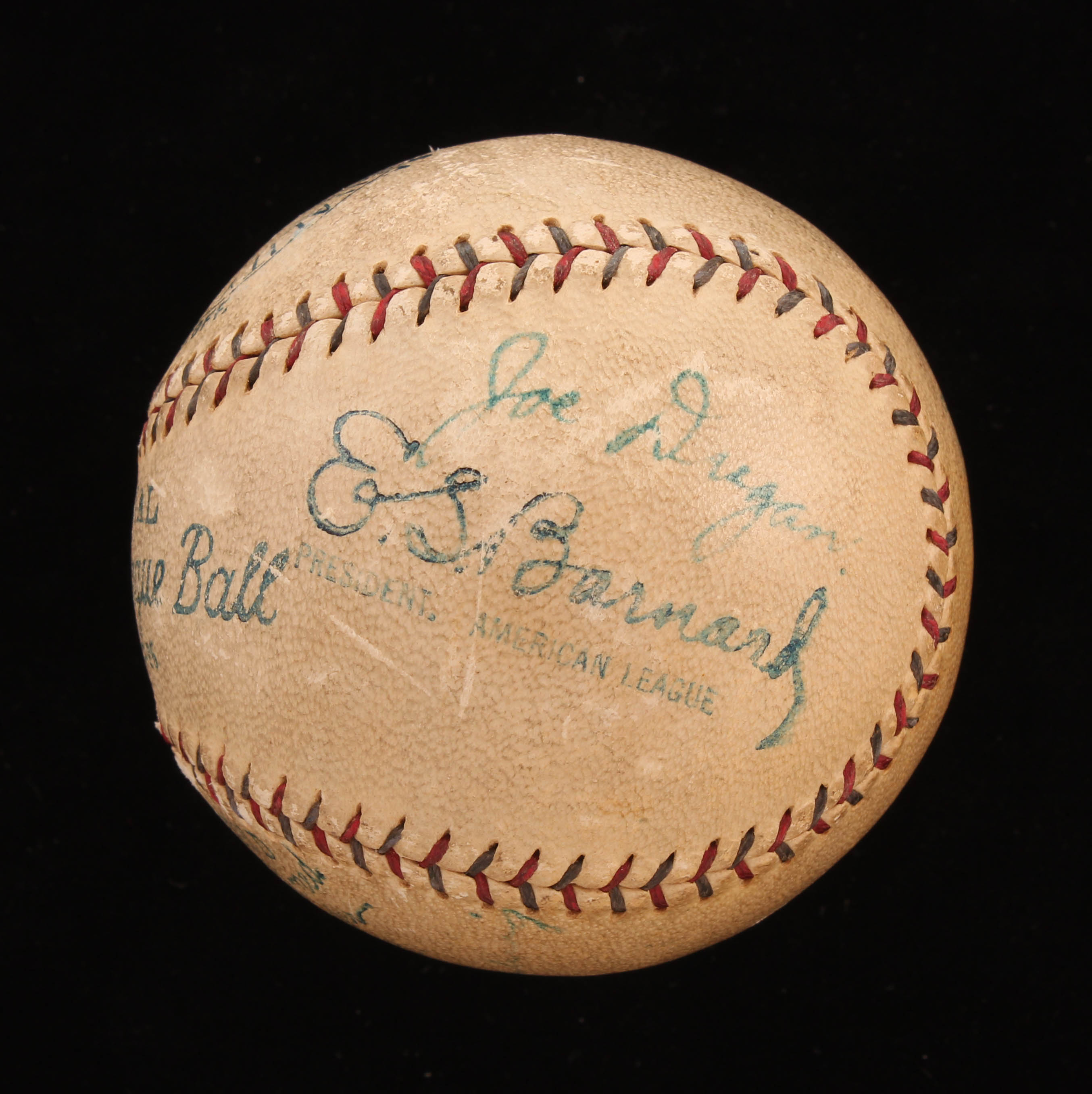 Vintage Official American League Baseball. Hand-signed in blue ink pen by Lou Gehrig, Waite Hoyt, Joe Dugan, Johnny Grabowski, and (5) others (New York Yankees). Please note, the Babe Ruth signature has been deemed a club house signature. Also please note, baseball shows signs of natural toning.