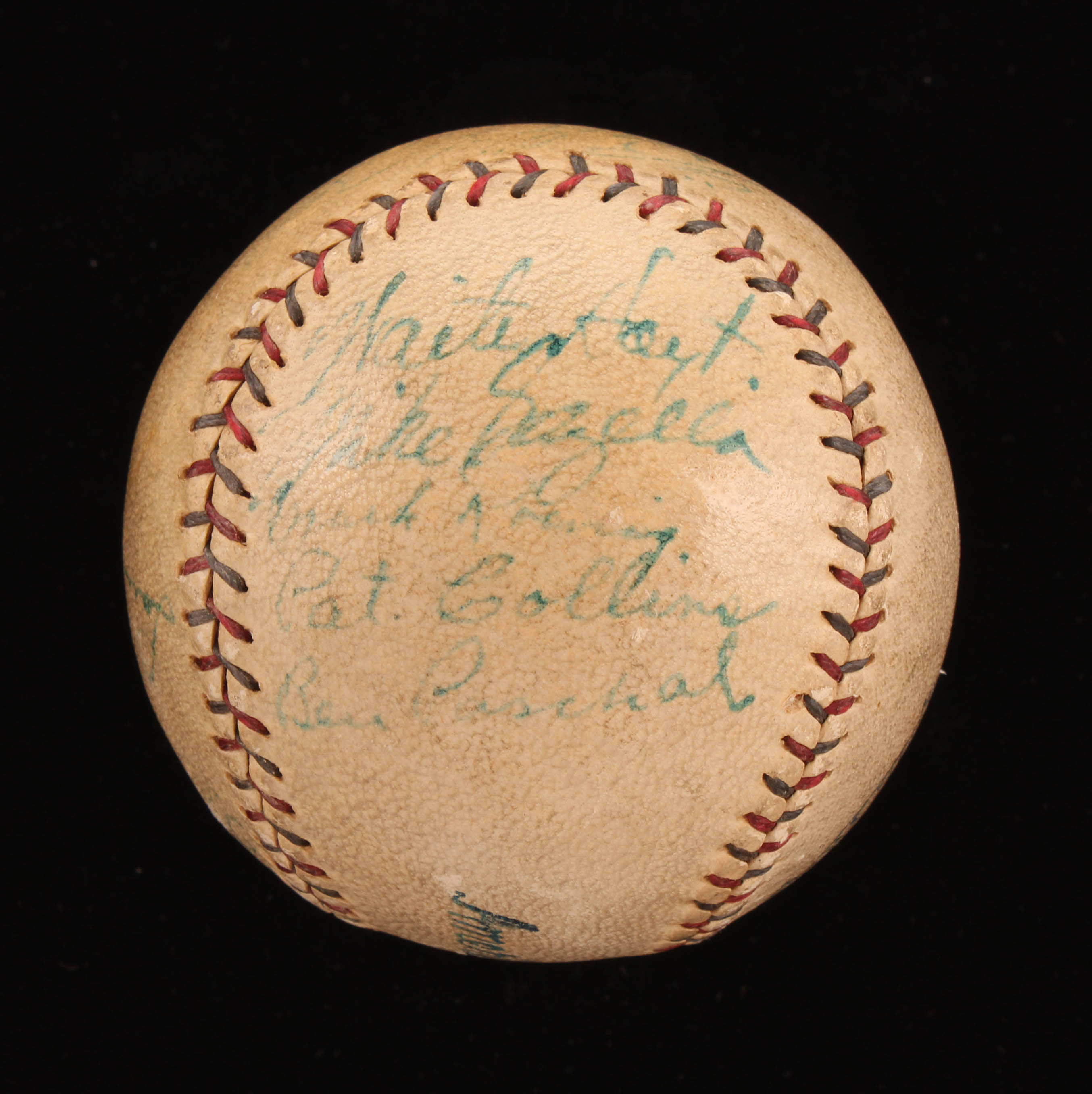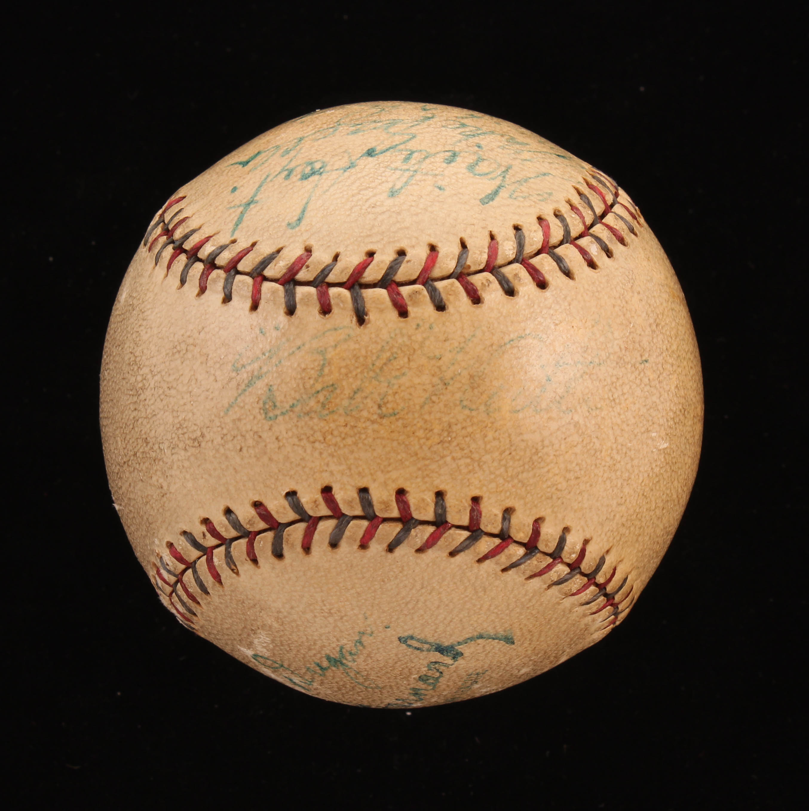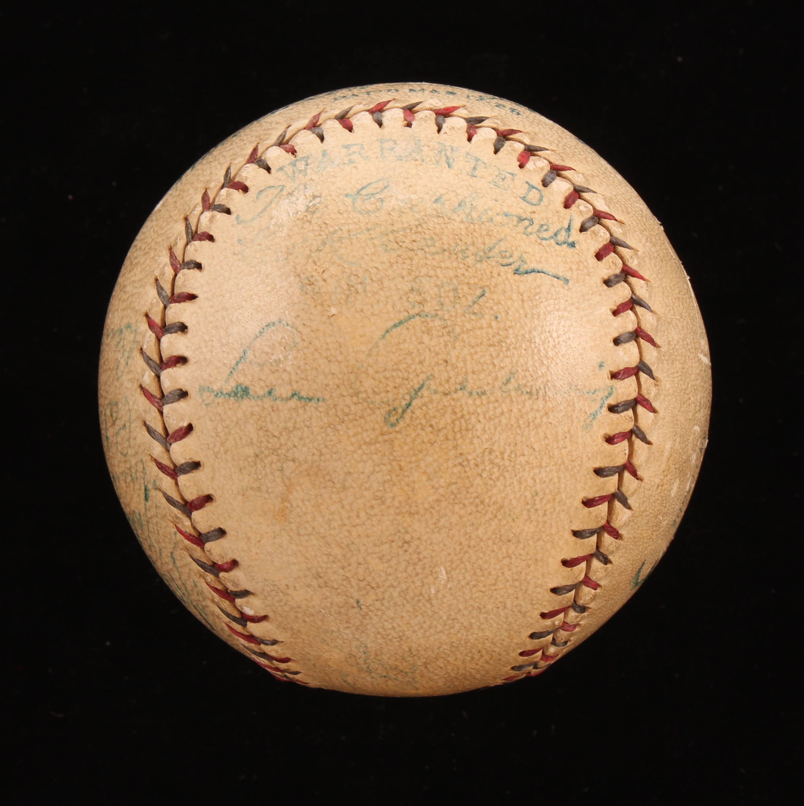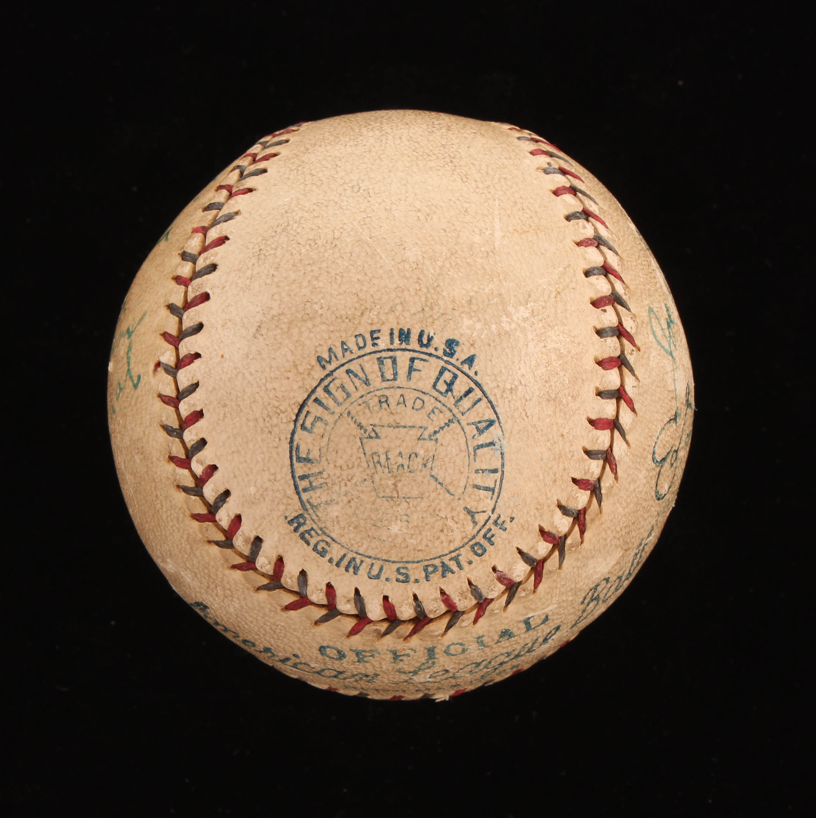 Vintage Official American League Baseball. Hand-signed in blue ink pen by Lou Gehrig, Waite Hoyt, Joe Dugan, Johnny Grabowski, and (5) others (New York Yankees). Please note, the Babe Ruth signature has been deemed a club house signature. Also please note, baseball shows signs of natural toning.