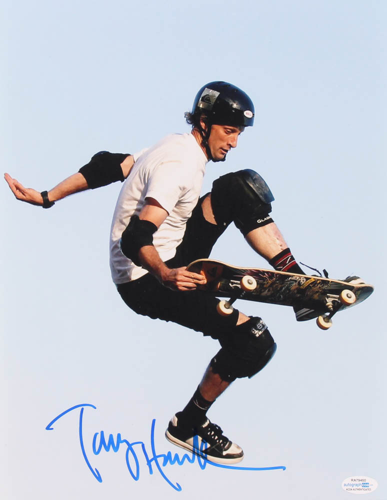 Photo measures 11" x 14" in size and has been hand-signed in blue felt-tip pen by Tony Hawk.