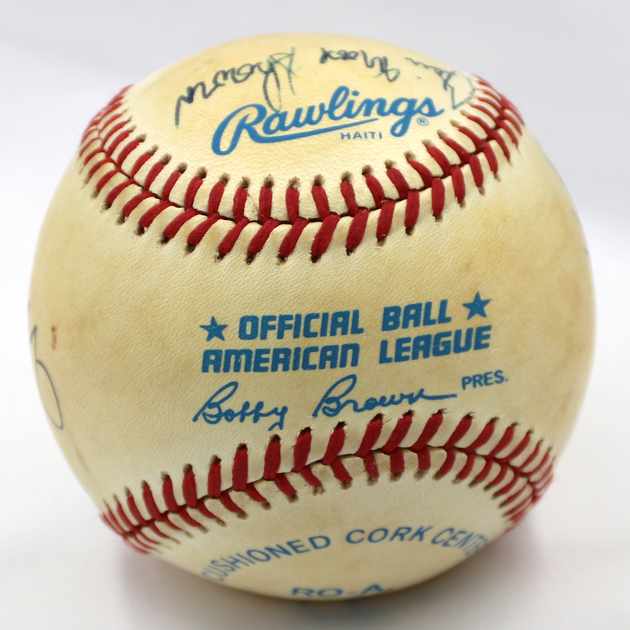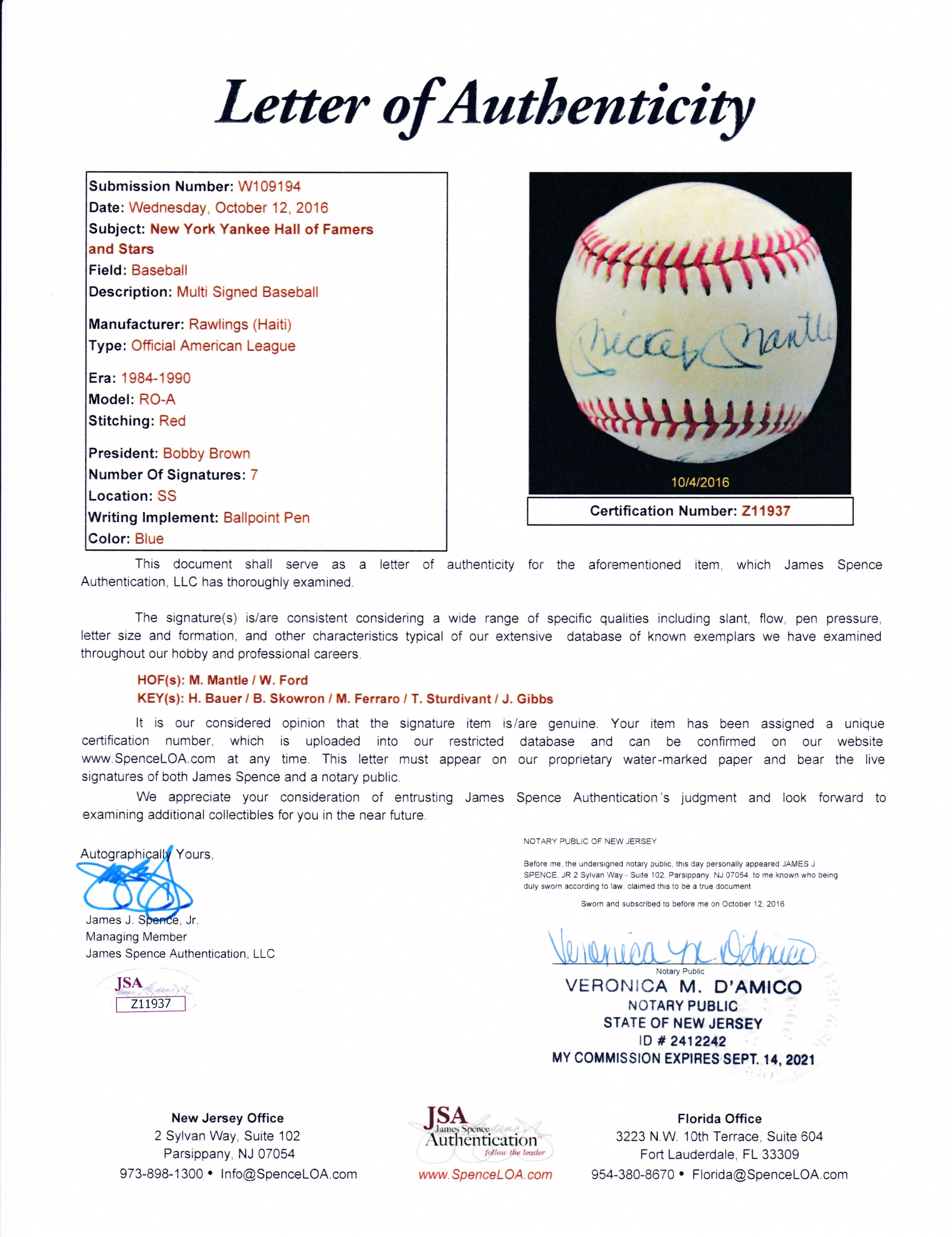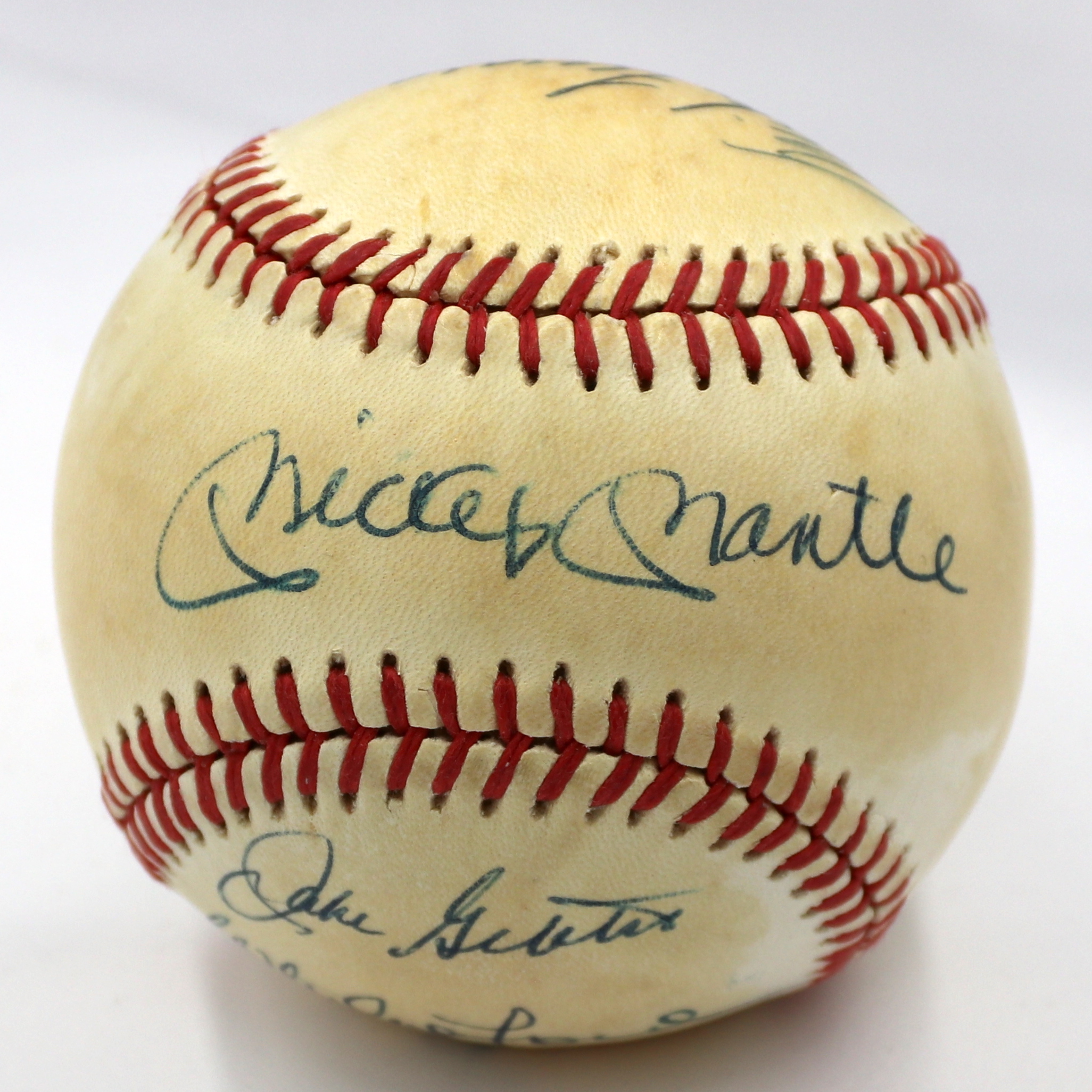 Rawlings Official American League baseball. Hand-signed in black ink pen by (7) New York Yankees greats including Mickey Mantle (D. 1995, HOF), Whitey Ford (HOF), Hank Bauer (D. 2007), Bill Skowron (D. 2012), Mike Ferraro, Tom Sturdivant (D. 2009), and Jake Gibbs.