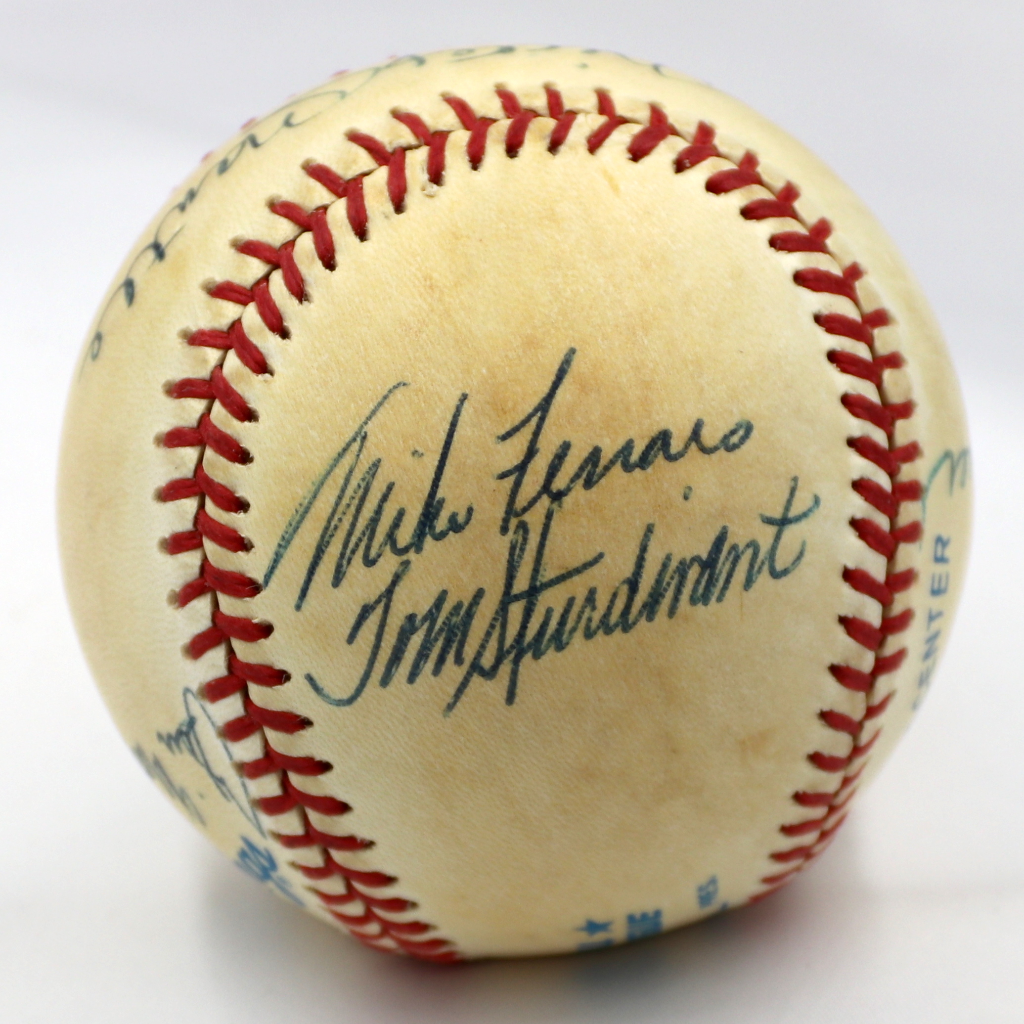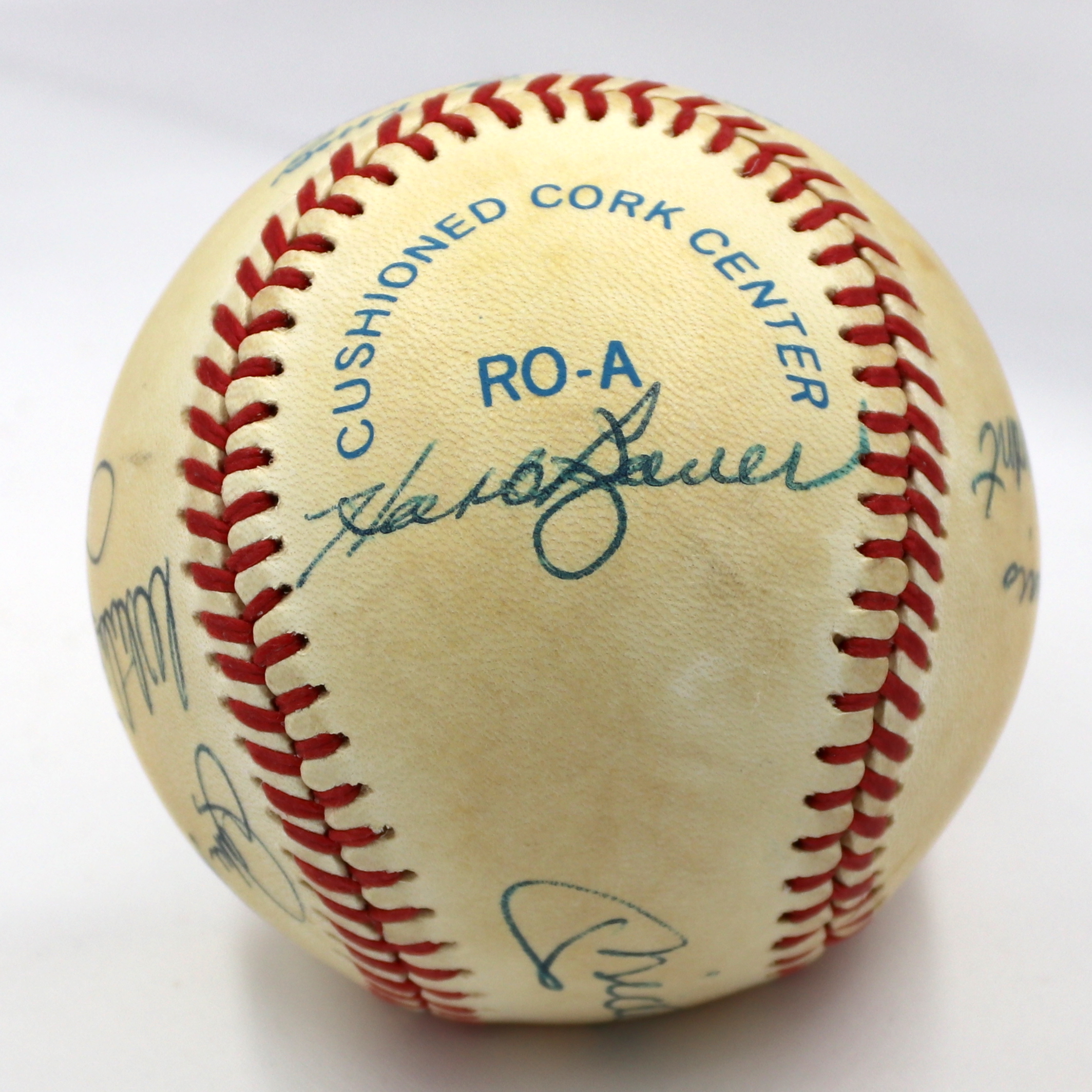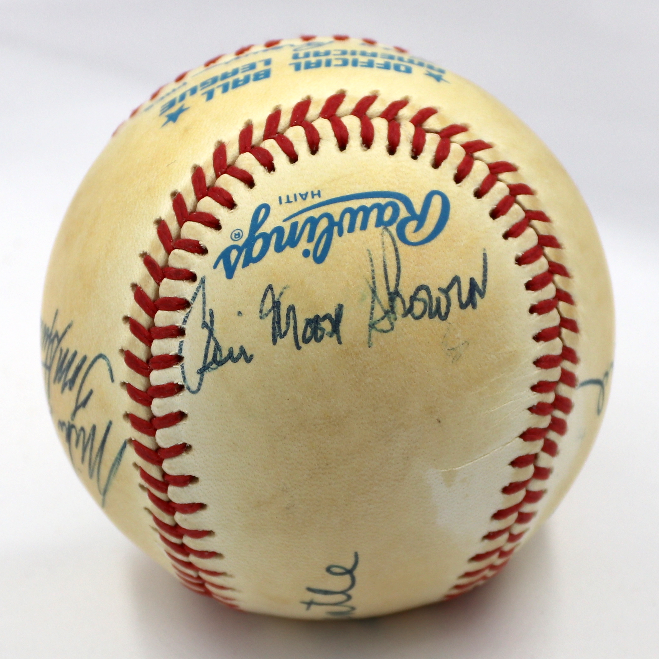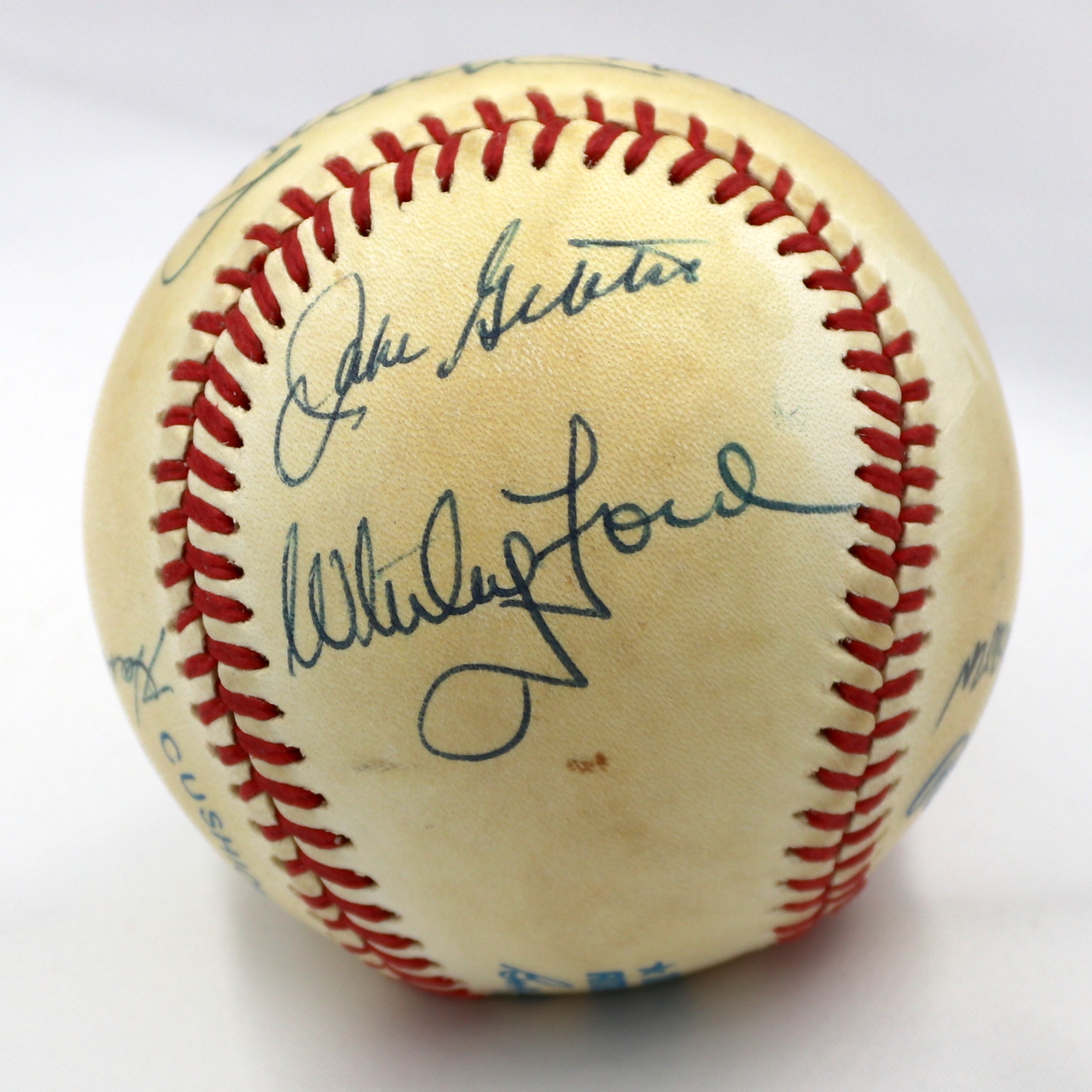 Rawlings Official American League baseball. Hand-signed in black ink pen by (7) New York Yankees greats including Mickey Mantle (D. 1995, HOF), Whitey Ford (HOF), Hank Bauer (D. 2007), Bill Skowron (D. 2012), Mike Ferraro, Tom Sturdivant (D. 2009), and Jake Gibbs.