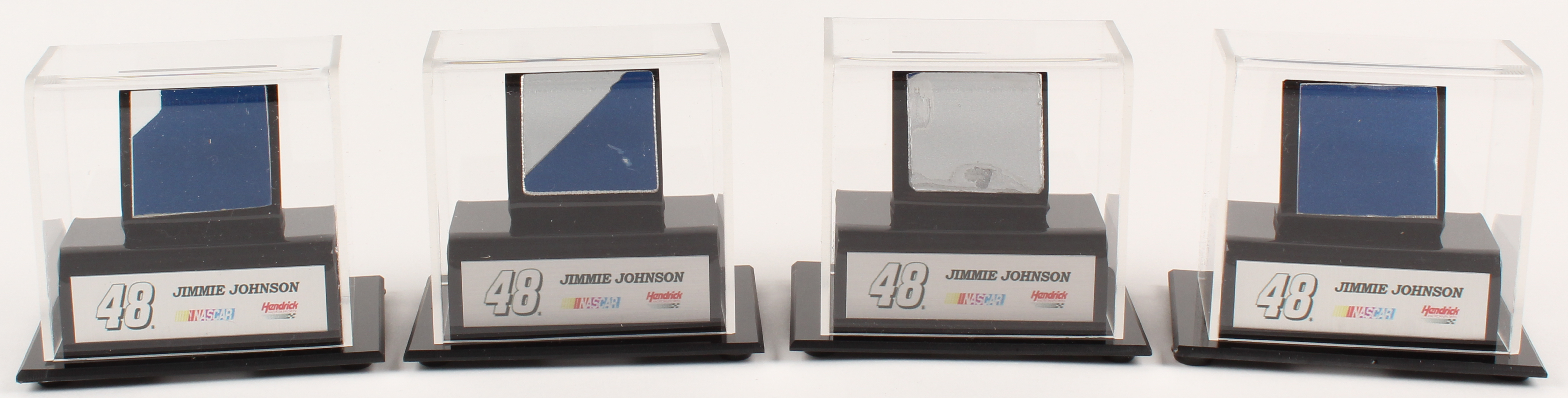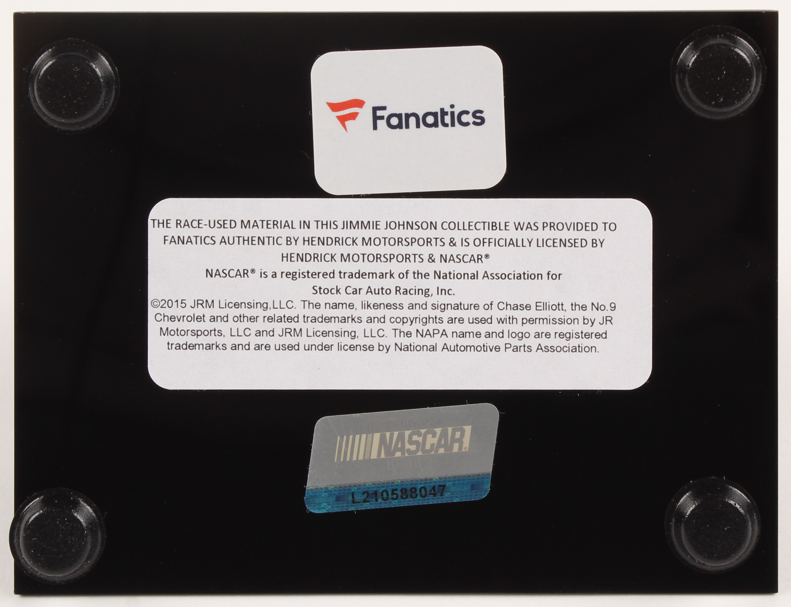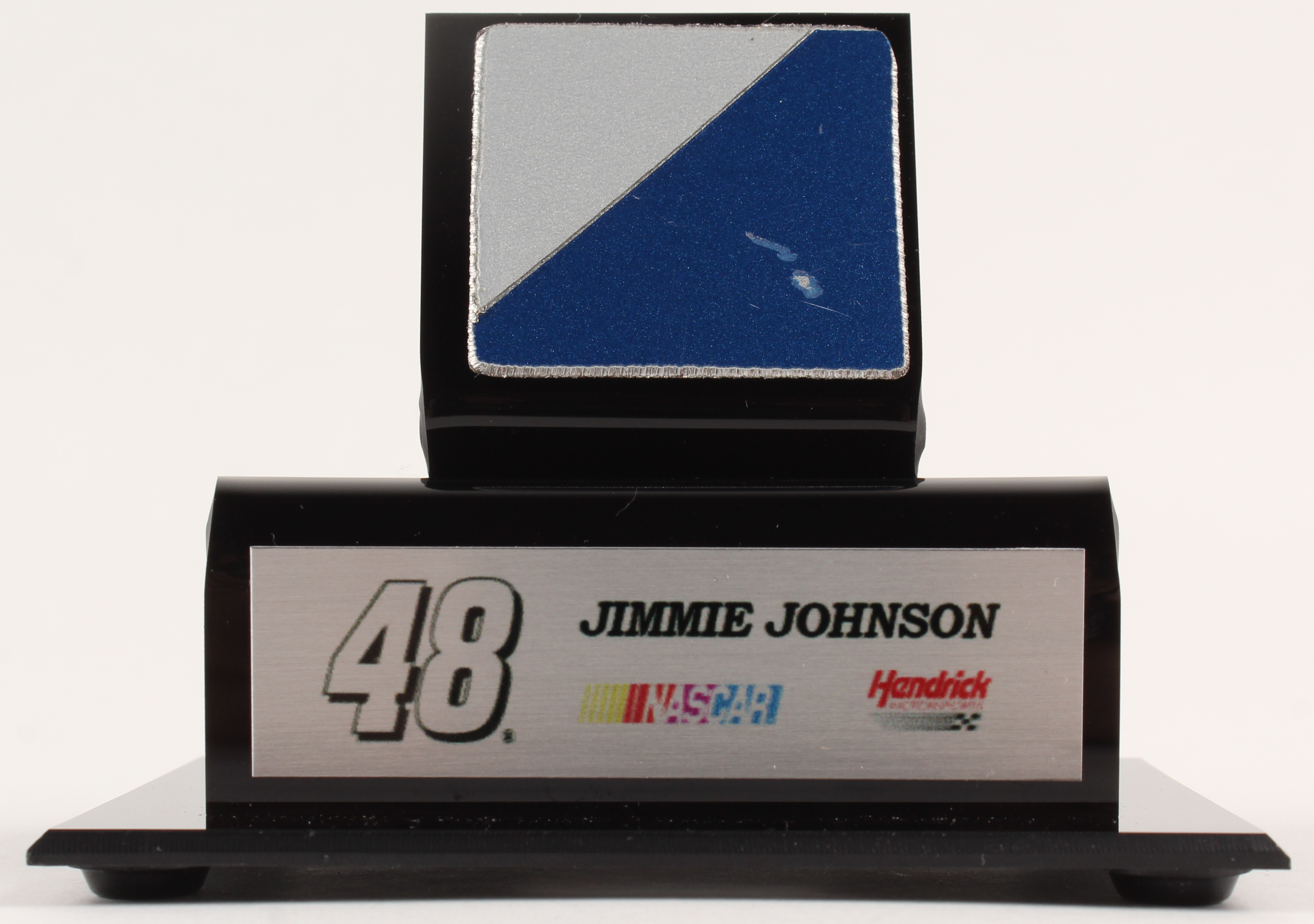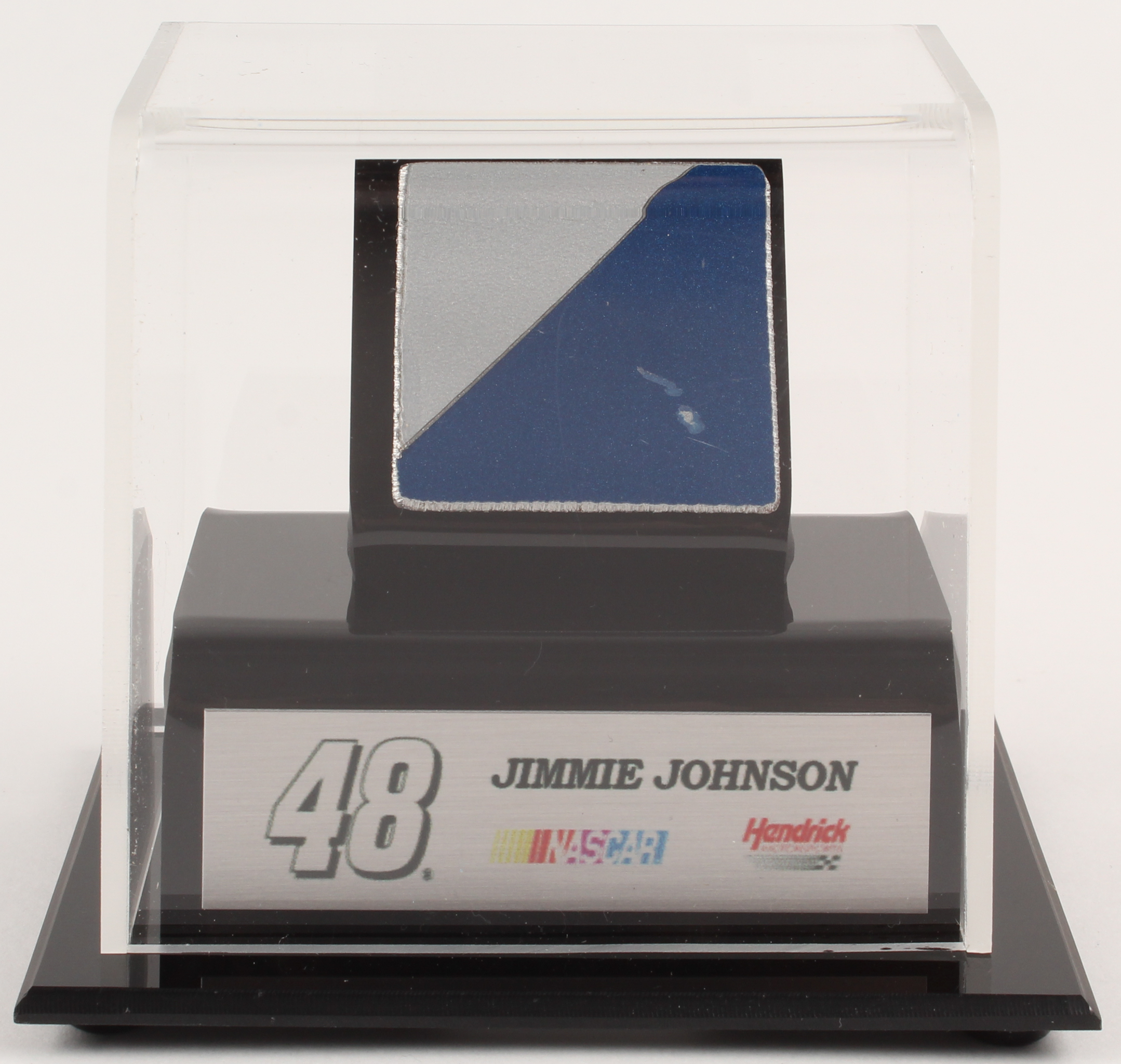 This officially licensed NASCAR display features a 1.5" x 1.5" section of race-used sheet metal from Jimmie Johnson's car.