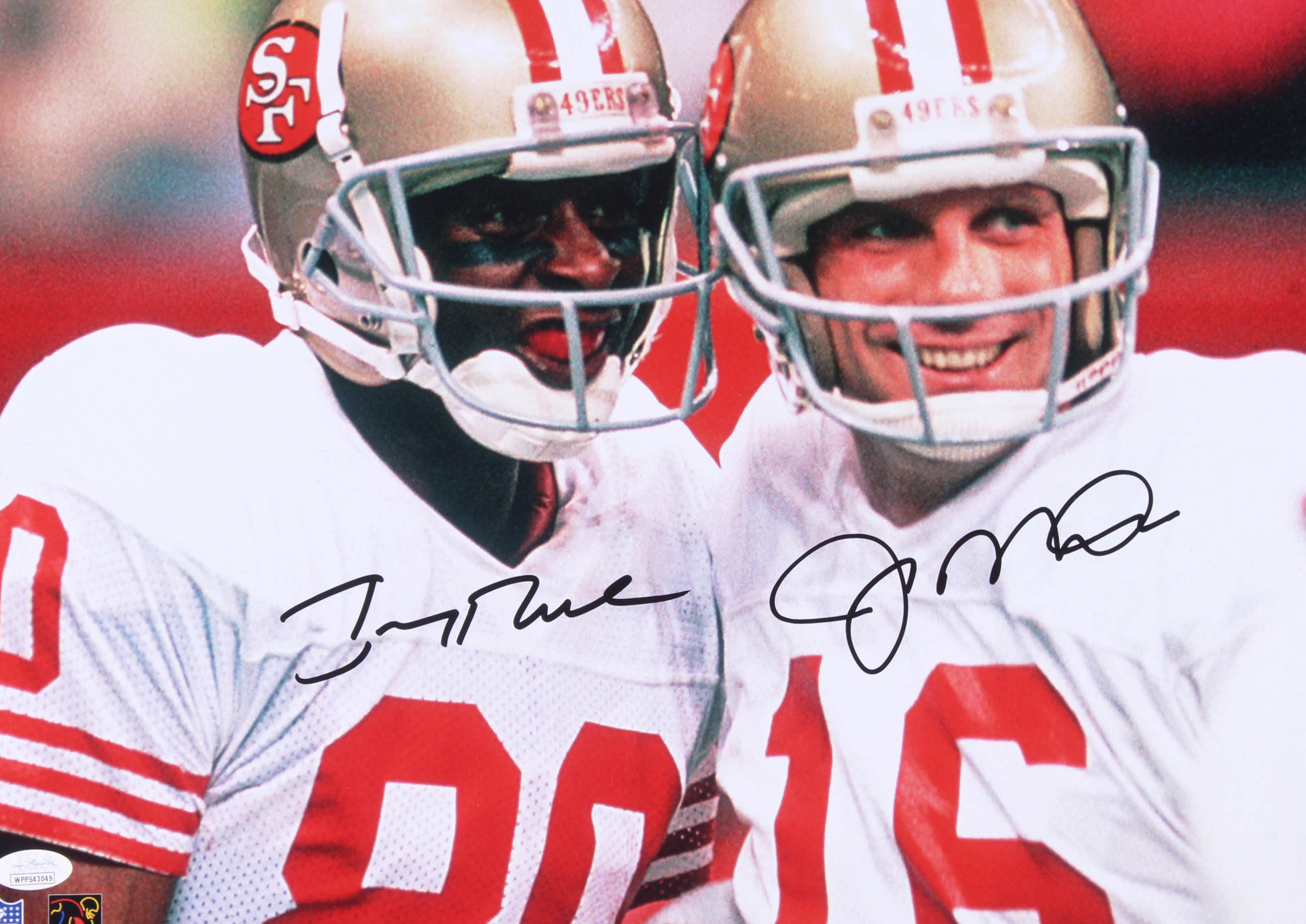 Photo measures 16" x 20" in size and has been hand-signed in black felt-tip pen by Joe Montana (San Francisco 49ers, HOF) and Jerry Rice (San Francisco 49ers, HOF).