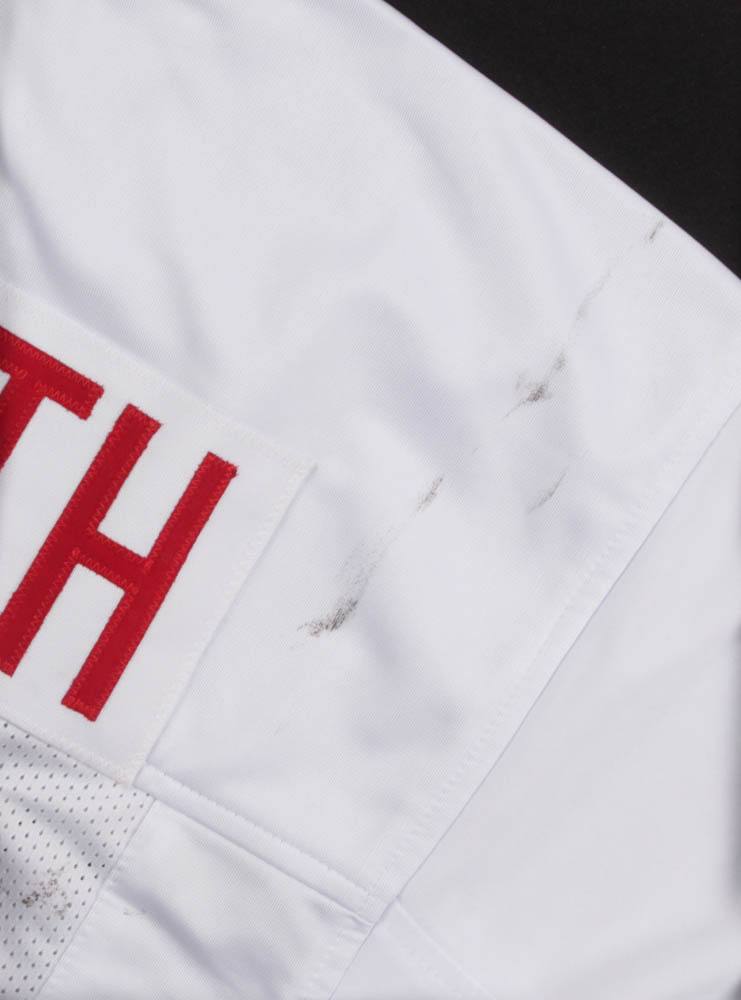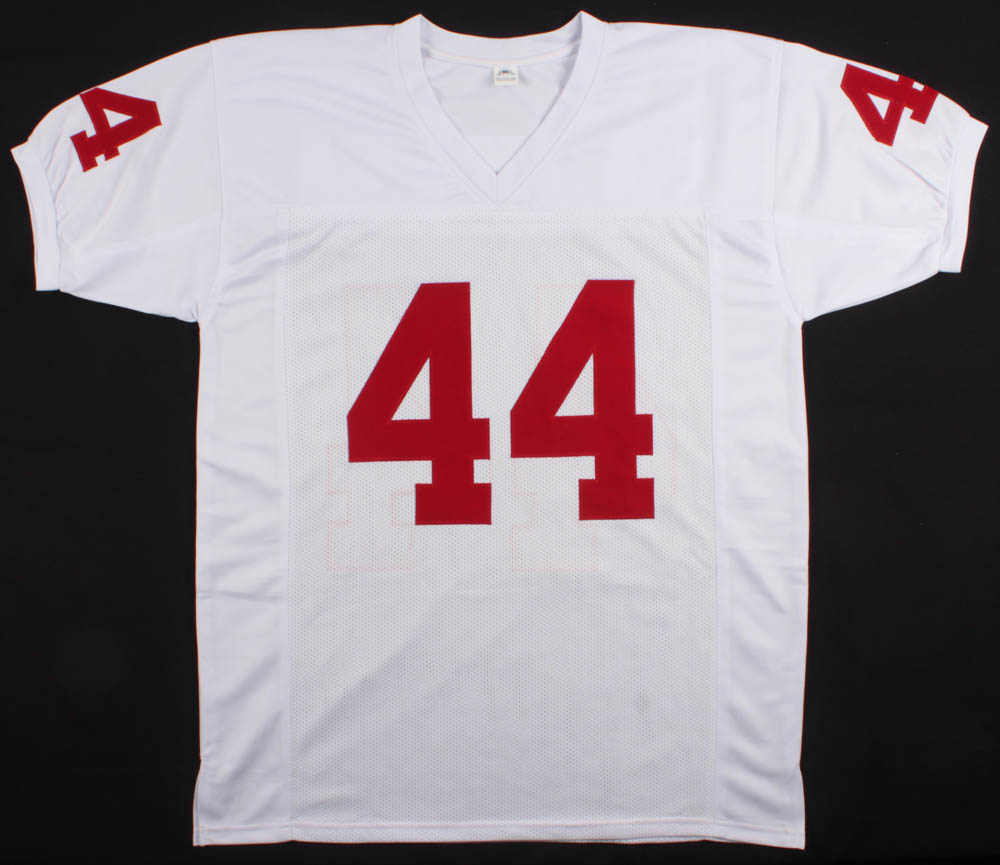 Custom on-field style jersey. Everything sewn on, size XL. Hand-signed in silver paint pen by Brian Bosworth.