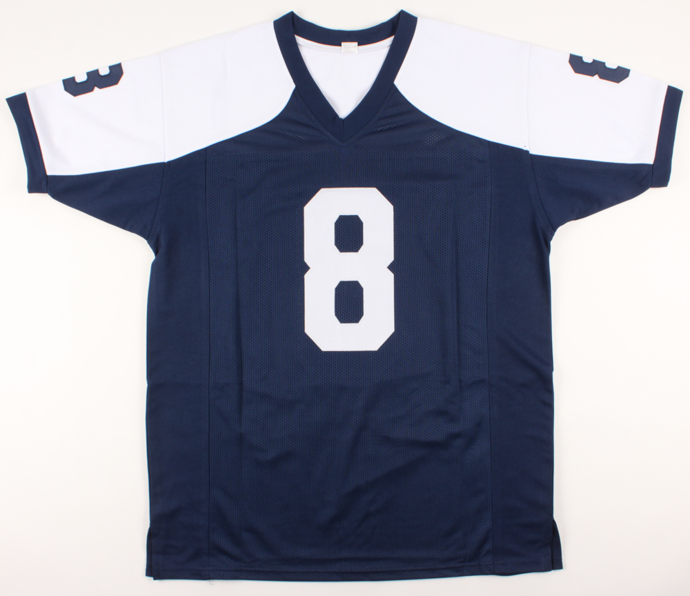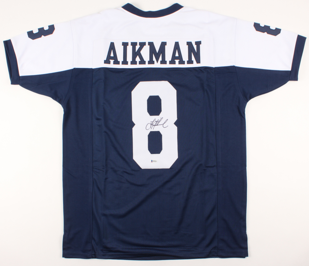 Custom on-field style jersey. Everything is sewn on, size XL. Hand-signed in black felt-tip pen by Troy Aikman (HOF).