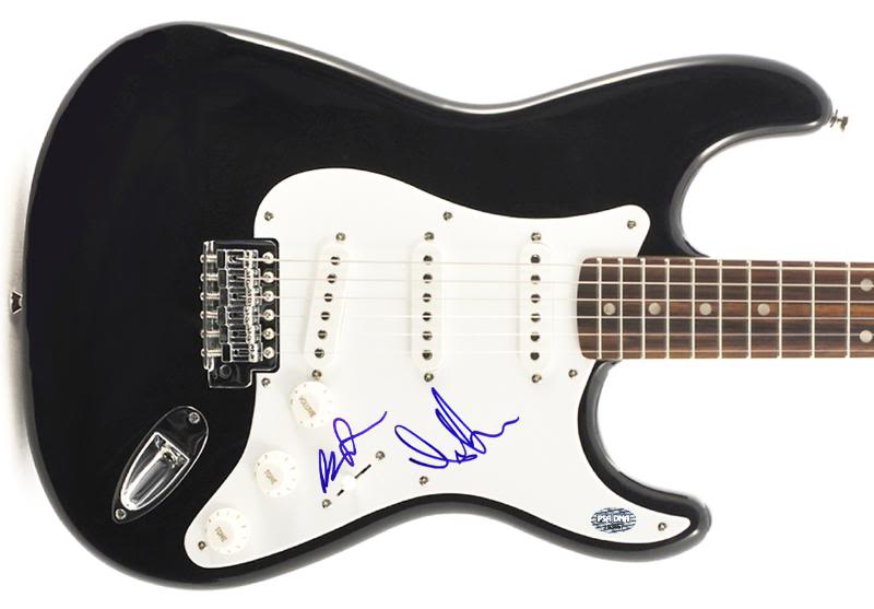 Full-size electric guitar has been hand-signed in blue felt-tip pen by Andrew VanWyngarden and Ben Goldwasser.