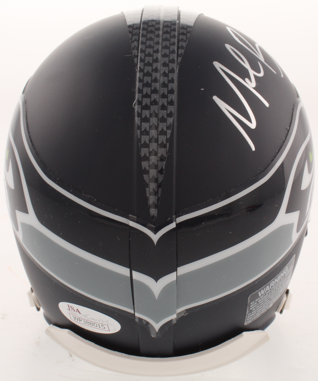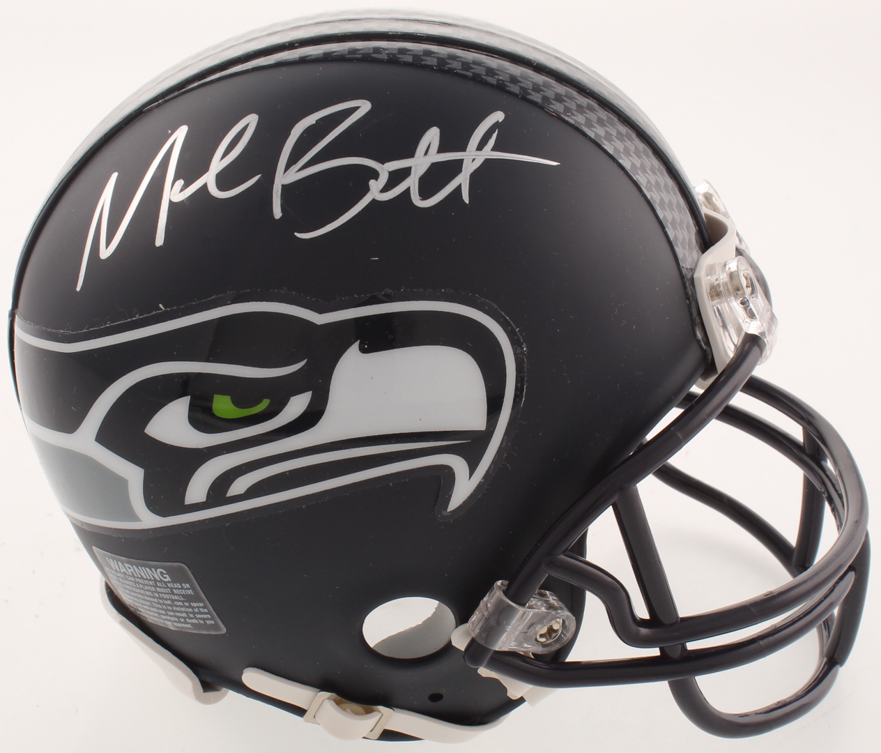 Seattle Seahawks matte black mini helmet has been hand-signed in silver paint pen by Michael Bennett.