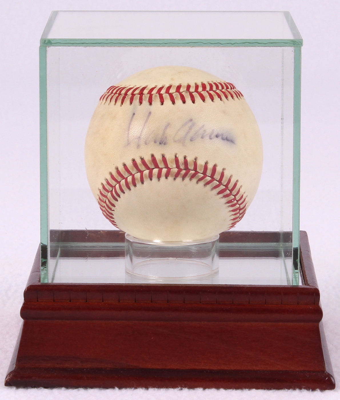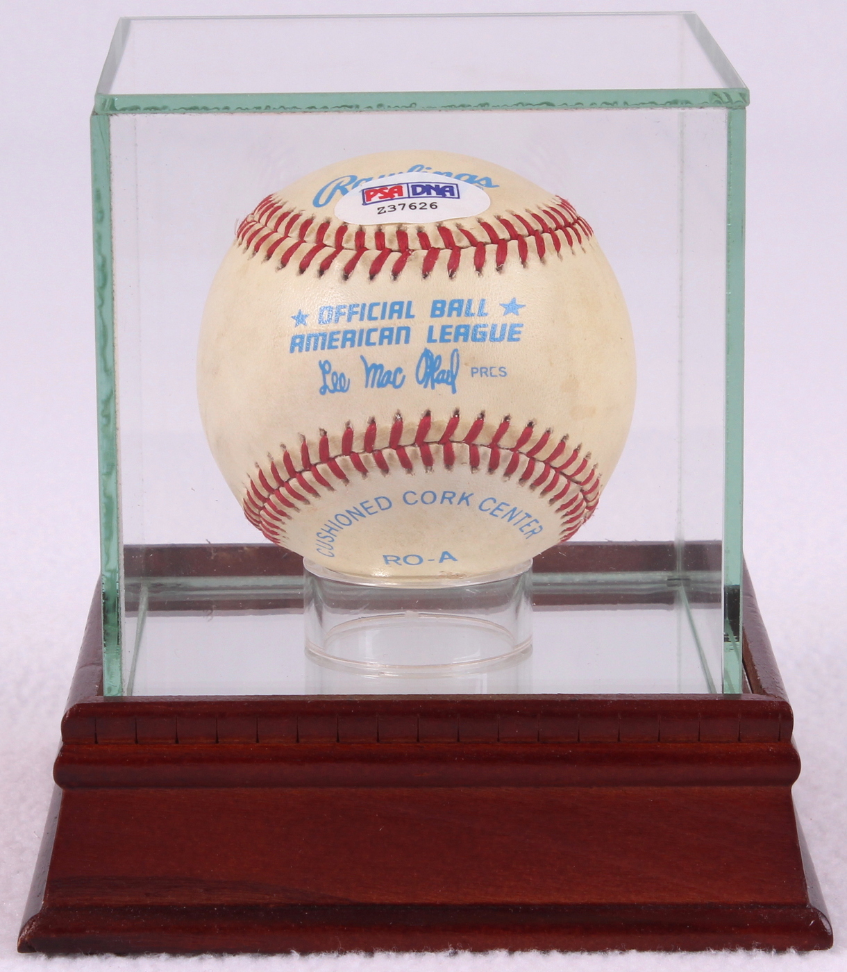 Rawlings Official American League Baseball. Hand-signed in black felt-tip pen by Hank Aaron (Braves HOF). The auction also includes a Steiner display case with a wood base and glass cube. The autograph includes an official PSA/DNA hologram and matching COA for authenticity purposes.