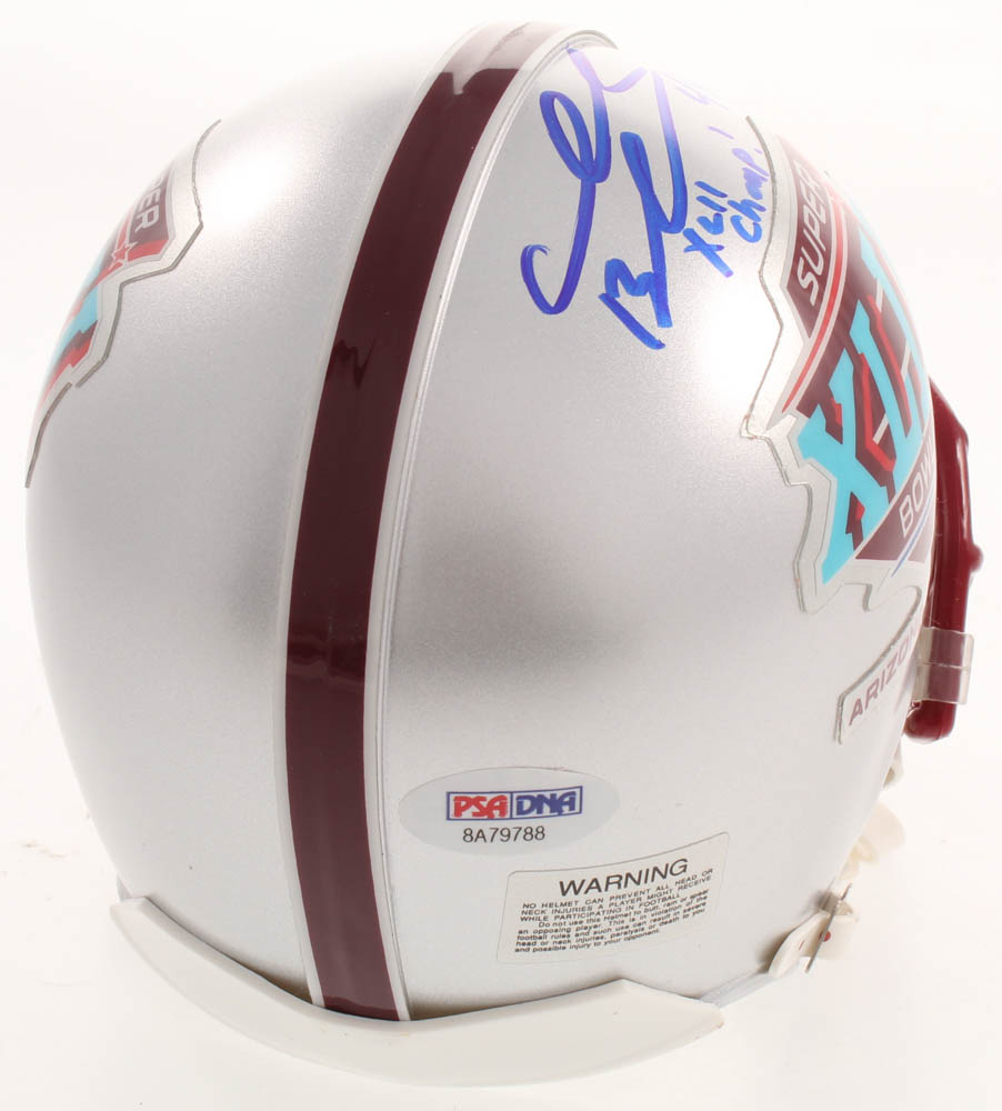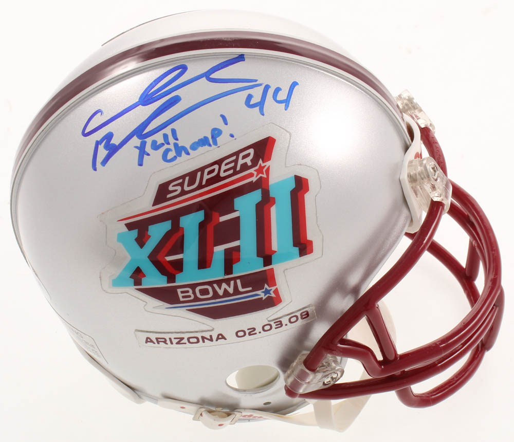 Riddell Super Bowl XLII logo mini helmet. Hand-signed and inscribed in blue felt tip pen by Ahmad Bradshaw. (New York Giants)