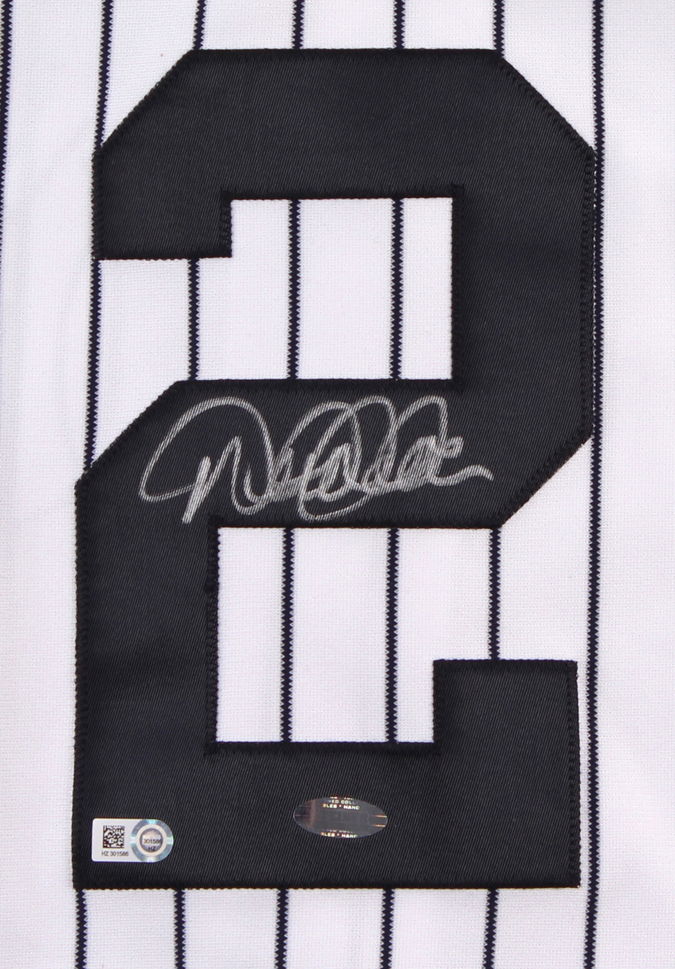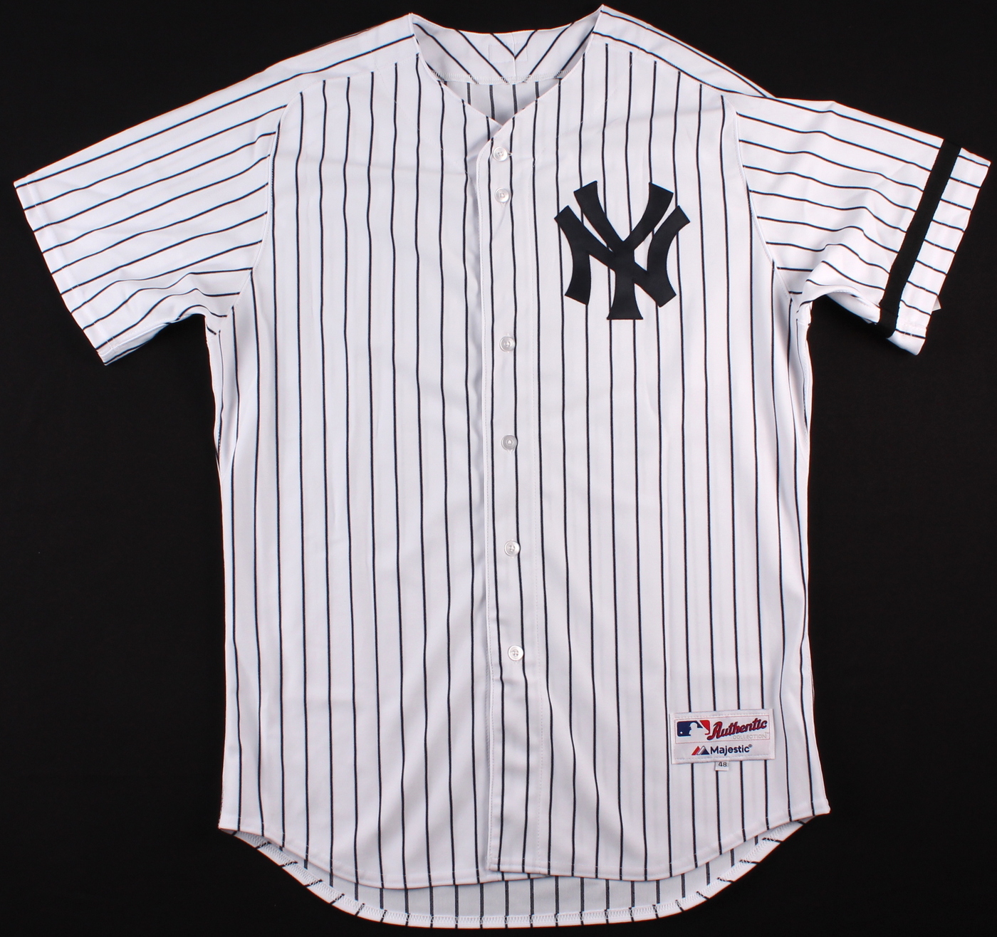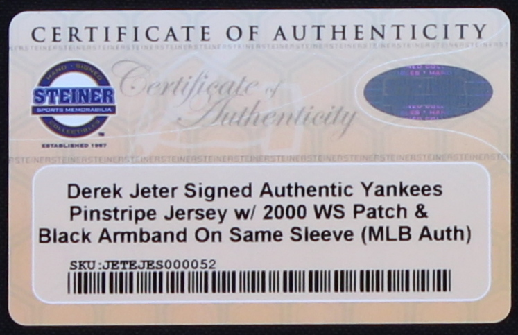 Majestic authentic on-field style jersey. Everything sewn on, size 48. Hand-signed in silver paint pen by Derek Jeter (Yankees). The sleeves of the jersey includes a commemorative World Series 2000 patch and a black armband on the same sleeve. The autograph includes an official Steiner hologram and matching COA and an official MLB Authentication hologram for authenticity purposes.