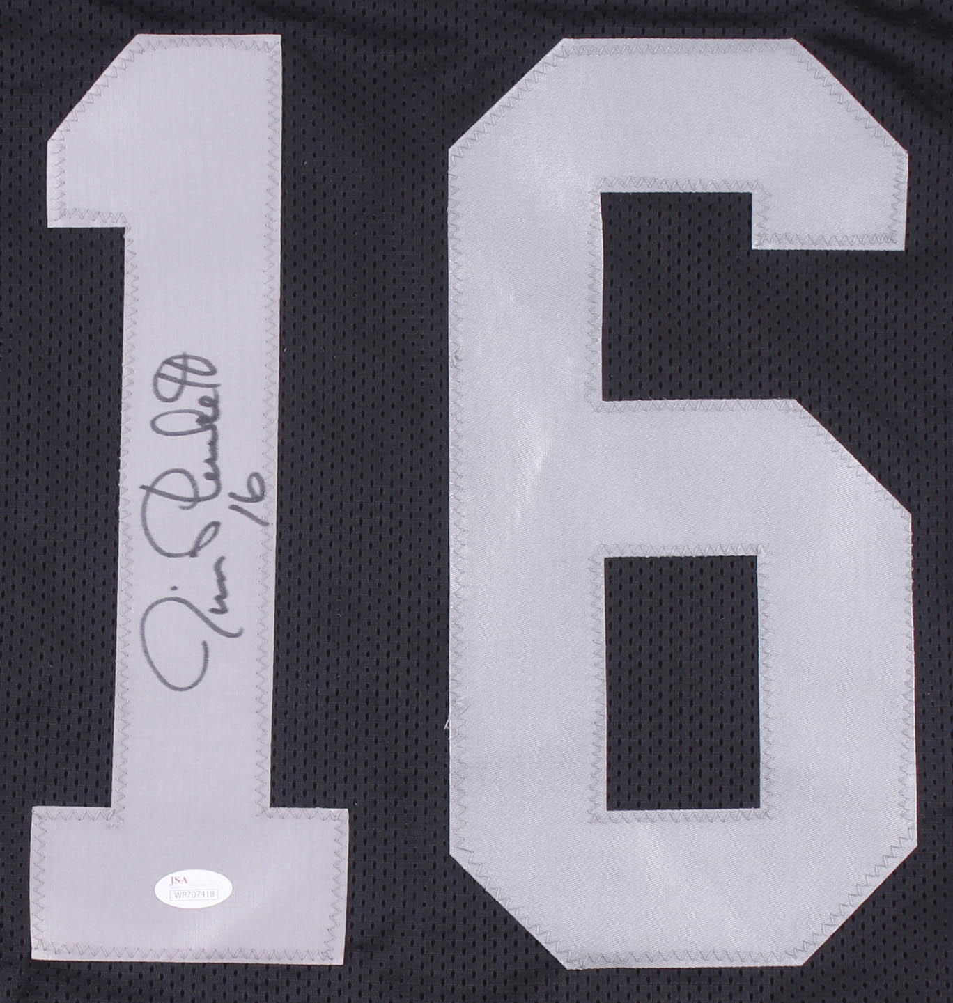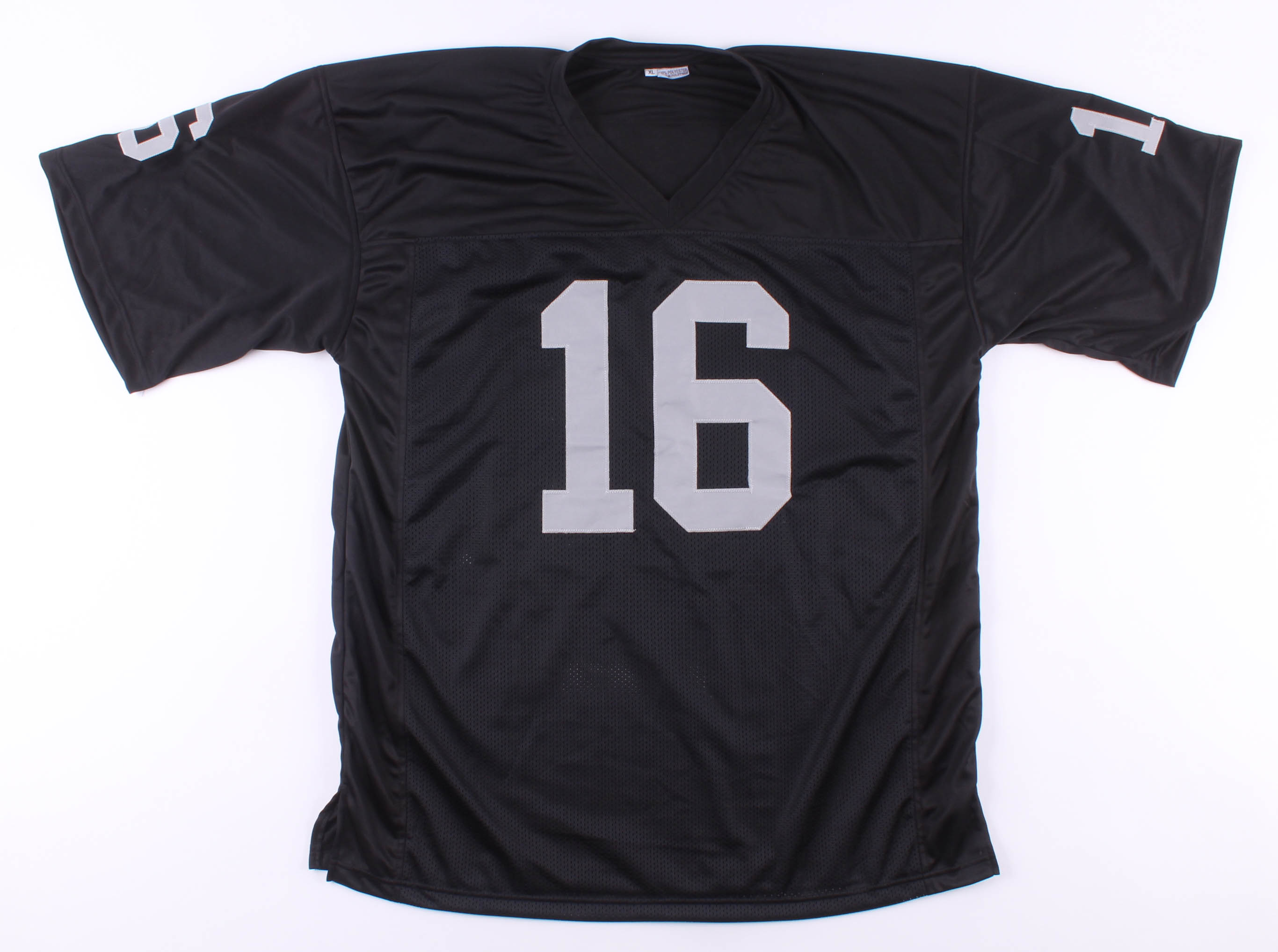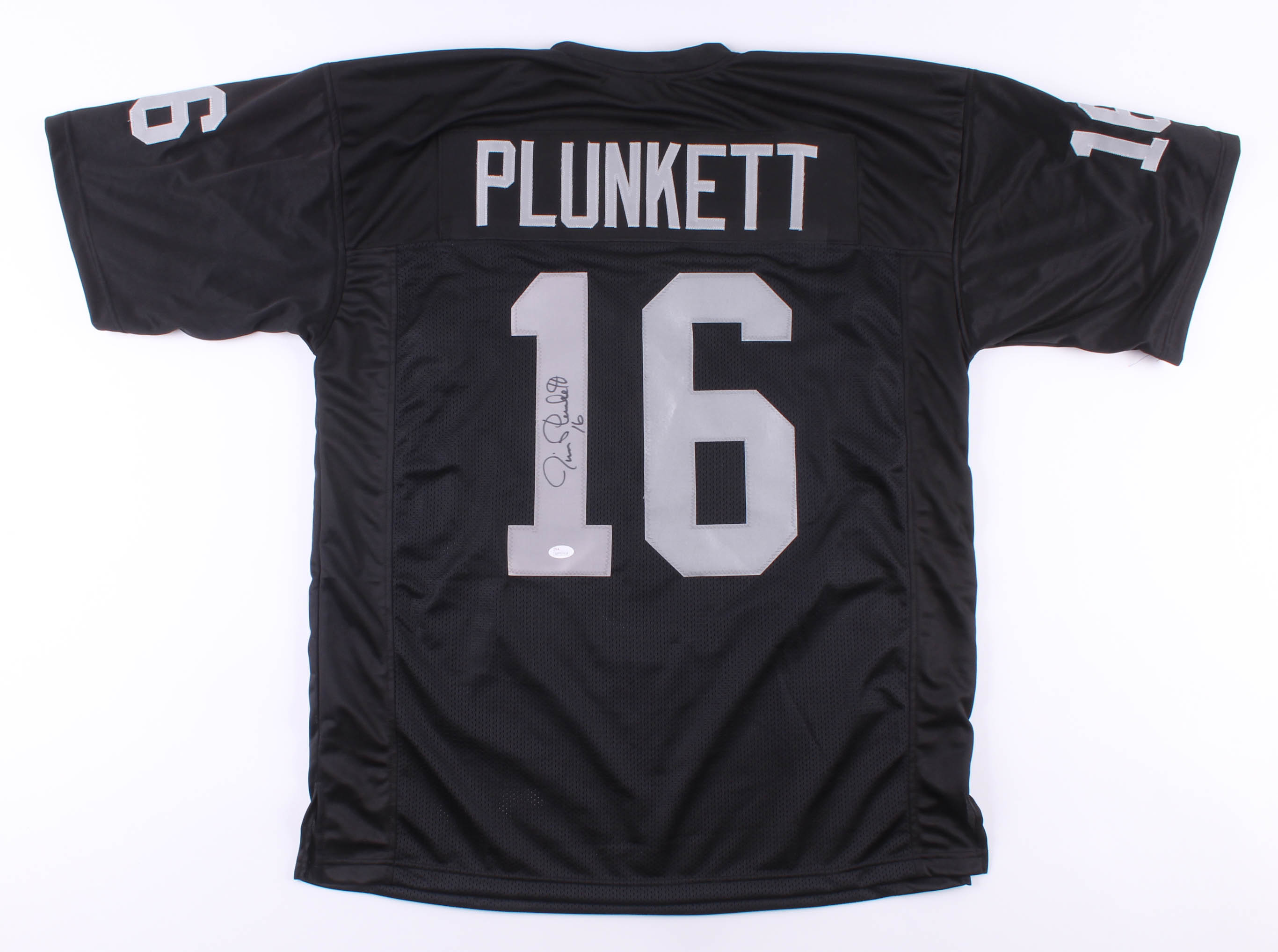Custom on-field style jersey. Everything sewn on, size XL. Hand-signed in black felt-tip pen by Jim Plunkett.