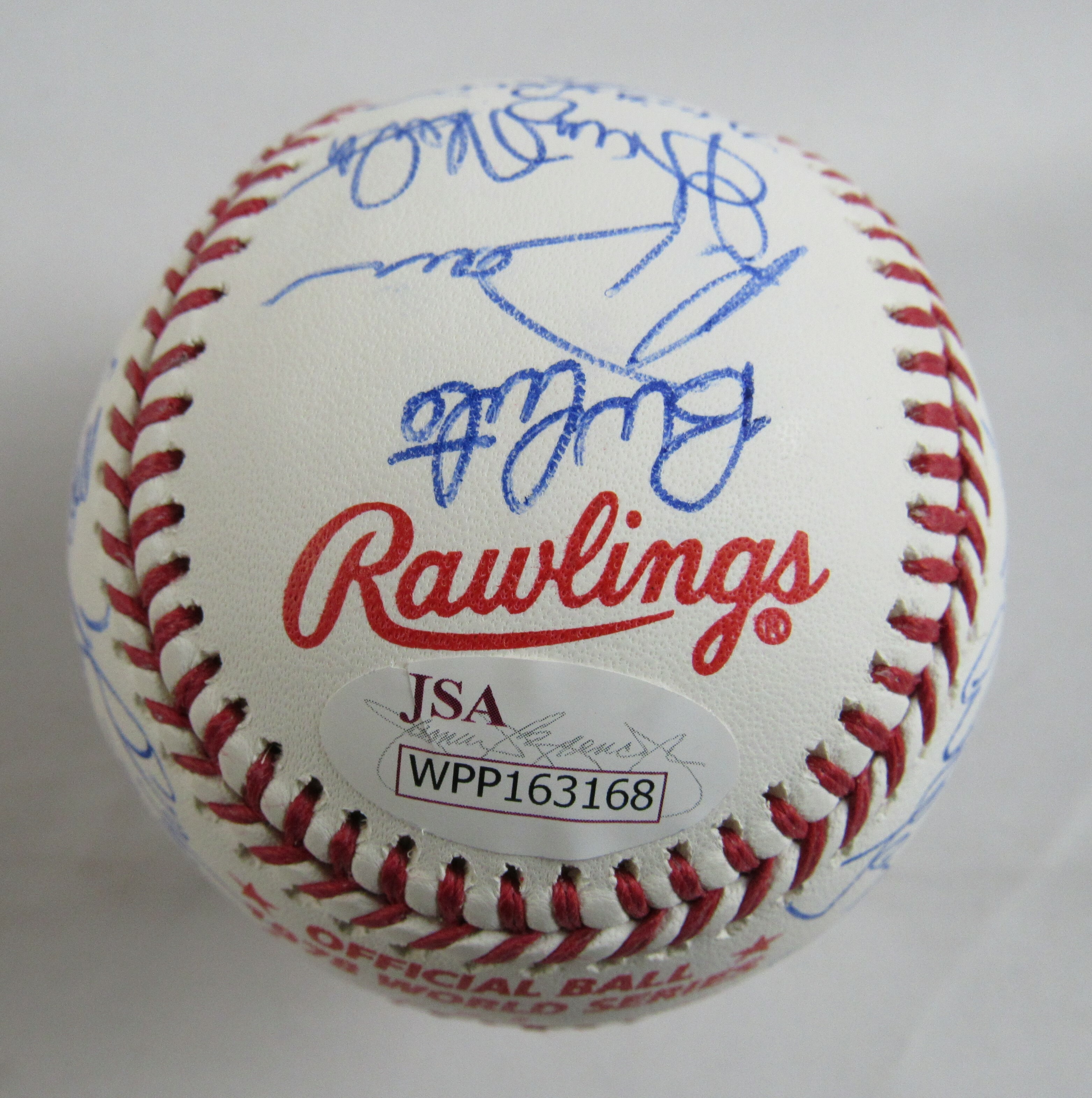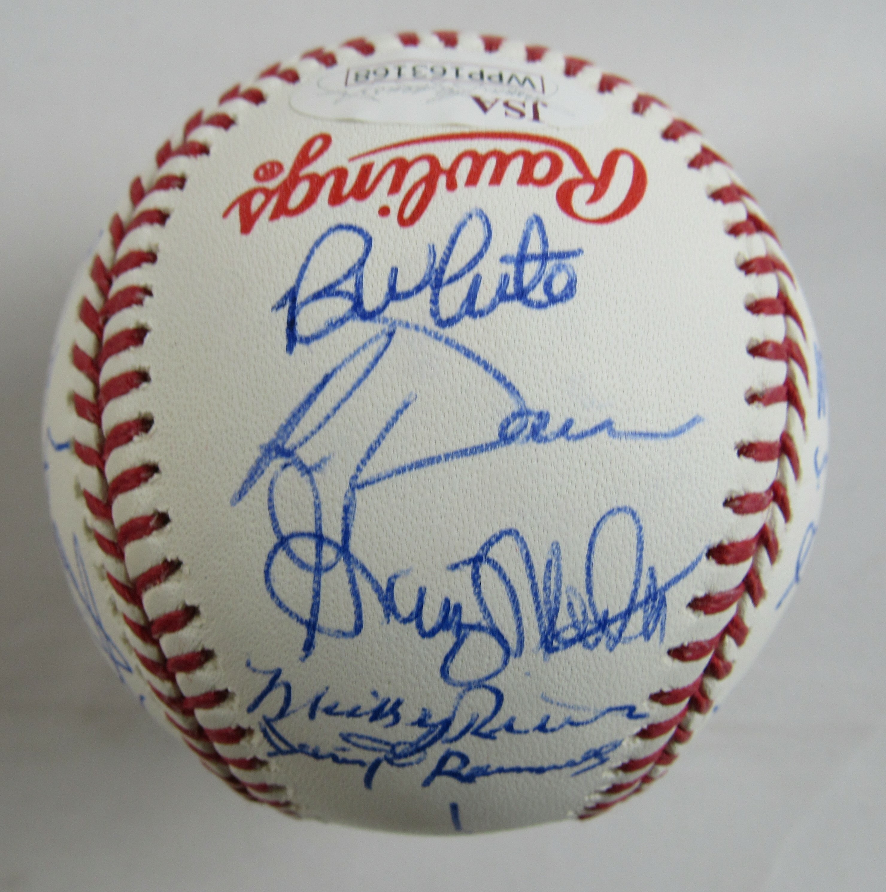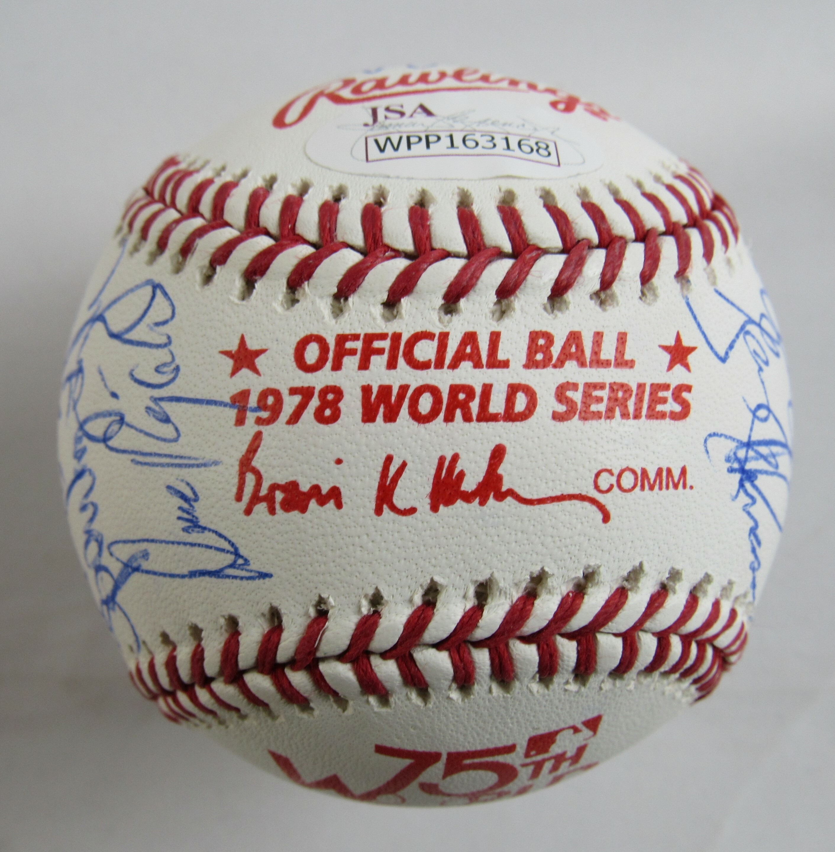 Rawlings Official Major League baseball. Hand-signed in blue ink pen by (20) members of the 1978 New York Yankees including Reggie Jackson, Bucky Dent, Chris Chambliss, Larry McCall, Sparky Lyle, Dave Rajisch, Lou Piniella, Don Gullett, Fred Stanley, Ken Clay, Ed Figueroa, Gary Thomasson, Willie Randolph, Goose Gossage, Ron Guidry, Roy White, Ron Davis, Graig Nettles, Mickey Rivers and Domingo Ramos.