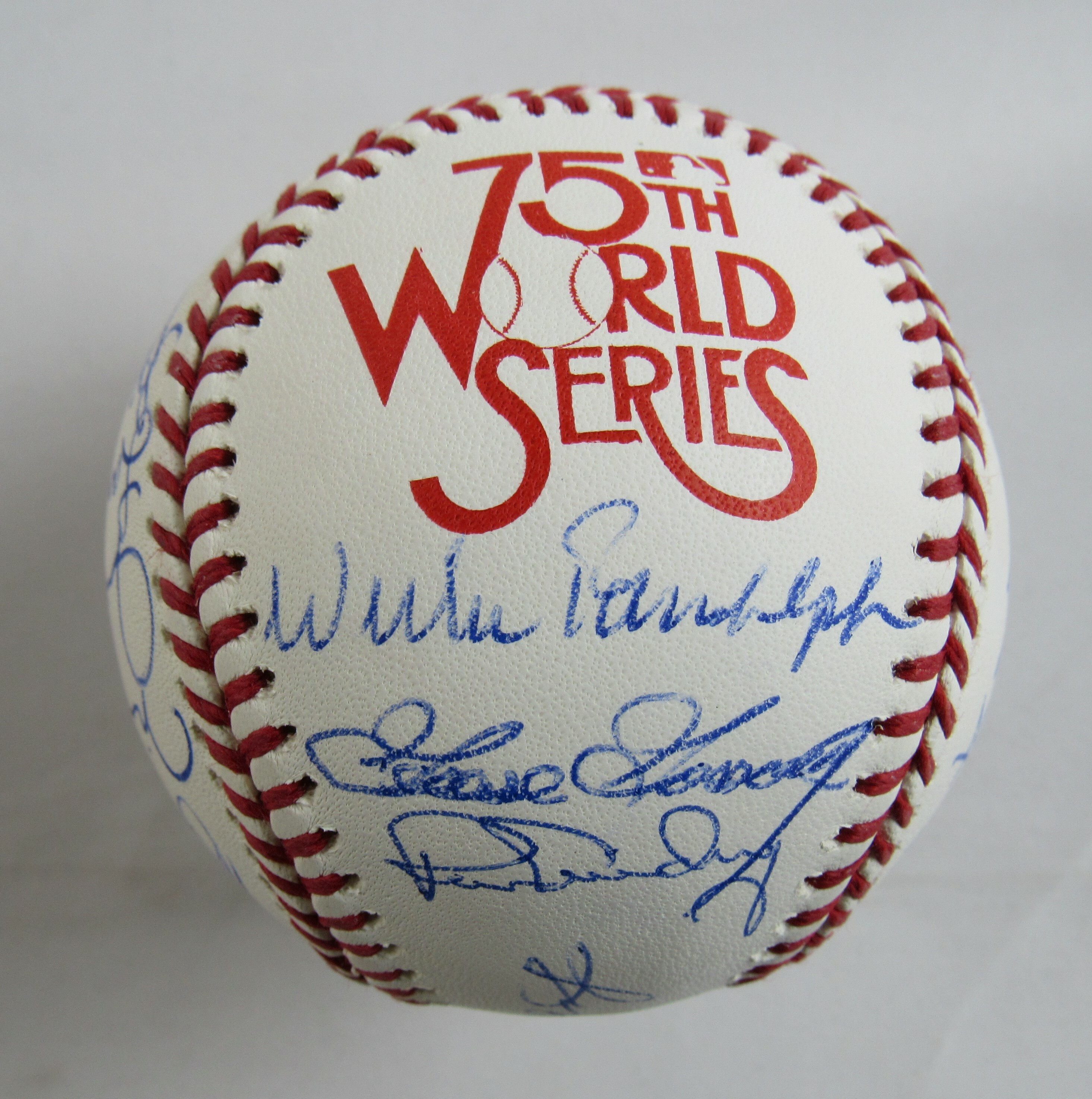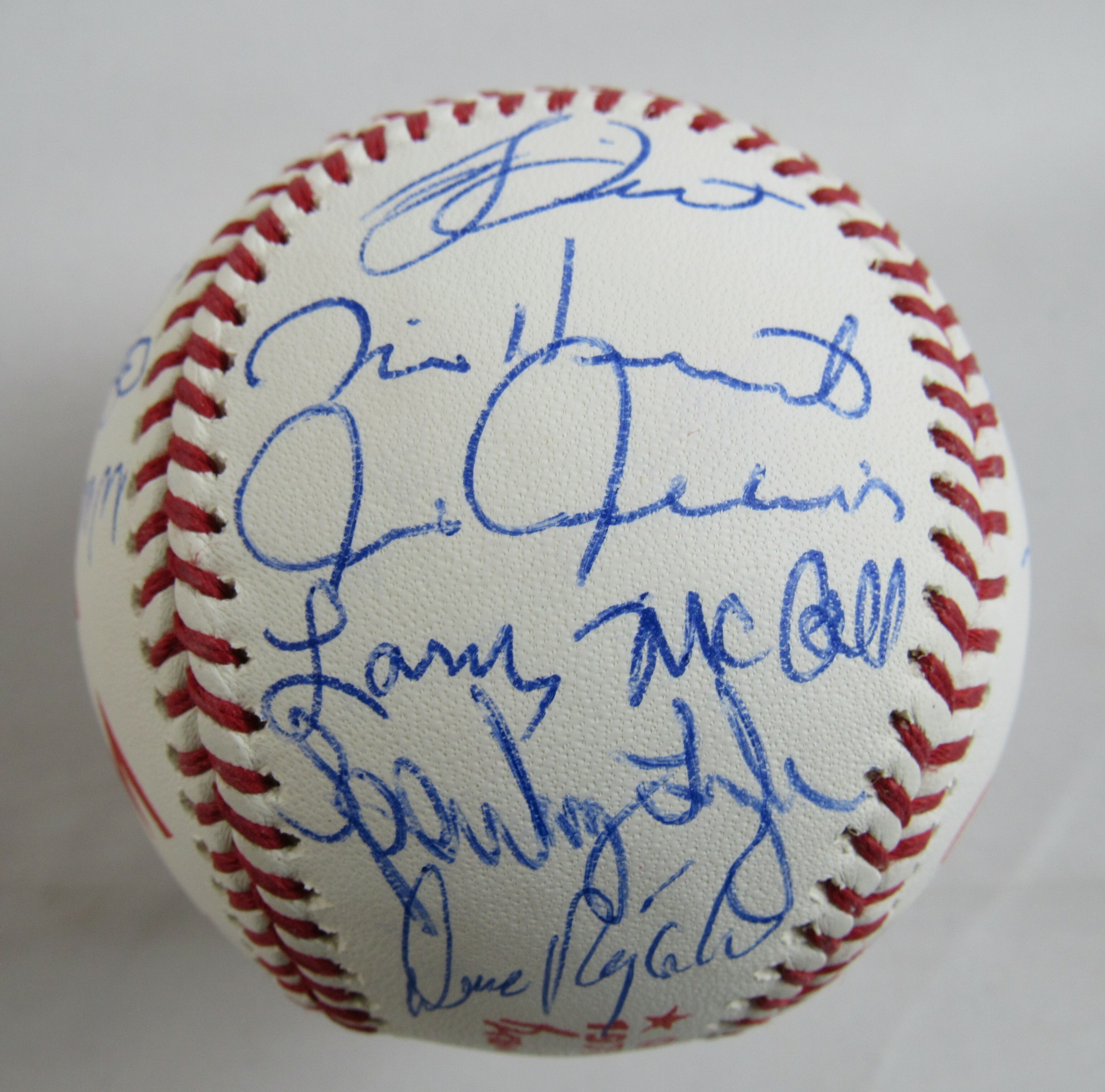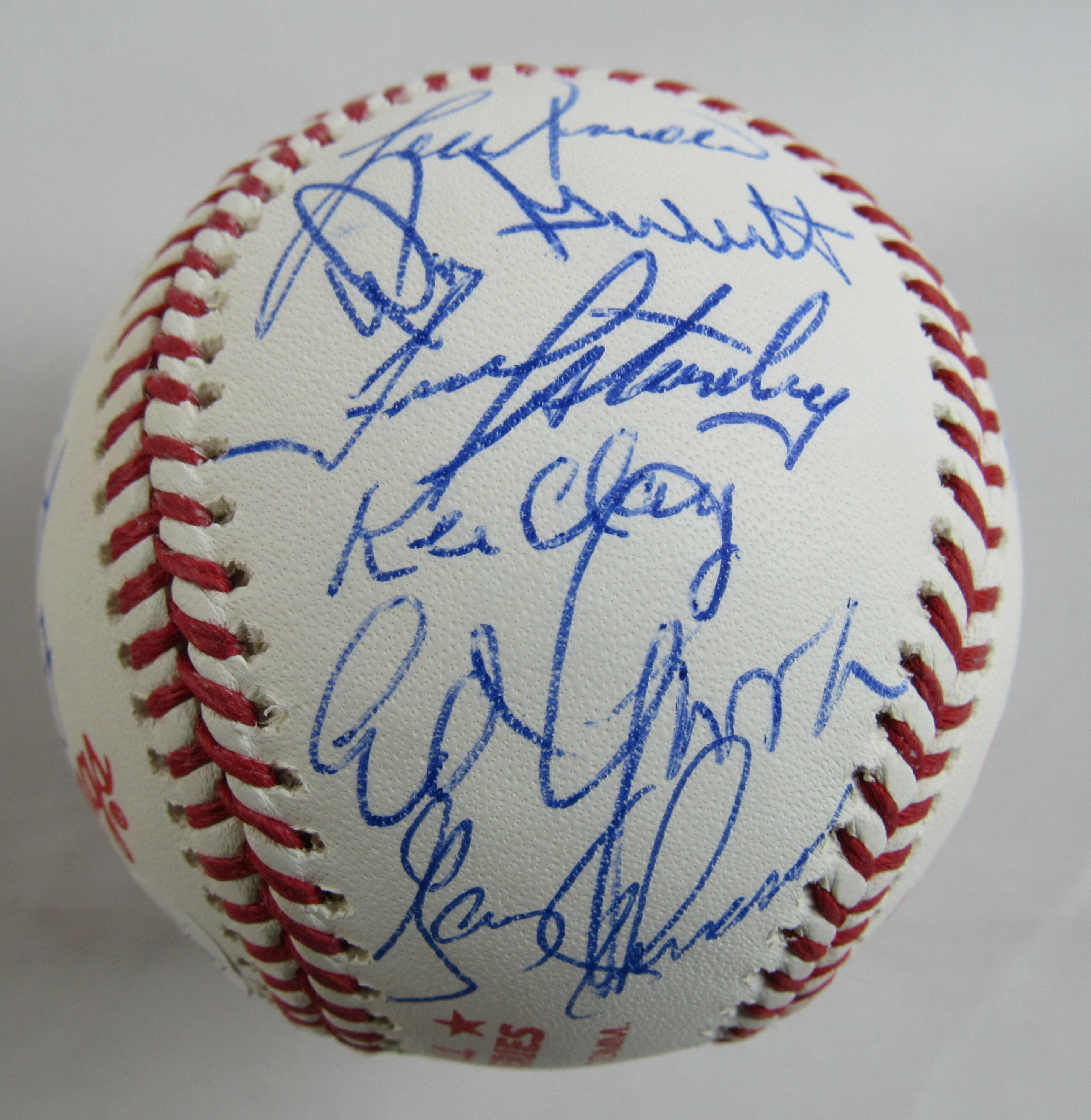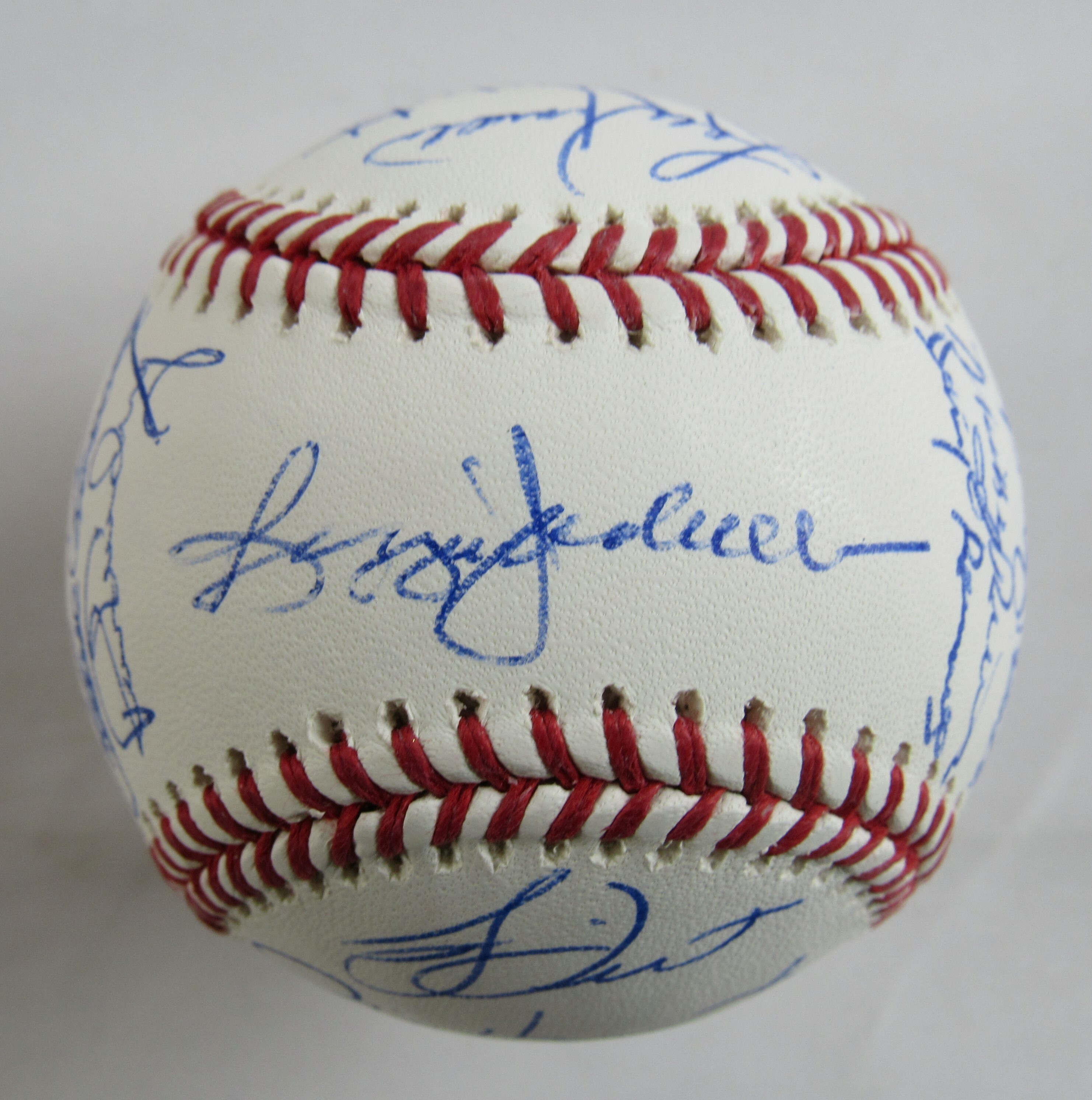Rawlings Official Major League baseball. Hand-signed in blue ink pen by (20) members of the 1978 New York Yankees including Reggie Jackson, Bucky Dent, Chris Chambliss, Larry McCall, Sparky Lyle, Dave Rajisch, Lou Piniella, Don Gullett, Fred Stanley, Ken Clay, Ed Figueroa, Gary Thomasson, Willie Randolph, Goose Gossage, Ron Guidry, Roy White, Ron Davis, Graig Nettles, Mickey Rivers and Domingo Ramos.