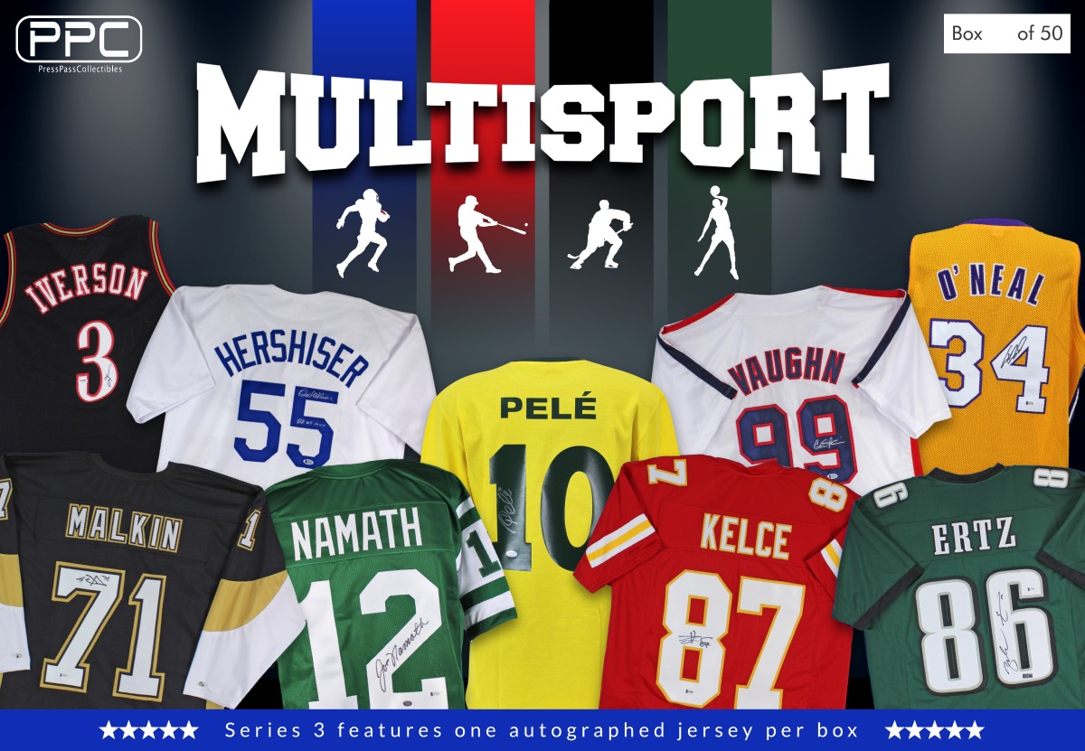The Press Pass Collectibles 2020 Multi-Sport Jersey mystery box includes one (1) custom jersey from one of four major sports, (NFL, NBA, MLB, NHL). Mega hit boxes will feature jerseys signed by Allen Iverson, Zach Ertz, Charlie Sheen, Magic Johnson, and many more!