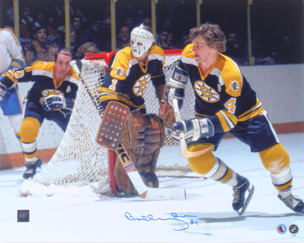 Photo measures 16" x 20" in size and is hand-signed in blue felt tip pen by Bobby Orr (Boston Bruins, HOF).