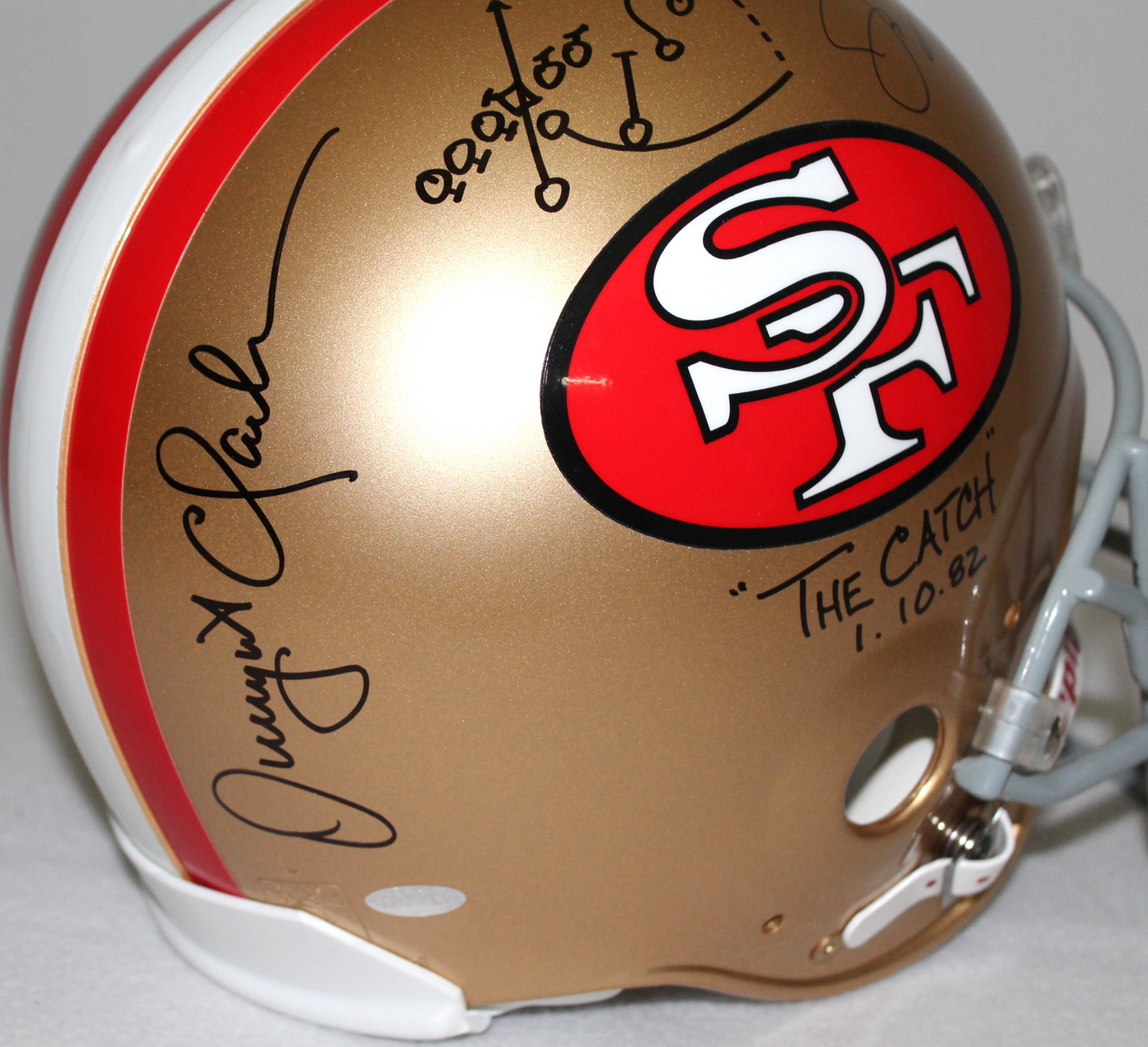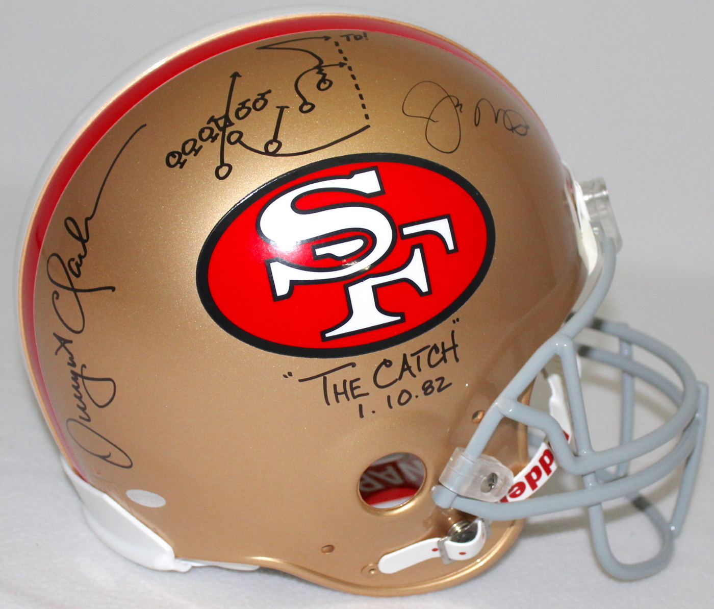 Dwight Clark & Joe Montana Signed 49ers Full-Size Authentic Pro-Line Helmet Inscribed "The Catch" & "1-10-82" with Hand-Drawn Play (Steiner COA)