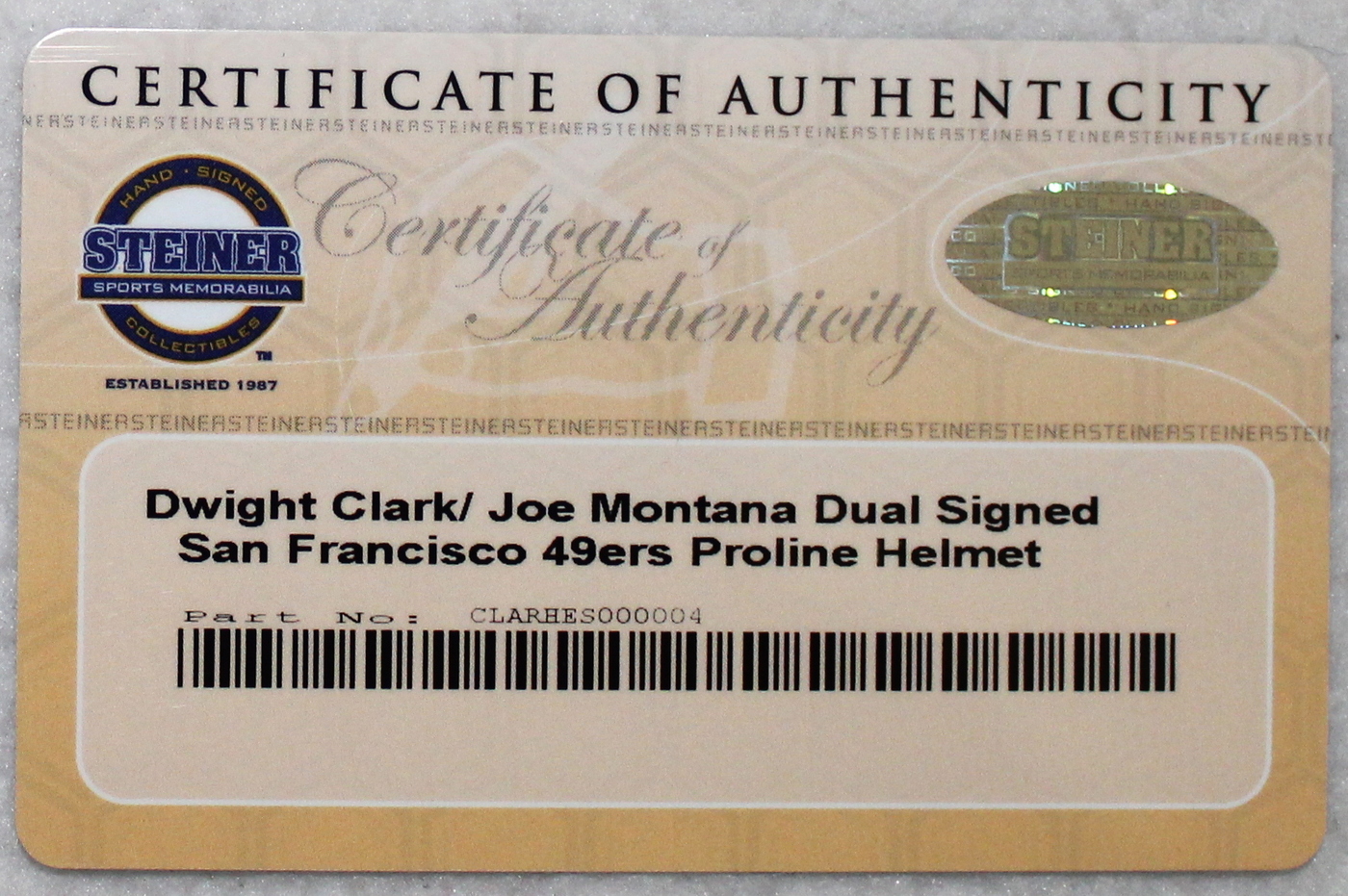 Riddell full-size authentic pro-line helmet. Hand-signed and inscribed in black felt tip by Dwight Clark and hand-signed by Joe Montana. The autograph includes an official Steiner hologram and matching COA for authenticity purposes.