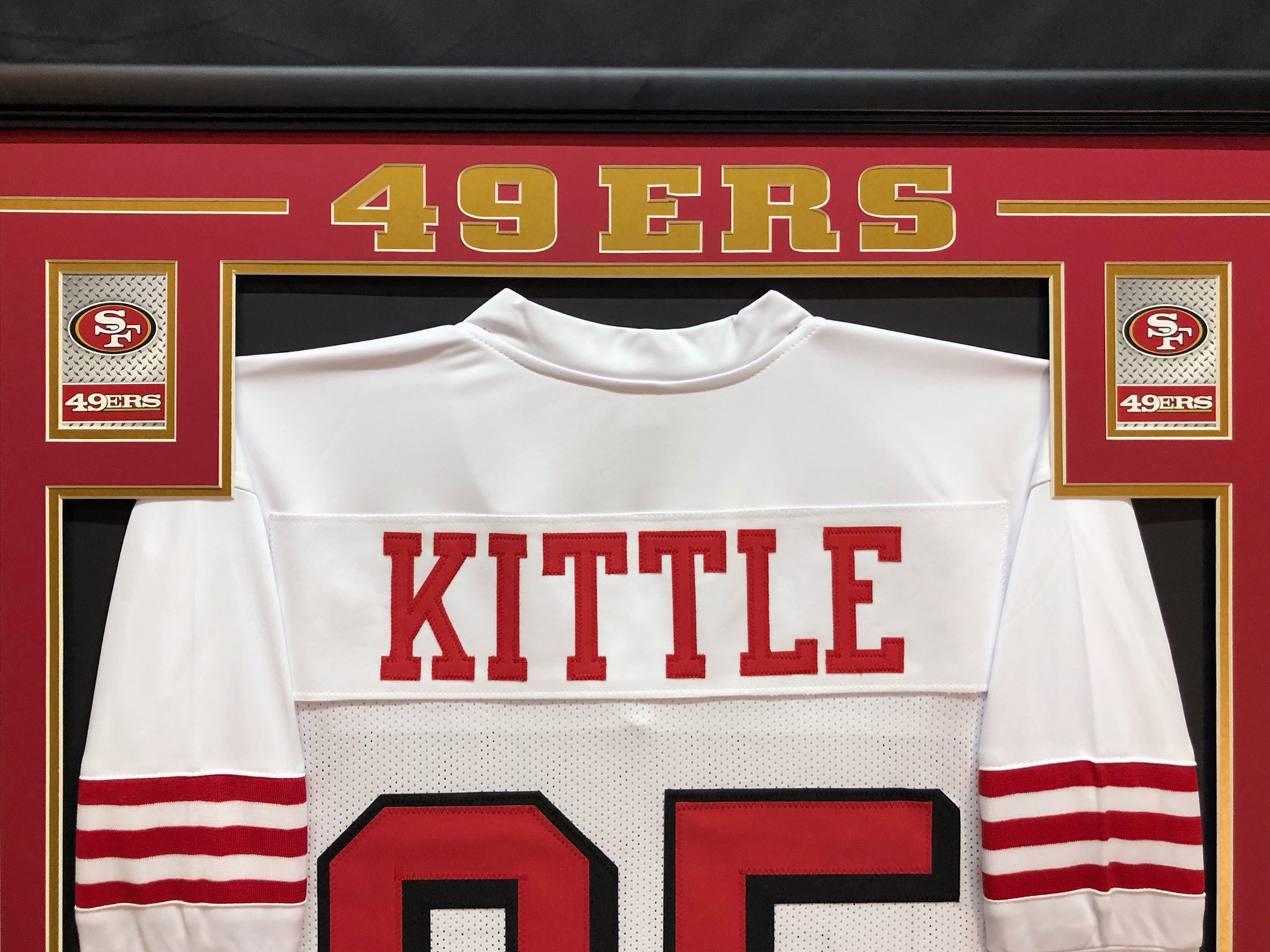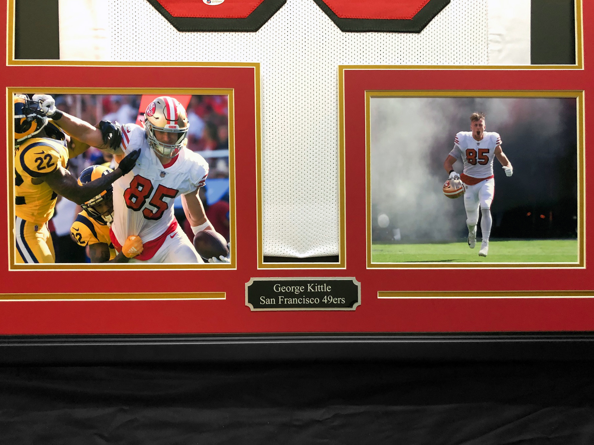 Custom frame measures approximately 34.5" x 42.5" in size and showcases a jersey which has been hand-signed in black felt-tip pen by George Kittle (San Francisco 49ers). High quality framing includes the following unique features: Jersey is hand-sewn to the back mat board, framed with real wood molding, ultra strong and crystal clear UV-resistant acrylic, (2) licensed logo cards, (2) 8x10 photos, and a double-layer laser-engraved metal nameplate.
