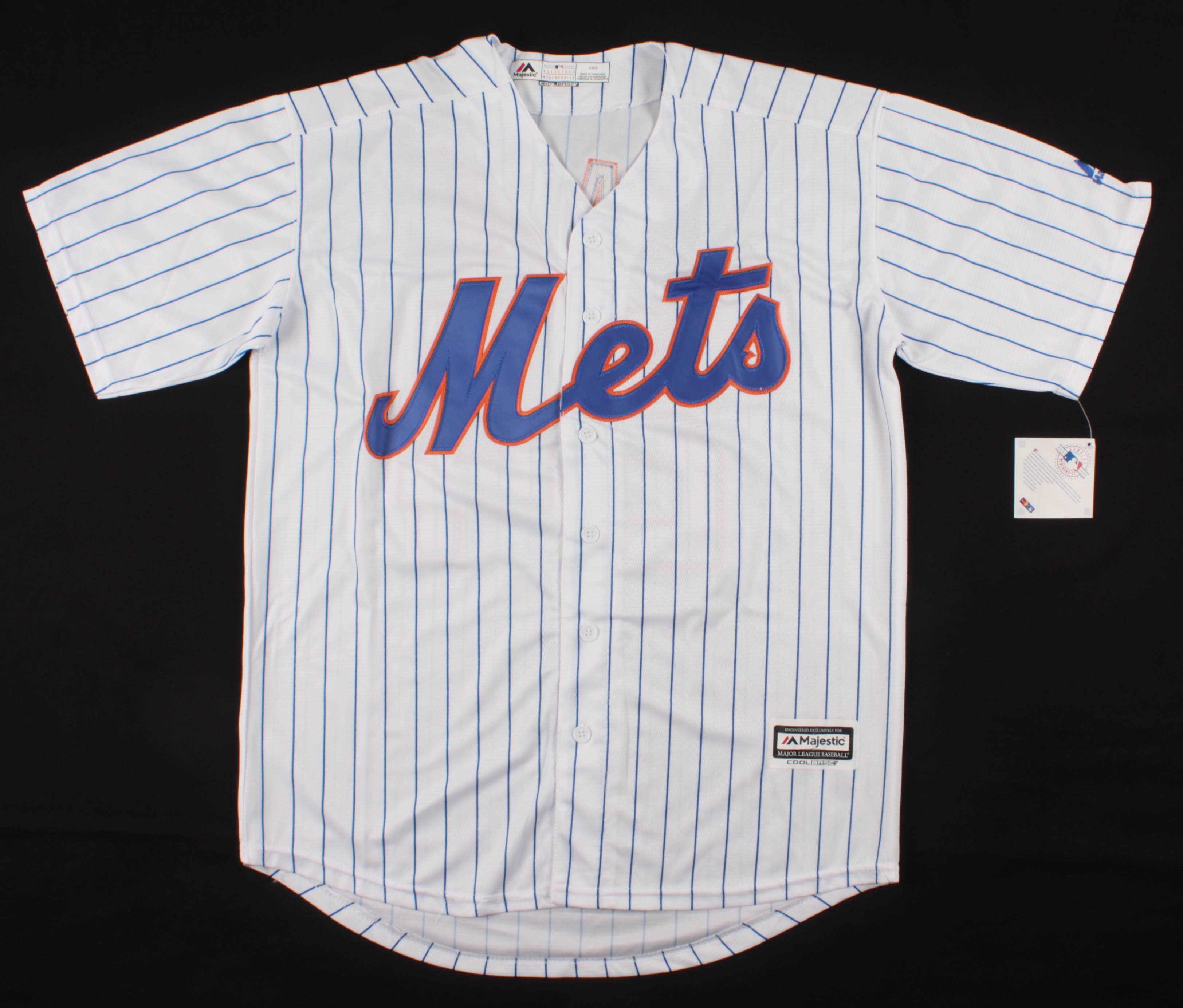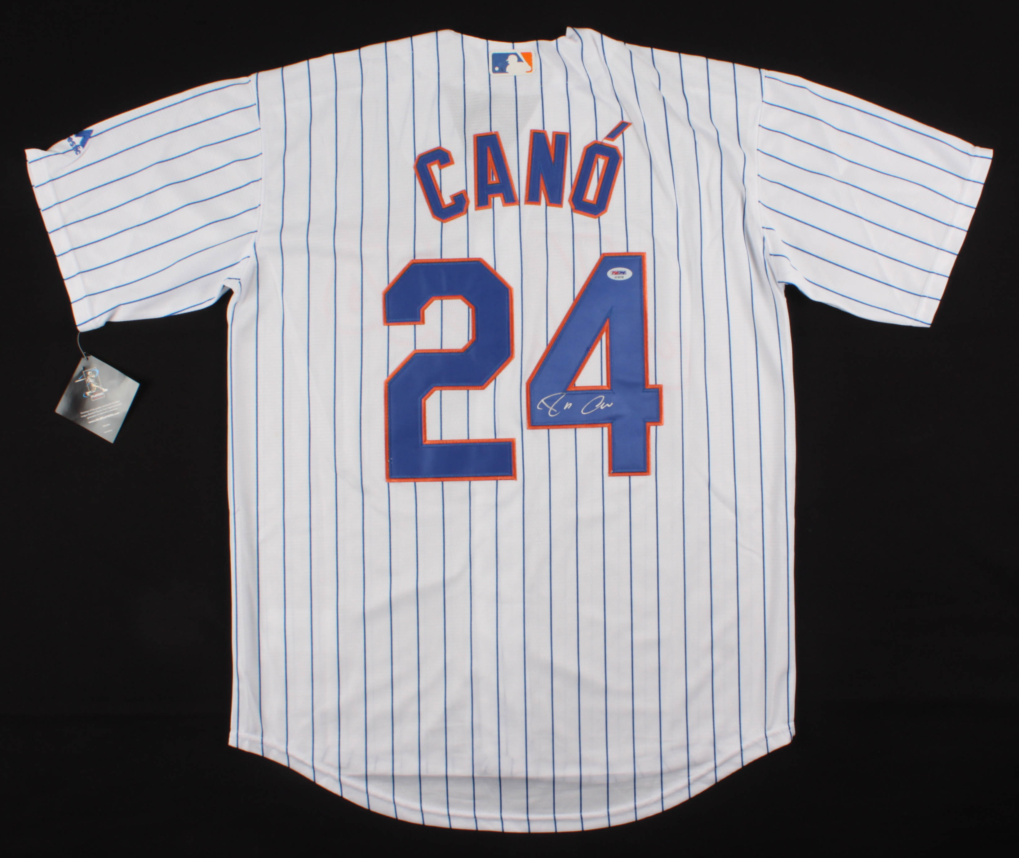 Majestic on-field style jersey. Everything is sewn on, size L. Hand-signed in silver paint pen by Robinson Cano (New York Mets).