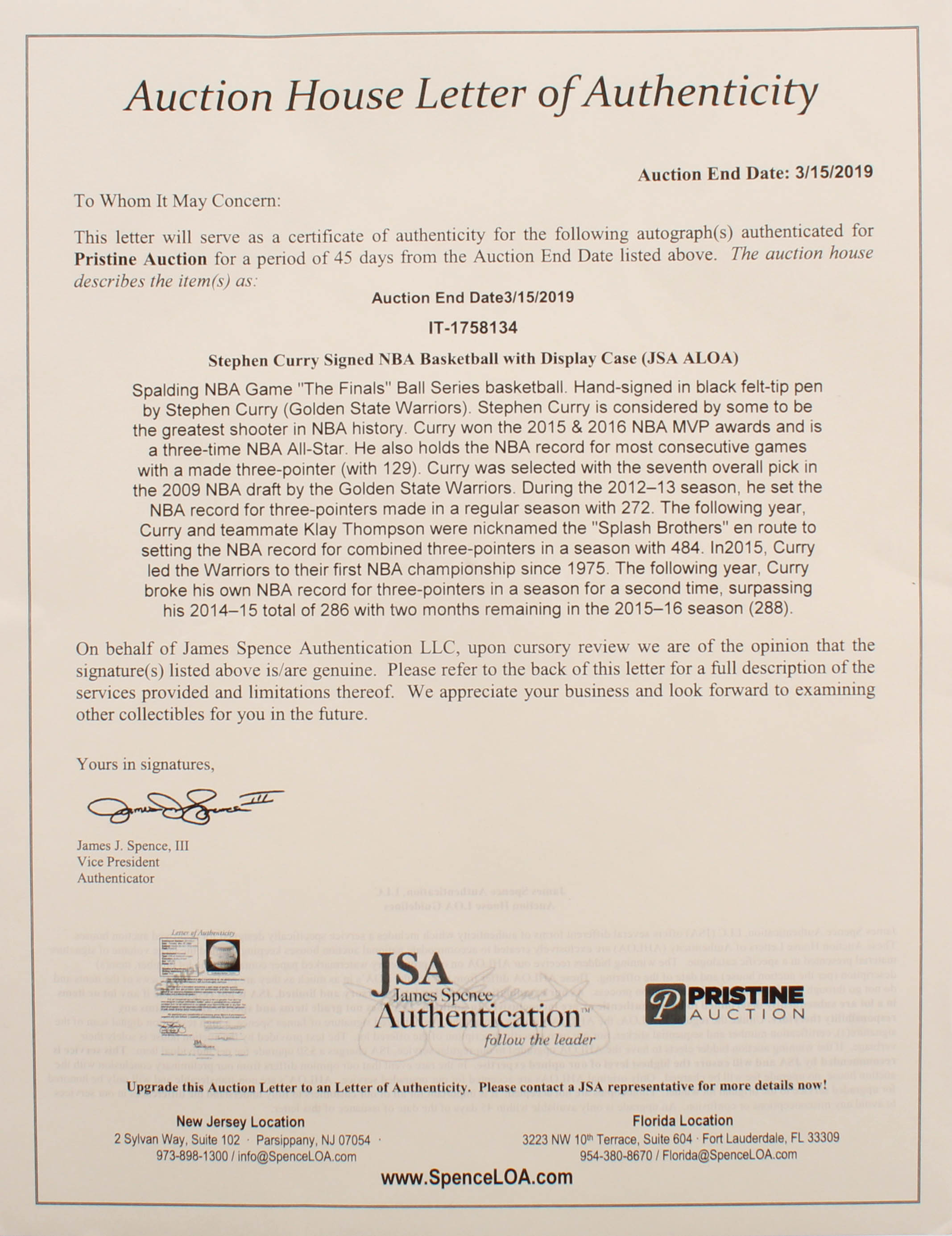 Stephen Curry Signed LE NBA "The Finals" Game Ball Series Basketball (JSA ALOA)
