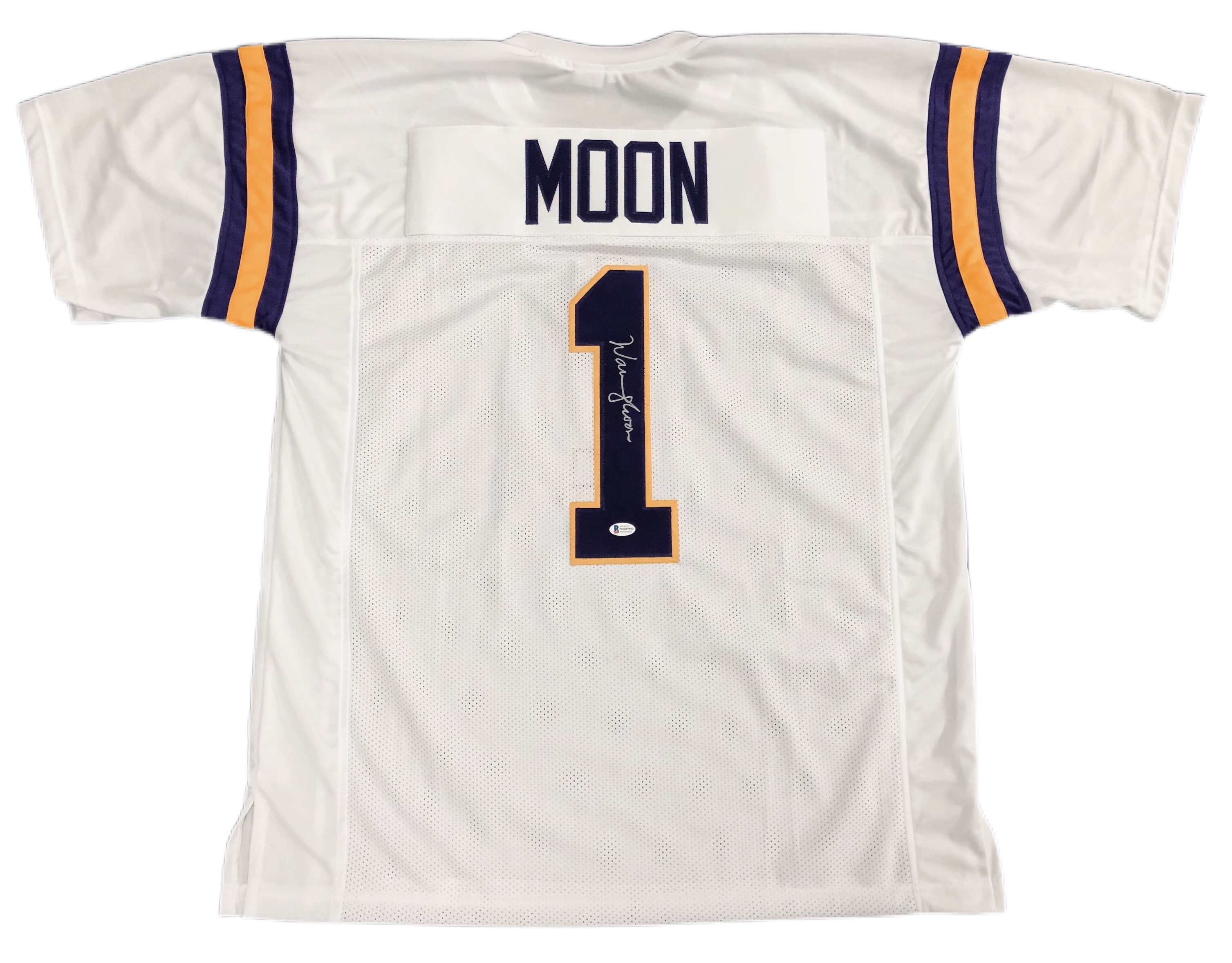 Custom on-field style jersey. Everything is sewn on, size XL. Has been hand-signed in silver paint pen by Warren Moon (HOF).