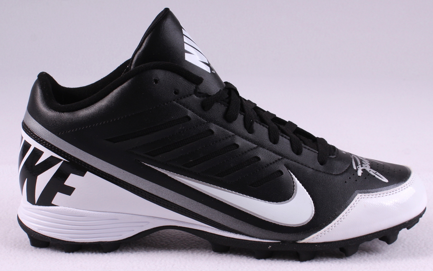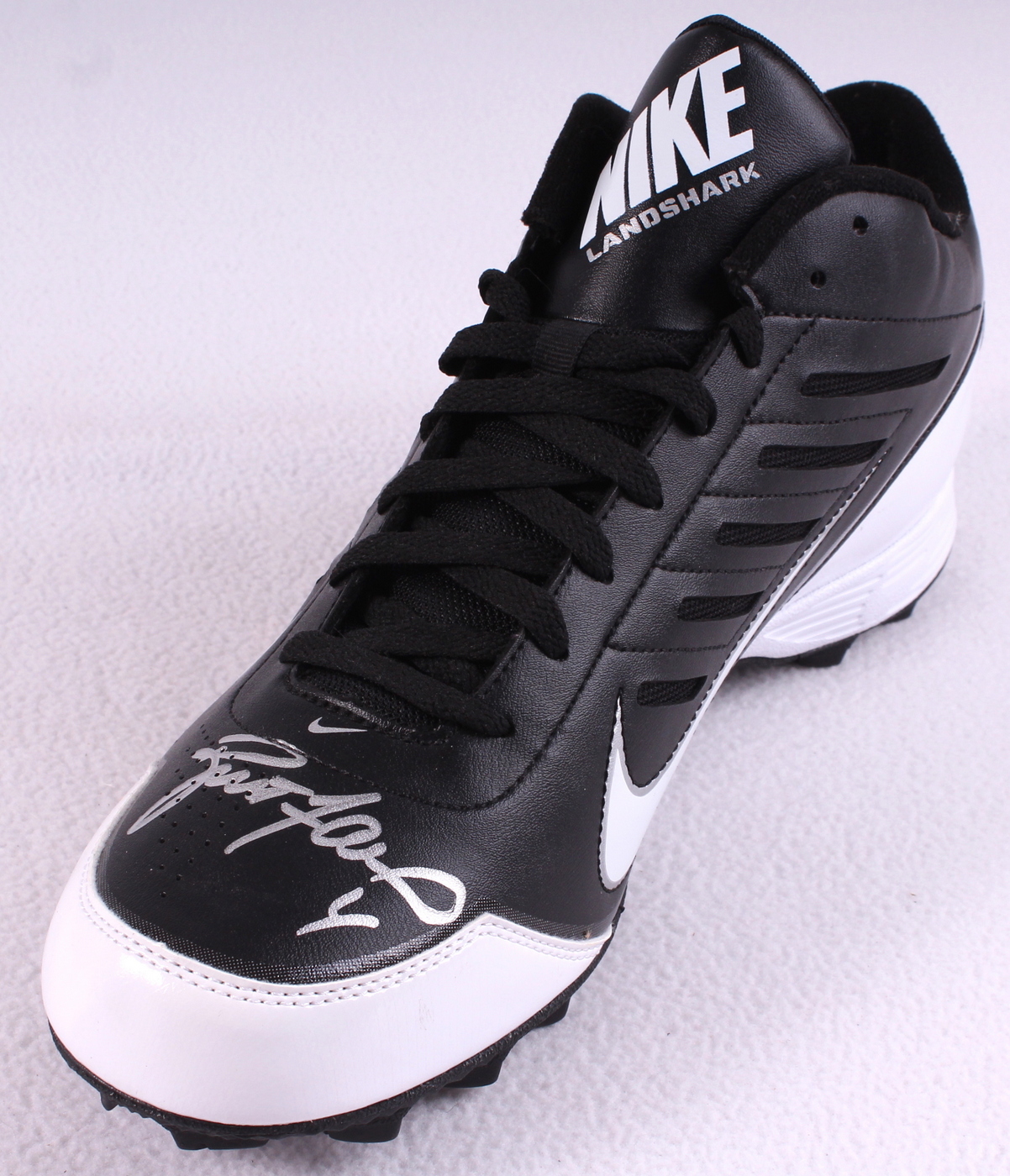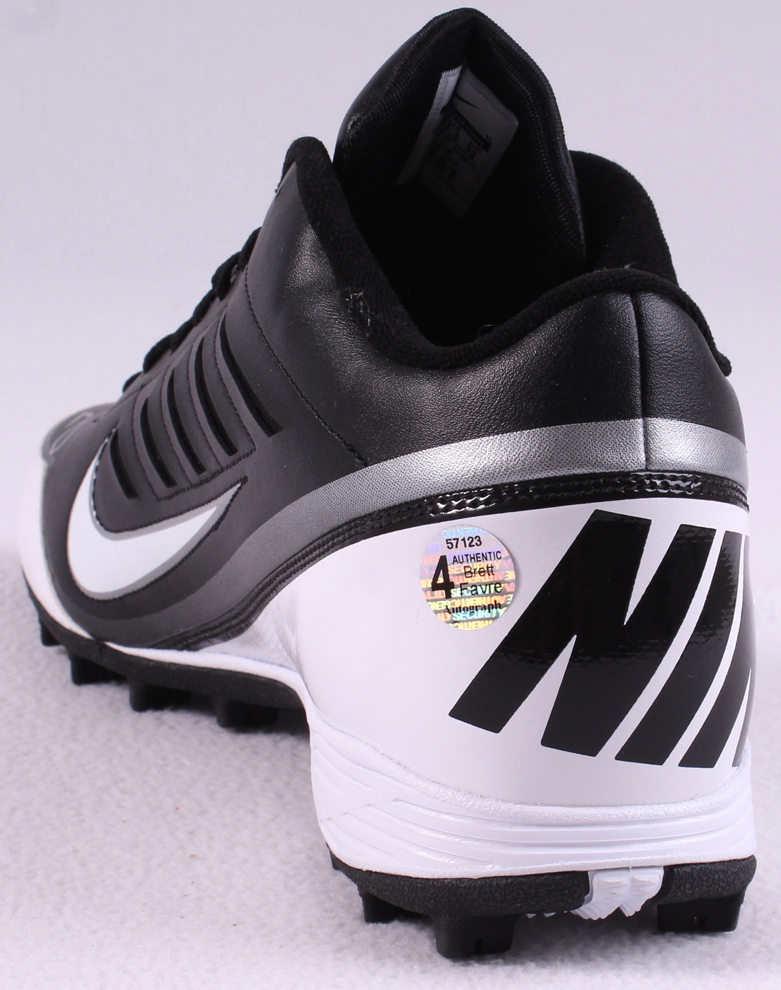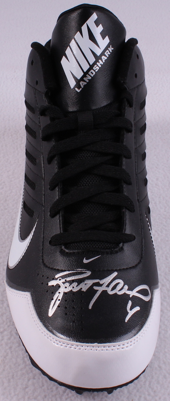 Nike Cleat, Size 14 (New / Unused). Hand-signed in silver paint pen by Brett Favre (Packers). The autograph includes an official Brett Favre hologram and matching COA for authenticity purposes.